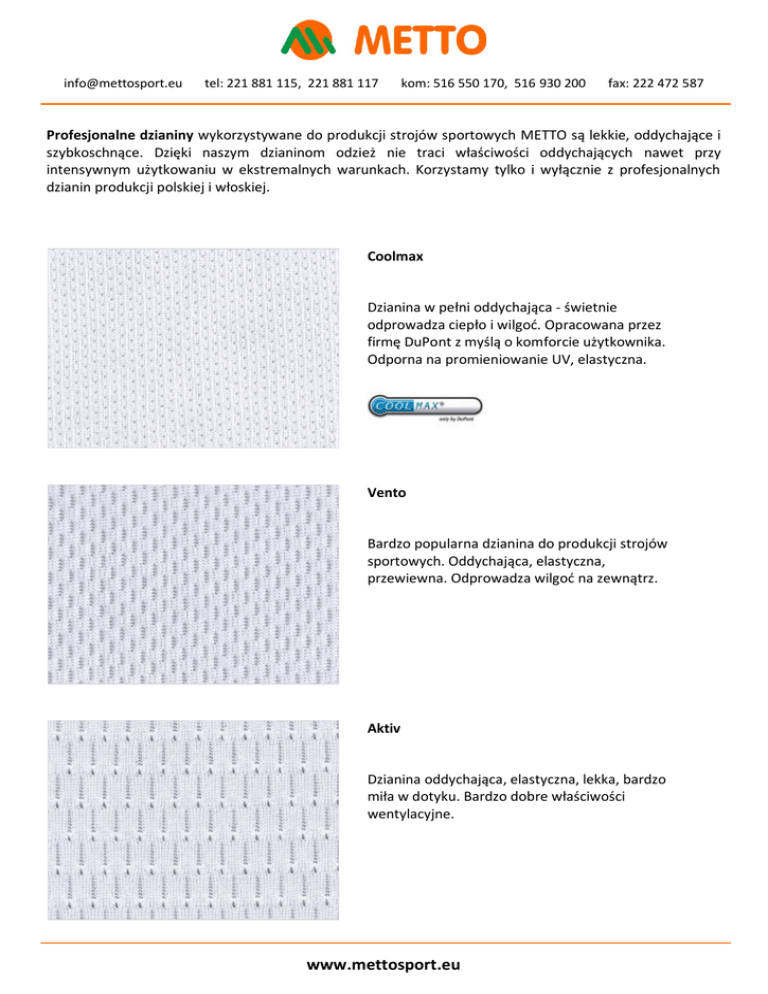 [email protected] tel: 221 881 115, 221 881 117 kom: 516 550 170, 516 930 200 fax: 222 472 587 Profesjonalne dzianiny wykorzystywane do produkcji strojów sportowych METTO są lekkie, oddychające i szybkoschnące. Dzięki naszym dzianinom odzież nie traci właściwości oddychających nawet przy intensywnym użytkowaniu w ekstremalnych warunkach. Korzystamy tylko i wyłącznie z profesjonalnych dzianin produkcji polskiej i włoskiej. Coolmax Dzianina w pełni oddychająca - świetnie odprowadza ciepło i wilgoć. Opracowana przez firmę DuPont z myślą o komforcie użytkownika. Odporna na promieniowanie UV, elastyczna. Vento Bardzo popularna dzianina do produkcji strojów sportowych. Oddychająca, elastyczna, przewiewna. Odprowadza wilgoć na zewnątrz. Aktiv Dzianina oddychająca, elastyczna, lekka, bardzo miła w dotyku. Bardzo dobre właściwości wentylacyjne. www.mettosport.eu [email protected] tel: 221 881 115, 221 881 117 kom: 516 550 170, 516 930 200 fax: 222 472 587 Mikrovento Oddychająca miękka dzianina o drobnym splocie. Daje komfortowe uczucie nawet przy długotrwałym użytkowaniu. Sportivo Dzianina poliestrowa zbudowana z mikrowłókien o dość jednolitej fakturze Ukłucie szpilki Dzianina lekko prześwitująca, oddychająca, stosowana najczęściej do strojów koszykarskich dwustronnych. www.mettosport.eu