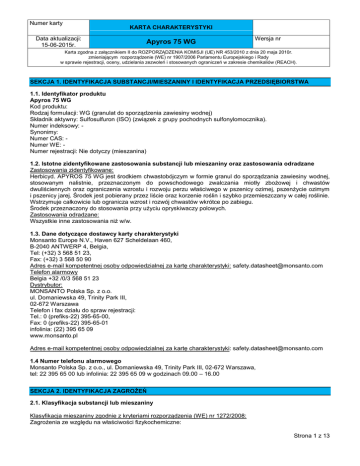 Numer karty Data aktualizacji: 15-06-2015r. KARTA CHARAKTERYSTYKI Apyros 75 WG Wersja nr Karta zgodna z załącznikiem II do ROZPORZĄDZENIA KOMISJI (UE) NR 453/2010 z dnia 20 maja 2010r. zmieniającym rozporządzenie (WE) nr 1907/2006 Parlamentu Europejskiego i Rady w sprawie rejestracji, oceny, udzielania zezwoleń i stosowanych ograniczeń w zakresie chemikaliów (REACH). SEKCJA 1. IDENTYFIKACJA SUBSTANCJI/MIESZANINY I IDENTYFIKACJA PRZEDSIĘBIORSTWA 1.1. Identyfikator produktu Apyros 75 WG Kod produktu: Rodzaj formulacji: WG (granulat do sporządzenia zawiesiny wodnej) Składnik aktywny: Sulfosulfuron (ISO) (związek z grupy pochodnych sulfonylomocznika). Numer indeksowy: Synonimy: Numer CAS: Numer WE: Numer rejestracji: Nie dotyczy (mieszanina) 1.2. Istotne zidentyfikowane zastosowania substancji lub mieszaniny oraz zastosowania odradzane Zastosowania zidentyfikowane: Herbicyd. APYROS 75 WG jest środkiem chwastobójczym w formie granul do sporządzania zawiesiny wodnej, stosowanym nalistnie, przeznaczonym do powschodowego zwalczania miotły zbożowej i chwastów dwuliściennych oraz ograniczenia wzrostu i rozwoju perzu właściwego w pszenicy ozimej, pszenżycie ozimym i pszenicy jarej. Środek jest pobierany przez liście oraz korzenie roślin i szybko przemieszczany w całej roślinie. Wstrzymuje całkowicie lub ogranicza wzrost i rozwój chwastów wkrótce po zabiegu. Środek przeznaczony do stosowania przy użyciu opryskiwaczy polowych. Zastosowania odradzane: Wszystkie inne zastosowania niż w/w. 1.3. Dane dotyczące dostawcy karty charakterystyki Monsanto Europe N.V., Haven 627 Scheldelaan 460, B-2040 ANTWERP 4, Belgia, Tel: (+32) 3 568 51 23, Fax: (+32) 3 568 50 90 Adres e-mail kompetentnej osoby odpowiedzialnej za kartę charakterystyki: [email protected] Telefon alarmowy Belgia +32 /0/3 568 51 23 Dystrybutor: MONSANTO Polska Sp. z o.o. ul. Domaniewska 49, Trinity Park III, 02-672 Warszawa Telefon i fax działu do spraw rejestracji: Tel.: 0 (prefiks-22) 395-65-00, Fax: 0 (prefiks-22) 395-65-01 infolinia: (22) 395 65 09 www.monsanto.pl Adres e-mail kompetentnej osoby odpowiedzialnej za kartę charakterystyki: [email protected] 1.4 Numer telefonu alarmowego Monsanto Polska Sp. z o.o., ul. Domaniewska 49, Trinity Park III, 02-672 Warszawa, tel: 22 395 65 00 lub infolinia: 22 395 65 09 w godzinach 09.00 – 16.00 SEKCJA 2. IDENTYFIKACJA ZAGROŻEŃ 2.1. Klasyfikacja substancji lub mieszaniny Klasyfikacja mieszaniny zgodnie z kryteriami rozporządzenia (WE) nr 1272/2008: Zagrożenia ze względu na właściwości fizykochemiczne: Strona 1 z 13 Numer karty KARTA CHARAKTERYSTYKI Data aktualizacji: 15-06-2015r. Apyros 75 WG Wersja nr Karta zgodna z załącznikiem II do ROZPORZĄDZENIA KOMISJI (UE) NR 453/2010 z dnia 20 maja 2010r. zmieniającym rozporządzenie (WE) nr 1907/2006 Parlamentu Europejskiego i Rady w sprawie rejestracji, oceny, udzielania zezwoleń i stosowanych ograniczeń w zakresie chemikaliów (REACH). Nie dotyczy. Zagrożenia dla zdrowia. Nie dotyczy. Zagrożenia dla środowiska: Aquatic Acut1; H400 Aquatic Chronic 1; H410 Uwaga 2.2. Elementy oznakowania wg rozporządzenia 1272/2008/WE: Aquatic Chronic 1 M=100 Uwaga W przypadku oznakowania zgodnego z aktualną klasyfikacją producenta nie zamieszcza się znaku ostrzegawczego. Zwroty wskazujące rodzaj zagrożenia (zwroty H): H410 - Działa bardzo toksycznie na organizmy wodne, powodując długotrwałe skutki. EUH401 - W celu uniknięcia zagrożeń dla zdrowia ludzi i środowiska, należy postępować zgodnie z instrukcją użycia. Zwroty wskazujący środki ostrożności (zwroty P): P260 - Nie wdychać pyłu/rozpylonej cieczy. P270 - Nie jeść, nie pić i nie palić podczas używania produktu. P280 - Stosować rękawice ochronne/odzież ochronną. P391 - Zebrać wyciek. Dodatkowe zwroty wskazujące środki ostrożności, zgodnie z Rozporządzeniem Komisji (WE) nr 547/20011 z dnia 8 czerwca 2011 r., Załącznik III w sprawie wykonania rozporządzenia (WE) nr 1107/2009 Parlamentu Europejskiego i Rady w odniesieniu do wymogów w zakresie etykietowania środków ochrony roślin. SP1: Nie zanieczyszczać wód produktem lub jego opakowaniem (Nie myć aparatury w pobliżu wód powierzchniowych/Unikać zanieczyszczania wód poprzez rowy odwadniające z gospodarstw i dróg). 2.3. Inne zagrożenia Rezultaty oceny PBT i vPvB – Składniki czynne produktu nie są substancjami spełniającymi kryteria PBT lub vPvB, określone w Załączniku XIII rozporządzenia (WE) nr 1907/2006. SEKCJA 3. SKŁAD I INFORMACJA O SKŁADNIKACH 3.1. Substancje Nie dotyczy. Produkt nie jest substancją. 3.2. Mieszaniny Produkt jest mieszaniną poniższych składników. W sekcji 16 podano znaczenie zwrotów H. Strona 2 z 13 Numer karty KARTA CHARAKTERYSTYKI Data aktualizacji: 15-06-2015r. Wersja nr Apyros 75 WG Karta zgodna z załącznikiem II do ROZPORZĄDZENIA KOMISJI (UE) NR 453/2010 z dnia 20 maja 2010r. zmieniającym rozporządzenie (WE) nr 1907/2006 Parlamentu Europejskiego i Rady w sprawie rejestracji, oceny, udzielania zezwoleń i stosowanych ograniczeń w zakresie chemikaliów (REACH). Nazwa Zawartość CAS WE Nr indeksowy Sulfosulfuron (ISO); (1(4,6-dimetoksypirymidyn2-ylo)-3-(2etylosulfonyloimidazo[1,2a]pirydin-3-ylo) sulfonylomocznik 750 g/kg (75% wag.) 141776-321 604-251-2 616-109-7 02-211955842044-0000 16% wag. producent nie ujawnił - - - Nie sklasyfikowany jako niebezpieczny 9% wag. producent nie ujawnił - - - Nie sklasyfikowany jako niebezpieczny Nośnik obojętny Dodatek mniejszościowy do formulacji Nr.rejestracji Klasyfikacja 1272/2008 Aquatic Acute 1; H400 Aquatic Chronic 1; H410 M=100 Klasyfikacja producenta SEKCJA 4. ŚRODKI PIERWSZEJ POMOCY 4.1. Opis środków pierwszej pomocy Wdychanie Kontakt ze skórą Kontakt z oczami Połknięcie Przenieść poszkodowanego na świeże powietrze i zapewnić ciepło i odpoczynek w pozycji umożliwiającej oddychanie. W przypadku zatrzymania oddechu zastosować sztuczne oddychanie i niezwło