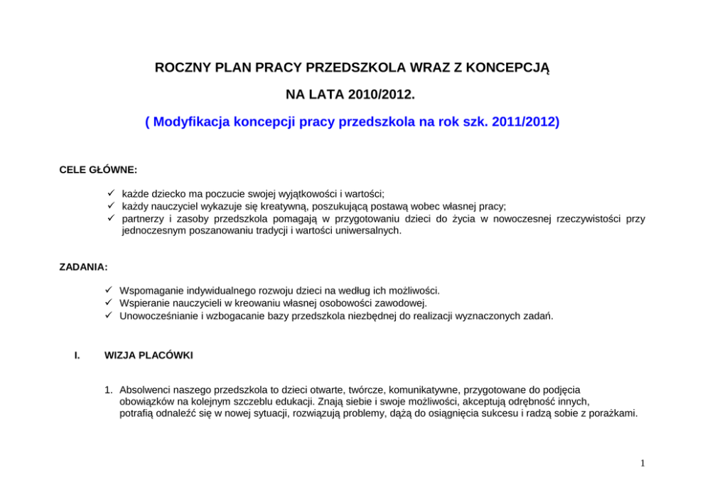 ROCZNY PLAN PRACY PRZEDSZKOLA WRAZ Z KONCEPCJĄ NA LATA 2010/2012. ( Modyfikacja koncepcji pracy przedszkola na rok szk. 2011/2012) CELE GŁÓWNE: każde dziecko ma poczucie swojej wyjątkowości i wartości; każdy nauczyciel wykazuje się kreatywną, poszukującą postawą wobec własnej pracy; partnerzy i zasoby przedszkola pomagają w przygotowaniu dzieci do życia w nowoczesnej rzeczywistości przy jednoczesnym poszanowaniu tradycji i wartości uniwersalnych. ZADANIA: Wspomaganie indywidualnego rozwoju dzieci na według ich możliwości. Wspieranie nauczycieli w kreowaniu własnej osobowości zawodowej. Unowocześnianie i wzbogacanie bazy przedszkola niezbędnej do realizacji wyznaczonych zadań. I. WIZJA PLACÓWKI 1. Absolwenci naszego przedszkola to dzieci otwarte, twórcze, komunikatywne, przygotowane do podjęcia obowiązków na kolejnym szczeblu edukacji. Znają siebie i swoje możliwości, akceptują odrębność innych, potrafią odnaleźć się w nowej sytuacji, rozwiązują problemy, dążą do osiągnięcia sukcesu i radzą sobie z porażkami. 1 2. Zajęcia wychowawczo - dydaktyczne dostosowane są do możliwości rozwojowych dzieci i prowadzone są na wysokim poziomie. Dzieci mają stworzone warunki do twórczego działania, przyswajają ważne umiejętności przydatne w życiu dorosłego człowieka. 3. Przedszkole zapewnia opiekę, wychowanie w atmosferze akceptacji i bezpieczeństwa. Dzieci mają możliwość samorealizacji i aktywnego odkrywania swoich możliwości. Dzięki pracy nauczycieli, personelu placówki, nauczycieli zajęć dodatkowych rozwijają swoje zainteresowania wzbogacając wiedze o otaczającym świecie. 4. Wychowankowie mają w nauczycielach wsparcie, a ci każdemu dziecku zapewniają podmiotowe traktowanie, są ich partnerami, stoją obok, pozwalają na ujawnianie dziecięcych pomysłów, zachęcając je jednocześnie do pełnej ich realizacji. Pedagodzy w naszym przedszkolu współpracują ze sobą i dzielą się zdobytą wiedzą. Pogodna atmosfera w przedszkolu i życzliwi nauczyciele umiejętnie otaczają opieką wszystkie dzieci. 5. Nauczycielki znają potrzeby i zainteresowania dzieci oraz posiadają umiejętności atrakcyjnego prowadzenia zajęć. Konstruują ciekawe i bogate oferty zabaw i zadań, są dobrze przygotowane merytorycznie i metodycznie. Poszukują innowacyjnych rozwiązań, mają wysokie kwalifikacje i ciągle doskonalą swoje umiejętności. 6. Przedszkole ściśle współpracuje z rodzicami, uwzględnia ich potrzeby i oczekiwania. Angażuje do pracy na rzecz przedszkola. Wszyscy pracownicy naszej placówki współdziałają ze sobą tworząc przyjazną atmosferę, w której dzieci czują się akceptowane i bezpieczne. 7. Nasze przedszkole jest przyjazne dzieciom. Ciągle doskonalimy swoja bazę lokalową. Pracujemy nad wyposażeniem naszej placówki w nowy sprzęt, nowe meble, pomoce dydaktyczne i piękne zabawki. Nasza plac zabaw zaspakaja potrzeby ruchowe dzieci na świeżym powietrzu i zachęca do zabawy. 8. Dzięki skutecznej promocji nasze przedszkole ma dobrą opinie w środowisku lokalnym. Estetyka pomieszczeń i otoczenia oraz działania dydaktyczno-wychowawcze wpływają na wysoka ocenę przedszkola. Przedszkole jest zarządzane w sposób sprawny i nowoczesny, a pracownicy mają satysfakcje ze swojej pracy. 2 II. MODEL ABSOLWENTA Ciekawy świata, samodzielny, zaradny, co oznacza, że: • • • • często zadaje pytania chcąc zaspokoić swą ciekawość, przejawia aktywność podejmując różne samodzielne zadania, osiągnął optymalny dla swego potencjału rozwojowego poziom wiedzy, umiejętności, sprawności. Rozważny, odpowiedzialny, co oznacza, że: • • • • • • dba o swe zdrowie, higienę osobistą, wygląd, stara się respektować własne prawa i obowiązki w grupie i w rodzinie, pamięta, że jego prawa kończą się tam, gdzie zaczynają się prawa innych osób, zdaje sobie sprawę z konsekwencji różnych, zachowań własnych i innych osób. Uczciwy, prawdomówny, co oznacza, że: • • szanuje własność swoją i cudzą, nie kłamie. Grzeczny, szanujący innych, co oznacza, że: • • zna i stosuje obowiązujące normy kulturalnego zachowania, nie używa brzydkich słów szanuje innych ludzi, ich odmienność /np. niepełnosprawność/ 3 KOMPETENCJE ABSOLWENTÓW PRZEDSZKOLA W ZAKRESIE GOTOWOŚCI SZKOLNEJ Dojrzałość społeczna: • dobry poziom adaptacji; • zdolność do nawiązywania prawidłowych relacji społecznych; • samodzielność i aktywność; • przestrzeganie norm współżycia, koleżeńskość. Odporność emocjonalna: • zdolność do obdarzania uwagą i porozumiewania się w zrozumiały sposób /słuchają i wypowiadają się w różnych sytuacjach; • umiejętność pokonywania trudności; • umiejętność znoszenia porażek i korygowania swego zachowania; • podejmowanie zadań na swoją miarę i realizowanie ich do końca. Motywacja do nauki: • rozbudzenie poznawcze, chęć do podjęcia nauki; • zdolność odczuwania satysfakcji z samodzielnego wykonania zadań oraz z własnych osiągnięć; • posiadanie wyobrażenia na temat obowiązków wynikających z roli ucznia. Opanowanie kluczowych umiejętności i sprawności decydujących o gotowości szkolnej dzieci w zakresie: • autoprezentacji własnej osoby i umiejętności; • swobodnego wypowiadania się; • analizy i syntezy wyrazów; • percepcji wzrokowej; • interesowania się czytaniem i pisaniem: gotowość do nauki; • czytania i pisania; • sprawnego liczenia; • wykonywania prostych działań matematycznych; • sprawności graficznej i ruchowej. 4 III. KONCEPCJA PRACY PRZEDSZKOLA: Podejmując kolejne działania zmierzające ku systematycznemu rozwojowi placówki, chcemy utrzymać następujące kierunki działań: 1. 2. 3. 4. 5. 6. Lp . I. Opracowanie i wdrożenie systemu pomocy psychologiczno-pedagogicznej w przedszkolu. Uświadomienie rodzicom konieczności wspólnego zarządzania pr