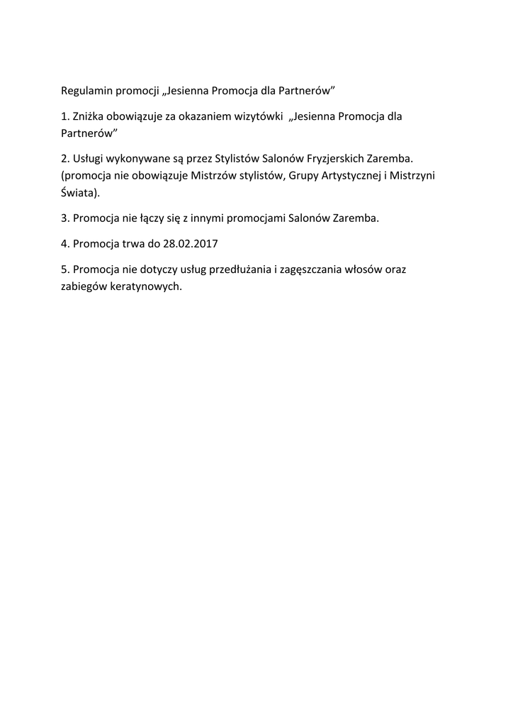 Regulamin promocji „Jesienna Promocja dla Partnerów” 1. Zniżka obowiązuje za okazaniem wizytówki „Jesienna Promocja dla Partnerów” 2. Usługi wykonywane są przez Stylistów Salonów Fryzjerskich Zaremba. (promocja nie obowiązuje Mistrzów stylistów, Grupy Artystycznej i Mistrzyni Świata). 3. Promocja nie łączy się z innymi promocjami Salonów Zaremba. 4. Promocja trwa do 28.02.2017 5. Promocja nie dotyczy usług przedłużania i zagęszczania włosów oraz zabiegów keratynowych.