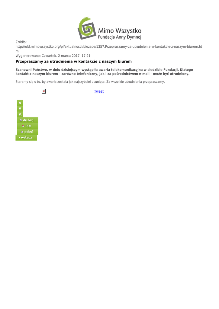 Źródło: http://old.mimowszystko.org/pl/aktualnosci/biezace/1357,Przepraszamy-za-utrudnienia-w-kontakcie-z-naszym-biurem.ht ml Wygenerowano: Czwartek, 2 marca 2017, 17:21 Przepraszamy za utrudnienia w kontakcie z naszym biurem Szanowni Państwo, w dniu dzisiejszym wystąpiła awaria telekomunikacyjna w siedzibie Fundacji. Dlatego kontakt z naszym biurem – zarówno telefoniczny, jak i za pośrednictwem e-mail – może być utrudniony. Staramy się o to, by awaria została jak najszybciej usunięta. Za wszelkie utrudnienia przepraszamy. Tweet
