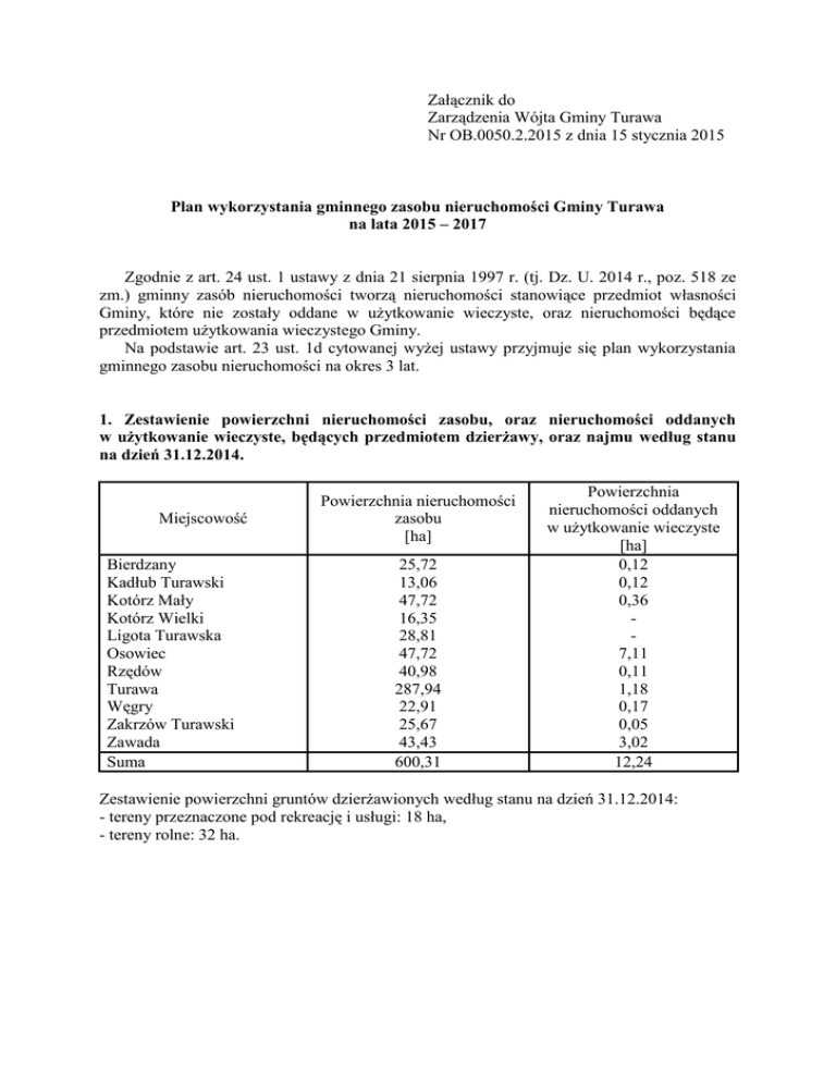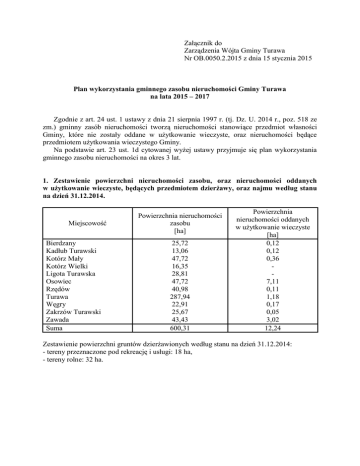 Załącznik do Zarządzenia Wójta Gminy Turawa Nr OB.0050.2.2015 z dnia 15 stycznia 2015 Plan wykorzystania gminnego zasobu nieruchomości Gminy Turawa na lata 2015 – 2017 Zgodnie z art. 24 ust. 1 ustawy z dnia 21 sierpnia 1997 r. (tj. Dz. U. 2014 r., poz. 518 ze zm.) gminny zasób nieruchomości tworzą nieruchomości stanowiące przedmiot własności Gminy, które nie zostały oddane w użytkowanie wieczyste, oraz nieruchomości będące przedmiotem użytkowania wieczystego Gminy. Na podstawie art. 23 ust. 1d cytowanej wyżej ustawy przyjmuje się plan wykorzystania gminnego zasobu nieruchomości na okres 3 lat. 1. Zestawienie powierzchni nieruchomości zasobu, oraz nieruchomości oddanych w użytkowanie wieczyste, będących przedmiotem dzierżawy, oraz najmu według stanu na dzień 31.12.2014. Miejscowość Bierdzany Kadłub Turawski Kotórz Mały Kotórz Wielki Ligota Turawska Osowiec Rzędów Turawa Węgry Zakrzów Turawski Zawada Suma Powierzchnia nieruchomości zasobu [ha] 25,72 13,06 47,72 16,35 28,81 47,72 40,98 287,94 22,91 25,67 43,43 600,31 Powierzchnia nieruchomości oddanych w użytkowanie wieczyste [ha] 0,12 0,12 0,36 7,11 0,11 1,18 0,17 0,05 3,02 12,24 Zestawienie powierzchni gruntów dzierżawionych według stanu na dzień 31.12.2014: - tereny przeznaczone pod rekreację i usługi: 18 ha, - tereny rolne: 32 ha. Wykaz lokali oddanych w najem w rozbiciu na poszczególne miejscowości: Liczba lokali Miejscowość mieszkania mieszkania socjalne lokale użytkowe komunalne Bierdzany 1 7 1 Kadłub Turawski 2 0 2 Kotórz Mały 0 1 3 Osowiec 2 1 2 Rzędów 1 0 1 Turawa 1 2 4 Węgry 2 0 1 Zakrzów Turawski 1 3 2 Zawada 1 2 0 Łączna liczba: 11 16 16 2. Prognoza a) dotycząca udostępniania nieruchomości zasobu, oraz nabywania nieruchomości do zasobu W latach 2015 - 2017 planowana jest sprzedaż nieruchomości zgodnie z założeniami budżetowymi. Ponadto realizowane będą wnioski o sprzedaż nieruchomości będących przedmiotem dzierżawy. Planowana jest sprzedaż terenu inwestycyjnego obejmującego Jezioro Małe wraz z terenem przyległym o łącznej powierzchni 11,06 ha. Powierzchnia terenów dzierżawionych w latach 2015 – 2017 może ulec zmniejszeniu w stosunku do lat poprzednich ze względu na sprzedaż dzierżawionych nieruchomości. Gospodarka mieszkaniowa prowadzona będzie z wykorzystaniem wszystkich lokali; w przypadku zwolnienia mieszkania jego przydział odbywać się będzie wg listy oczekujących na mieszkanie. Lokale użytkowe najmowane będą zgodnie z ich przeznaczeniem, oddawane w najem w zależności od zainteresowania. Nabywanie nieruchomości odbywać się będzie w związku z koniecznością realizacji zadań własnych Gminy w tym budowę dróg zgodnie z zapisami miejscowych planów zagospodarowania przestrzennego. b) dotycząca poziomu wydatków związanych z udostępnieniem nieruchomości zasobu, oraz nabywaniem nieruchomości do zasobu. Poziom wydatków związanych z udostępnianiem nieruchomości zasobu, oraz nabywaniem nieruchomości przez Gminę stanowić będą głównie koszty wyceny nieruchomości, oraz koszty obsługi geodezyjnej, a także koszty publikacji w prasie ogłoszeń dotyczących sprzedaży nieruchomości, ich wydzierżawiania i najmu. Koszty te uzależnione są w znacznym stopniu od cen usług ustalonych w zapytaniu ofertowym. Kolejna grupa wydatków to koszty notarialne i sądowe związane z nabywaniem nieruchomości, uzależnione od ilości nabywanych działek. Pozostałe koszty to wydatki związanie z bieżącą konserwacją lokali mieszkaniowych i usługowych zgodnie z potrzebami. c) dotycząca wpływów osiągniętych z opłat z tytułu użytkowania wieczystego, dzierżawy i najmu Wpływy osiągnięte w roku 2014 z opłat z tytułu użytkowania wieczystego nieruchomości Gminy Turawa oddanych w użytkowanie wieczyste szacowały się na poziomie 36 tys. Wpływ z dzierżawy terenów przeznaczonych pod rekreację i usługi - 246,5 tys. zł, natomiast z dzierżawy terenów rolnych - 7,4 tys. zł. Powierzchnia terenów rekreacyjnych i usługowych oddanych w dzierżawę w kolejnych latach ze względu na realizację wniosków o sprzedaż dzierżawionych działek ulegać będzie zmniejszeniu, natomiast szacuje się zwiększenie wpływów z tego tytułu w latach 2015 -2017 ze względu na coroczne aktualizowanie stawek dzierżawy. Powierzchnia dzierżawy terenów rolnych, oraz przychód z dzierżawy kształtować się będzie na poziomie z lat poprzednich. d) dotycząca aktualizacji opłat z tytułu użytkowania wieczystego nieruchomości Planowana jest aktualizacja opłat z tytułu użytkowania wieczystego w latach 2015 - 2017, co wpłynie na zwiększenie wpływów z tego tytułu. Szacowane jest natomiast zmniejszenie ilości nieruchomości oddanych w użytkowanie wieczyste ze względu na realizację wniosków o przekształcenie prawa użytkowania wieczystego nieruchomości w prawo własności. 3. Program zagospodarowania nieruchomości zasobu. Program zagospodarowania nieruchomości gminnego zasobu na lata 2015 – 2017 zakłada kontynuację dotychczasowych umów dzierżawy terenu, oraz najmu lokali. Planowane jest pozyskiwanie drewna z terenów leśnych, oraz odnawianie powierzchni zrębowych zgodnie z planem urządzania lasu i prawidłową gospodarką leśną. Kontynuowana będzie sprzedaż nieruchomości zgodnie z corocznymi założeniami budżetowymi, oraz realizacja wniosków o sprzedaż dzierżawionych terenów. Realizowane będą wnioski o przekształcenie prawa użytkowania wieczystego w prawo własności nieruchomości. Wójt Gminy Turawa Waldemar Kampa