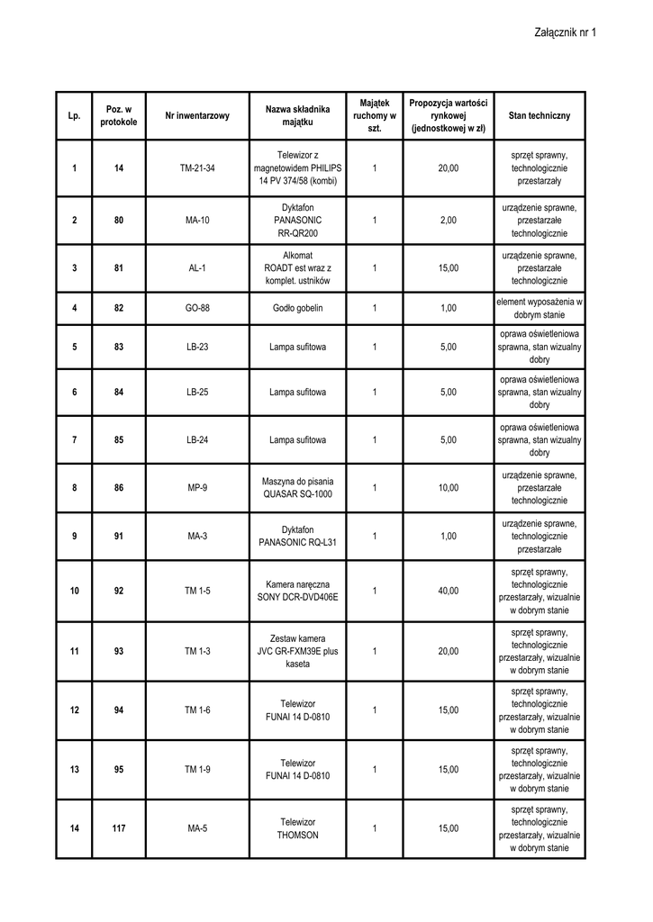 Załącznik nr 1 Lp. Poz. w protokole Nr inwentarzowy Nazwa składnika majątku Majątek ruchomy w szt. Propozycja wartości rynkowej (jednostkowej w zł) Stan techniczny 1 14 TM-21-34 Telewizor z magnetowidem PHILIPS 14 PV 374/58 (kombi) 1 20,00 sprzęt sprawny, technologicznie przestarzały 2 80 MA-10 Dyktafon PANASONIC RR-QR200 1 2,00 urządzenie sprawne, przestarzałe technologicznie 3 81 AL-1 Alkomat ROADT est wraz z komplet. ustników 1 15,00 urządzenie sprawne, przestarzałe technologicznie 4 82 GO-88 Godło gobelin 1 1,00 element wyposażenia w dobrym stanie 5 83 LB-23 Lampa sufitowa 1 5,00 oprawa oświetleniowa sprawna, stan wizualny dobry 6 84 LB-25 Lampa sufitowa 1 5,00 oprawa oświetleniowa sprawna, stan wizualny dobry 7 85 LB-24 Lampa sufitowa 1 5,00 oprawa oświetleniowa sprawna, stan wizualny dobry 8 86 MP-9 Maszyna do pisania QUASAR SQ-1000 1 10,00 urządzenie sprawne, przestarzałe technologicznie 9 91 MA-3 Dyktafon PANASONIC RQ-L31 1 1,00 urządzenie sprawne, technologicznie przestarzałe TM 1-5 Kamera naręczna SONY DCR-DVD406E 40,00 sprzęt sprawny, technologicznie przestarzały, wizualnie w dobrym stanie TM 1-3 Zestaw kamera JVC GR-FXM39E plus kaseta 20,00 sprzęt sprawny, technologicznie przestarzały, wizualnie w dobrym stanie TM 1-6 Telewizor FUNAI 14 D-0810 15,00 sprzęt sprawny, technologicznie przestarzały, wizualnie w dobrym stanie TM 1-9 Telewizor FUNAI 14 D-0810 15,00 sprzęt sprawny, technologicznie przestarzały, wizualnie w dobrym stanie MA-5 Telewizor THOMSON 15,00 sprzęt sprawny, technologicznie przestarzały, wizualnie w dobrym stanie 10 11 12 13 14 92 93 94 95 117 1 1 1 1 1 Załącznik nr 1 15 118 TM-1-1 Telewizor THOMSON 15,00 sprzęt sprawny, technologicznie przestarzały, wizualnie w dobrym stanie 1 15,00 sprzęt sprawny, technologicznie przestarzały, wizualnie w dobrym stanie 1 16 135 TM-1-1 Telewizor THOMSON 21” 17 136 TM-1-3 Antena telewizyjna naziemna analogowa 1 1,00 urządzenie sprawne, technologiczne przestarzałe 18 137 TM-1-2 Magnetowid THOMSON VP4780 1 10,00 sprzęt sprawny, technologicznie przestarzały 19 138 FX-1 Telefax PANASONIC PANAFAX UF-S10 1 10,00 urządzenie sprawne, przestarzałe technologicznie 1 5,00 urządzenie sprawne, niekompletne, brak naczynia szklanego do zaparzania kawy 20 141 EX-1 Ekspres do kawy BOSCH TKA 141N 21 143 DY-1 Dywan o wym. 1,9x2,8 1 5,00 element wyposażenia zabrudzony 22 144 DY-1 Dywan o wym. 1,9x2,8 1 5,00 element wyposażenia zabrudzony 23 145 DY-1 Dywan o wym. 1,9x2,8 1 5,00 element wyposażenia zabrudzony 24 146 DY-3 Dywan o wym. 2,7x3,6 1 5,00 element wyposażenia zabrudzony 25 147 DY-4 Dywan 1 5,00 element wyposażenia zabrudzony 26 148 DY-5 Dywan 1 5,00 element wyposażenia zabrudzony 27 149 DY-8 Dywan o wym. 2,3x3,2 1 5,00 element wyposażenia zabrudzony 28 152 MP-7 Maszyna do pisania QUASAR SQ-1000 1 10,00 urządzenie sprawne, technologiczne przestarzałe 29 207 LB-19 Lampa IKEA 1 5,00 oprawa oświetleniowa sprawna, stan wizualny dobry 30 208 LB-21 Lampa M-1 TEMAR 1 5,00 oprawa oświetleniowa sprawna, stan wizualny dobry 31 209 MA-3 Dyktafon SONY TCM-323 1 2,00 urządzenie sprawne, przestarzałe technologicznie 32 210 MA-4 Dyktafon PANASONIC RQ-L31X 1 3,00 urządzenie sprawne, przestarzałe technologicznie