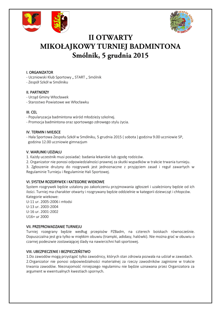 I. ORGANIZATOR - Uczniowski Klub Sportowy „ START „ Smólnik - Zespół Szkół w Smólniku II. PARTNERZY - Urząd Gminy Włocławek - Starostwo Powiatowe we Włocławku III. CEL - Popularyzacja badmintona wśród młodzieży szkolnej. - Promocja badmintona oraz sportowego zdrowego stylu życia. IV. TERMIN I MIEJSCE - Hala Sportowa Zespołu Szkół w Smólniku, 5 grudnia 2015 ( sobota ) godzina 9.00 uczniowie SP, godzina 12.00 uczniowie gimnazjum V. WARUNKI UDZIAŁU 1. Każdy uczestnik musi posiadać: badania lekarskie lub zgodę rodziców. 2. Organizator nie ponosi odpowiedzialności prawnej za skutki wypadków w trakcie trwania turnieju. 3. Zgłoszenie drużyny do rozgrywek jest jednoznaczne z przyjęciem zasad i reguł zawartych w Regulaminie Turnieju i Regulaminie Hali Sportowej. VI. SYSTEM ROZGRYWEK I KATEGORIE WIEKOWE System rozgrywek będzie ustalony po zakończeniu przyjmowania zgłoszeń i uzależniony będzie od ich ilości. Turniej ma charakter otwarty i rozgrywany będzie oddzielnie w kategorii dziewcząt i chłopców. Kategorie wiekowe: U-11 ur. 2005-2006 i młodsi U-13 ur. 2003-2004 U-16 ur. 2001-2002 U16+ ur 2000 VII. PRZEPROWADZANIE TURNIEJU Turniej rozegrany będzie według przepisów PZBadm, na czterech boiskach równocześnie. Dopuszczalna jest gra tylko w miękkim obuwiu (trampki, adidasy, halówki). Nie można grać w obuwiu o czarnej podeszwie zostawiającej ślady na nawierzchni hali sportowej. VIII. UBEZPIECZENIE I BEZPIECZEŃSTWO 1.Do zawodów mogą przystąpić tylko zawodnicy, których stan zdrowia pozwala na udział w zawodach. 2.Organizator nie ponosi odpowiedzialności materialnej za rzeczy zawodników zaginione w trakcie trwania zawodów. Nieznajomość niniejszego regulaminu nie będzie uznawana przez Organizatora za argument w ewentualnych kwestiach spornych. IX. UWAGI KOŃCOWE 1.W trakcie trwania rozgrywek obowiązuje zasada „fair-play”. 2.Sędziów powołuje Organizator. 3.Wszelkie sprawy sporne, nie objęte powyższym regulaminem rozstrzyga Organizator wraz z Sędzią. 4.Udział w zawodach jest równoważny z akceptacją regulaminu zawodów oraz wyrażeniem zgody na przetwarzanie swoich danych osobowych (ustawa z 29.08.1997 r o ochronie danych osobowych Dz. U. Nr 133 z 1997) przez organizatora w celach związanych z zawodami. 5.W trakcie zawodów będą wykonywane zdjęcia uczestnikom zawodów, które będą publikowane na stronie internetowej www.facebook.com/gimsmolnik, www.facebook.com/LigaBadmintona oraz prasie. IX. NAGRODY miejsca I-III – medal dla każdej zawodnika w każdej kategorii wiekowej oraz wśród wszystkich zostaną rozlosowane dwie rakiety do badmintona. Ilość nagród może się zwiększyć. X. ZGŁOSZENIA Zgłoszenie do dnia 2 grudnia 2015 do organizatora Andrzeja Kłódkowskiego Tel. 785 474 000 lub na adres poczty elektronicznej [email protected] Istnieje też możliwość zgłoszenie przez wypełnienie formularza elektronicznego dostępnego pod adresem http://goo.gl/forms/vcXrWmonVu