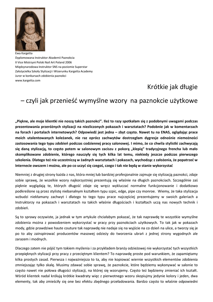 Ewa Kargetta Dyplomowana Instruktor Akademii Paznokcia II Vice Mistrzyni Polski Nail Art Poland 2006 Międzynarodowa Instruktor SNS na poziomie Superstar Założycielka Szkoły Stylizacji i Wizerunku Kargetta Academy Juror w konkursach zdobienia paznokci www.kargetta.com Krótkie jak długie – czyli jak przenieść wymyślne wzory na paznokcie użytkowe „Piękne, ale moje klientki nie noszą takich paznokci”. Ileż to razy spotkałam się z podobnymi uwagami podczas prezentowania przeróżnych stylizacji na niezliczonych pokazach i warsztatach? Podobnie jak w komentarzach na forach i portalach internetowych? Odpowiedź jest jedna – zbyt często. Nawet tu na ENAS, oglądając prace moich utalentowanych koleżanek, nie raz oprócz zachwytów dostrzegłam dygresje odnośnie niemożności zastosowania tego typu zdobień podczas codziennej pracy salonowej. I mimo, że co chwila stylistki zachwycają się daną stylizacją, to często potem w salonowym zaciszu z pokorą „klepią” tradycyjnego frencha lub mało skomplikowane zdobienie, którego nauczyły się tych kilka lat temu, niekiedy jeszcze podczas pierwszego szkolenia. Dlatego też nie uczestniczą w żadnych warsztatach i pokazach, wychodząc z założenia, że popatrzeć w Internecie owszem i można, ale po co uczyć się czegoś, czego i tak nie będą w stanie wykorzystać Niemniej z drugiej strony każda z nas, która mniej lub bardziej profesjonalnie zajmuje się stylizacją paznokci, zdaje sobie sprawę, że wszelkie wzory najkorzystniej prezentują się właśnie na długich paznokciach. Szczególnie zaś pięknie wyglądają te, których długość zdaje się wręcz wykluczać normalne funkcjonowanie i dodatkowo podkreślone są przez stylistę niebanalnym kształtem typu szpic, edge, pipe czy monroe. Wiemy, że taka stylizacja wzbudzi niekłamany zachwyt i dlatego to tego typu prace najczęściej prezentujemy w swoich galeriach a Instruktorzy na pokazach i warsztatach na takich właśnie długościach i kształtach uczą nas nowych technik i zdobień. Są to sprawy oczywiste, ja jednak w tym artykule chciałabym pokazać, że tak naprawdę te wszystkie wymyślne zdobienia można z powodzeniem wykorzystać w pracy przy paznokciach użytkowych. To tak jak w pokazach mody, gdzie prawdziwe haute couture tak naprawdę nie nadaje się na wyjście na co dzień na ulice, a tworzy się je po to aby zainspirować producentów masowej odzieży do tworzenia ubrań z jednej strony wygodnych ale zarazem i modnych. Dlaczego zatem nie pójść tym tokiem myślenia i za przykładem branży odzieżowej nie wykorzystać tych wszystkich przepięknych stylizacji przy pracy z przeciętnym klientem? To naprawdę proste pod warunkiem, że zapamiętamy kilka prostych zasad. Pierwsza i najważniejsza to ta, aby nie kopiować wiernie wszystkich elementów zdobienia zmniejszając tylko skalę. Musimy zdawać sobie sprawę, że paznokcie, które będziemy wykonywać w salonie to często nawet nie połowa długości stylizacji, na której się wzorujemy. Często też będziemy zmieniać ich kształt. Wśród klientek nadal królują krótkie kwadraty więc z pierwotnego wzoru skopiujmy jedynie kolory i jeden, dwa elementy, tak aby zmieściły się one bez efektu zbędnego przeładowania. Bardzo często to właśnie odpowiedni dobór barw, ciekawe połączenie ozdób i nawet jeden element zdobniczy dają stylizacji to coś co wzbudziło nasz zachwyt. Druga bardzo ważna rzecz to właśnie zachowanie czystości kompozycji, którą to uzyskamy nie tylko poprzez oszczędność w ilości zamieszczanych elementów zdobienia, ale także poprzez ich odpowiednie zmniejszenie z zachowaniem dbałości o precyzję wykonania. Nie może być tak, że mała różyczka ze stylizacji, która nas tak ujęła i w której była tylko delikatnym, niedużym elementem u nas zdominuje całe zdobienie. Jeśli nie jesteśmy w stanie jej odpowiednio zminiaturyzować, nie umieszczajmy jej w całości a np. jako mały pączek lub połówkę róży. Poniżej przedstawiam kilka takich przykładów gdzie klientki zachwycone zdjęciami prac wykonanych na modelkach i umieszczonych w salonowym albumie, nie potrafiły sobie odmówić zdobień zainspirowanych tymi właśnie stylizacjami. Nie mniej aby tworzyć te wszystkie piękne stylizacje przenosząc je z powodzeniem na krótkie paznokcie użytkowe potrzebujemy pewnych umiejętności. Pierwszym krokiem aby je zdobyć są na pewno warsztaty czy pokazy gdzie pod okiem wybranego Instruktora nauczymy się jak dobierać kolory, poznamy techniki pracy i sposoby na wszystkie zachwycające zdobienia. Drugi, równie ważny krok, to samodzielne ćwiczenia. Nie radzę wykonywać ich bezpośrednio na klientkach, znacznie lepiej nabierać wprawy na modelkach. Gwarantuję, że bez problemu znajdziecie chętne na darmowe stylizacje, nawet gdyby miały to być tak długie „pola do nabierania wprawy” jak przedstawione tu przeze mnie. Moje modelki, a właściwie ich paznokcie, po sesji zdjęciowej zostały w niecałe pół godziny doprowadzone do stanu, w którym mogły bez problemu normalnie funkcjonować. Wystarczyło za pomocą frezarki zrobić nacięcie mniej więcej w połowie długości a następnie pilnikiem spiłować brzeg do pożądanego kształtu. Osobiście wybrałam coś pomiędzy pipe a migdałkiem. Jako, że tego typu stylizacje do sesji wykonujemy naprawdę cienkie, aby jak najsubtelniej prezentowały się na zdjęciu, to nie ma problemu z grubymi końcówkami jak to często bywa gdybyśmy chciały tak drastycznie skrócić typowo salonowe paznokcie. Przy okazji możecie podejrzeć jak samoczynnie doszło do przeniesienia wzoru z długich na krótkie paznokcie i choć nie jest to może idealne przeniesienie to nawet przy użyciu tak drastycznych środków widać, że stylizacja nie straciła wiele na uroku. Mam nadzieję, że po przeczytaniu tego artykułu i obejrzeniu przykładowych „metamorfoz” choć kilka z Was przekona