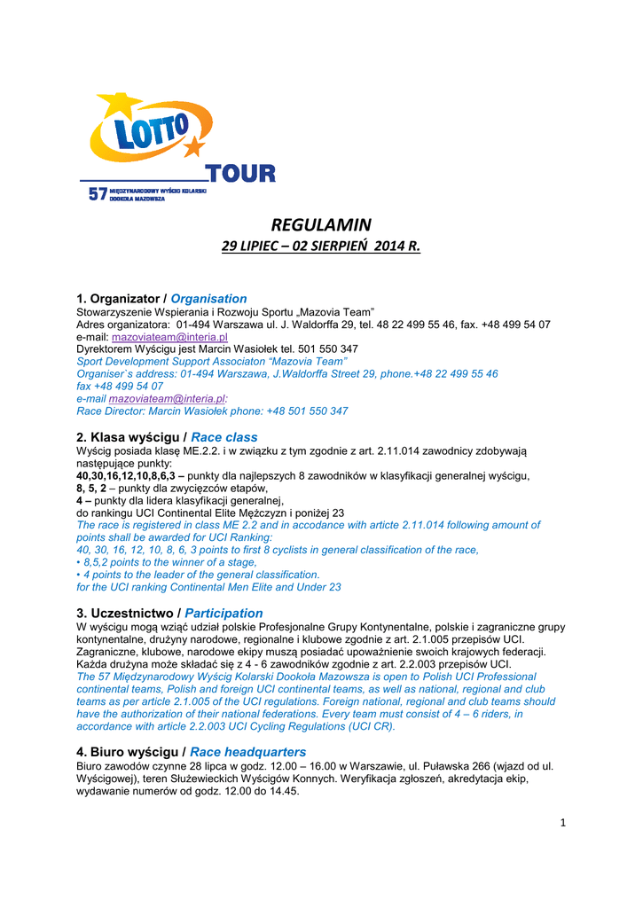 REGULAMIN 29 LIPIEC – 02 SIERPIEŃ 2014 R. 1. Organizator / Organisation Stowarzyszenie Wspierania i Rozwoju Sportu „Mazovia Team” Adres organizatora: 01-494 Warszawa ul. J. Waldorffa 29, tel. 48 22 499 55 46, fax. +48 499 54 07 e-mail: [email protected] Dyrektorem Wyścigu jest Marcin Wasiołek tel. 501 550 347 Sport Development Support Associaton “Mazovia Team” Organiser`s address: 01-494 Warszawa, J.Waldorffa Street 29, phone.+48 22 499 55 46 fax +48 499 54 07 e-mail [email protected]: Race Director: Marcin Wasiołek phone: +48 501 550 347 2. Klasa wyścigu / Race class Wyścig posiada klasę ME.2.2. i w związku z tym zgodnie z art. 2.11.014 zawodnicy zdobywają następujące punkty: 40,30,16,12,10,8,6,3 – punkty dla najlepszych 8 zawodników w klasyfikacji generalnej wyścigu, 8, 5, 2 – punkty dla zwycięzców etapów, 4 – punkty dla lidera klasyfikacji generalnej, do rankingu UCI Continental Elite Mężczyzn i poniżej 23 The race is registered in class ME 2.2 and in accodance with articte 2.11.014 following amount of points shall be awarded for UCI Ranking: 40, 30, 16, 12, 10, 8, 6, 3 points to first 8 cyclists in general classification of the race, • 8,5,2 points to the winner of a stage, • 4 points to the leader of the general classification. for the UCI ranking Continental Men Elite and Under 23 3. Uczestnictwo / Participation W wyścigu mogą wziąć udział polskie Profesjonalne Grupy Kontynentalne, polskie i zagraniczne grupy kontynentalne, drużyny narodowe, regionalne i klubowe zgodnie z art. 2.1.005 przepisów UCI. Zagraniczne, klubowe, narodowe ekipy muszą posiadać upoważnienie swoich krajowych federacji. Każda drużyna może składać się z 4 - 6 zawodników zgodnie z art. 2.2.003 przepisów UCI. The 57 Międzynarodowy Wyścig Kolarski Dookoła Mazowsza is open to Polish UCI Professional continental teams, Polish and foreign UCI continental teams, as well as national, regional and club teams as per article 2.1.005 of the UCI regulations. Foreign national, regional and club teams should have the authorization of their national federations. Every team must consist of 4 – 6 riders, in accordance with article 2.2.003 UCI Cycling Regulations (UCI CR). 4. Biuro wyścigu / Race headquarters Biuro zawodów czynne 28 lipca w godz. 12.00 – 16.00 w Warszawie, ul. Puławska 266 (wjazd od ul. Wyścigowej), teren Służewieckich Wyścigów Konnych. Weryfikacja zgłoszeń, akredytacja ekip, wydawanie numerów od godz. 12.00 do 14.45. 1 Odprawa techniczna odbędzie się zgodnie z art.1.2.087 przepisów UCI w biurze wyścigu 28 lipca o godz.15.00 At the start, the race headquarters shall be open starting on Monday, 28 July from 12:00 to 16:00 in the race office located at the following address: Warsaw, ul. Puławska 266 (entrance from ul. Wyścigowa), the area Służewiec Jockey. Verification of applications, issuing accreditation of team and start numbers will take place at the race office on Monday, 28 July from 12:00 to 14:45 The technical briefing in accordance with article 1.2.087 of the UCI regulations, in the presence of the Members of the Commissaires’ Panel will be held at the race office July 28 at 15.00. 5. Kolejność startu na etapie jazdy drużynowej na czas / The starting order for the team time trial stages Kolejność startu na I etapie jazdy drużynowej na czas ustalona będzie na odprawie technicznej poprzez losowanie drużyn. Sequence of start will be on period of team riding on time on technical briefing through drawing of lots established. 6. Radio wyścigu / Radio Tour Radio Wyścigu będzie pracowało w języku polskim i angielskim, na kanale 1 na częstotliwości 82,1250 MHz. Radio Tour, will be broadcasted on channel 1 (82,1250 MHz) in polish and English. 7. Neutralna pomoc techniczna / Neutral vehicles Organizator zapewnia 3 odpowiednio wyposażone pojazdy neutralnej pomocy technicznej, poruszające się zgodnie z decyzją Komisarzy. The Organizer provides 3 adequately equipped neutral technical support vehicles. 8. Przepisy dotyczące ostatnich 3 kilometrów / Accidents on the last three kilometers. W przypadku stwierdzenia przez sędziów kraksy lub defektu na ostatnich 3 km etapu ze startu wspólnego, obowiązują art.2.6.027 Przepisów UCI. In case of a duly noted fall, puncture or mechanical incident in the last three kilometers of a road race stage, article 2.6.027 of the UCI CR applies. 9. Limit czasu / Time limits Zgodnie z art. 2.3.039 Przepisów Sportowych limit czasu wynosi 8 %. W szczególnych okolicznościach limit czasu może być zmieniony przez Komisję Sędziowską w porozumieniu z organizatorem. The time limit is 8 %. The time limit may be changed by the Commissaires Panel in consultation with the organiser. 10. Klasyfikacja i bonifikaty / Classification and discount Lider klasyfikacji jest zobowiązany do noszenia koszulki właściwej klasyfikacji. Jeżeli zawodnik jest liderem więcej niż jednej klasyfikacji należy przestrzegać poniższej kolejności noszenia koszulki: 1. indywidualna klasyfikacja generalna 2. klasyfikacja punktowa 3. klasyfikacja górska 4. klasyfikacja aktywnego 5. klasyfikacja poniżej 23 lat Zawodnicy klasyfikacji drużynowej są zobowiązani do noszenia dodatkowych oznakowań świadczących, że są liderami klasyfikacji drużynowej. The leader of each classification shall be required to wear the corresponding distinctive jersey. If a rider is leading more than one classification, the order of priority of the distinctive jerseys shall be as follows: 1. General classification by time; 2. General Points classification; 3. General Mountains classification; 4. General Intermediate Sprints Classification 2 5. General Under 23 Classification The riders of the team leading the team classification shall be required to wear the corresponding distinctive sign. Indywidualna Klasyfikacja Generalna / Individual General Classification. Klasyfikacja prowadzona będzie zgodnie z Przepisami UCI. The cl