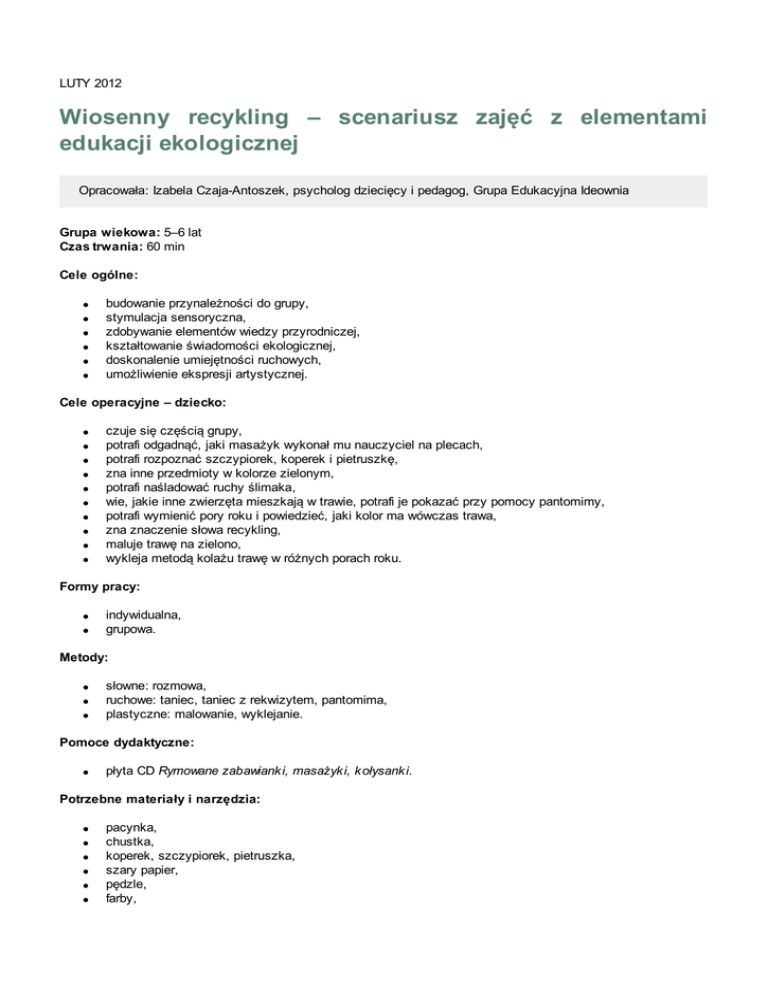 LUTY 2012 Wiosenny recykling – scenariusz zajęć z elementami edukacji ekologicznej Opracowała: Izabela Czaja-Antoszek, psycholog dziecięcy i pedagog, Grupa Edukacyjna Ideownia Grupa wiekowa: 5–6 lat Czas trwania: 60 min Cele ogólne: · · · · · · budowanie przynależności do grupy, stymulacja sensoryczna, zdobywanie elementów wiedzy przyrodniczej, kształtowanie świadomości ekologicznej, doskonalenie umiejętności ruchowych, umożliwienie ekspresji artystycznej. Cele operacyjne – dziecko: · · · · · · · · · · czuje się częścią grupy, potrafi odgadnąć, jaki masażyk wykonał mu nauczyciel na plecach, potrafi rozpoznać szczypiorek, koperek i pietruszkę, zna inne przedmioty w kolorze zielonym, potrafi naśladować ruchy ślimaka, wie, jakie inne zwierzęta mieszkają w trawie, potrafi je pokazać przy pomocy pantomimy, potrafi wymienić pory roku i powiedzieć, jaki kolor ma wówczas trawa, zna znaczenie słowa recykling, maluje trawę na zielono, wykleja metodą kolażu trawę w różnych porach roku. Formy pracy: · · indywidualna, grupowa. Metody: · · · słowne: rozmowa, ruchowe: taniec, taniec z rekwizytem, pantomima, plastyczne: malowanie, wyklejanie. Pomoce dydaktyczne: · płyta CD Rymowane zabawianki, masażyki, kołysanki. Potrzebne materiały i narzędzia: · · · · · · pacynka, chustka, koperek, szczypiorek, pietruszka, szary papier, pędzle, farby, · · · · · materace, produkty do wyklejania różnych rodzajów trawy (opakowania po produktach spożywczych, środkach czystości, etykiety z butelek itp.), kleje, białe brystole, rysunek trawy z nieokreślonym kształtem. Przebieg zajęć: 1. Powitanie pacynką – postać pacynki wita dzieci i zaprasza je do wspólnej zabawy. 2. Zagadki przyrodnicze – pacynka rysuje na powitanie każdemu dziecku na plecach trawkę albo wysokie drzewo; dzieci zgadują, co narysowała pacynka. 3. Piosenka ruchowa na powitanie – Ja i ty (CD Rymowane zabawianki, masażyki, kołysanki); dzieci tańczą w parach, podczas refrenu kłaniają się sobie na powitanie. 4. Zagadka dydaktyczna – co schowało się pod chustą? – prowadzący pod chustą chowa pietruszkę, koperek i szczypiorek; dzieci, wąchając, próbują odgadnąć, co schowało się pod chustą; po odgadnięciu rozmowa z prowadzącym o kolorze schowanych warzyw, z czym kojarzy się kolor zielony, jaka będzie trawa na wiosnę, co jeszcze w przyrodzie jest w kolorze zielonym? 5. Zabawa plastyczna – dzieci pomagają wiośnie malować trawę; prowadzący dzieli dzieci na dwie grupy; każda z grup otrzymuje arkusz szarego papieru, na nim pociągnięciami pędzla dzieci malują trawę. 6. Zabawa ruchowa – ślimaki – zabawa ruchowa z materacami na plecach: jak chodzą, jak śpią, jak się chowają, jak robią gimnastykę, aby im nie spadła skorupka, a może dzieci mają inne pomysły, co jeszcze mogą robić ślimaki w trawie? 7. Zabawa z pantomimą – pokazywanie zwierzątek mieszkających w trawie przez jedno dziecko – pozostałe zgadują, co to za zwierzątko? (inna realizacja tej zabawy: gdy gra muzyka, dzieci biegają, gdy przestanie grać, zatrzymują się i prowadzący wskazuje, kto ma zadać zagadkę; pozostali odgadują). 8. Rozmowa dydaktyczna – Jaka jest trawa w różne pory roku? W jakich kolorach?; prowadzący rozmawia z dziećmi. 9. Zabawa plastyczna – wyklejanie z kolorowych materiałów trawy w różnych porach roku (do tej pracy plastycznej wykorzystujemy opakowania po zużytych produktach – można wcześniej poprosić rodziców dzieci o zbieranie w domu opakowań w różnych kolorach i przyniesienie ich do przedszkola, np. opakowania po produktach spożywczych, etykiety z butelek, środków czystości, gazet itp.); podczas pracy plastycznej prowadzący tłumaczy dzieciom, co oznacza słowo recykling). 10. Zabawa twórcza – co schowało się za trawą? – prowadzący pokazuje dzieciom rysunek trawy z wystającym z niej kawałkiem przedmiotu (dowolny, bliżej nieokreślony kształt); dzieci odgadują, co schowało się w trawie. 11. Pożegnanie z pacynką – postać pacynki dziękuje dzieciom za wspólną zabawę.