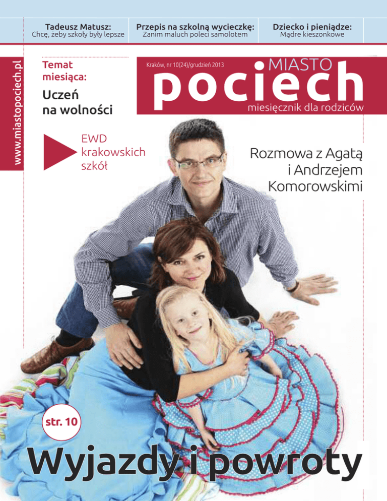 Tadeusz Matusz: www.miastopociech.pl Chcę, żeby szkoły były lepsze Przepis na szkolną wycieczkę: Zanim maluch poleci samolotem Temat miesiąca: Uczeń na wolności EWD krakowskich szkół b str. 10 Dziecko i pieniądze: Mądre kieszonkowe pociech Kraków, nr 10(24)/grudzień 2013 MIASTO miesięcznik dla rodziców Rozmowa z Agatą i Andrzejem Komorowskimi www.miastopociech.pl W szkołach znów zawrzało D okładnie rok temu o tej porze pisaliśmy: „znów zapowiada się gorąca zima w krakowskiej oświacie. Miasto chce zamknąć ponad 20 szkół”. Minął rok, a my moglibyśmy w zasadzie powtórzyć te słowa. W krakowskich szkołach znów bowiem zawrzało. Tym razem jednak nie chodzi o groźbę ich likwidacji, tylko o wyniki nauczania. Nowy wiceprezydent miasta Tadeusz Matusz (wywiad z nim na stronach 8-9), który w sierpniu zastąpił na tym stanowisku Annę Okońską-Walkowicz, postanowił sprawdzić jak uczą krakowskie szkoły. I ze zgrozą złapał się za głowę. Okazało się bowiem, że aż połowa gimnazjów to szkoły, które marnują potencjał swoich uczniów lub w najlepszym razie nie są w stanie sprawić, by byli choć odrobinę lepsi. Problem w jeszcze większym stopniu dotyczy szkół ponadgimnazjalnych. Dyrektorzy najsłabszych placówek zostali wezwani na dywanik i dostali rok na poprawę wyników. Tadeusz Matusz jasno dał im też do zrozumienia, że są kandydatami do zamknięcia. Jednak już nie w tym roku szkolnym. Wkrótce mamy wybory samorządowe i żaden radny nie podniesie ręki za likwidacją, choćby najgorszej szkoły. Ale dokładnie za rok o tej porze pewnie znów napiszemy: zapowiada się gorąca zima w krakowskiej oświacie. Czy słabe szkoły wykorzystają ten rok i choćby nieznacznie poprawią swoje wyniki? Tadeusz Matusz sugeruje, że tylko w ten sposób mogą uchronić się przed likwidacją. W tym numerze znajdziecie rankingi krakowskich szkół stworzone na podstawie edukacyjnej wartości dodanej. Wyniki wszystkich placówek publikujemy na www.miastopociech.pl. Podczas gdy jedni wpatrują się w rankingi i śrubują wyniki, inni zabierają dzieci ze szkół, bo chcą, by bez przymusu, dzwonków, podręczników i ocen uczyły się tego czego same chcą i tylko wtedy, jeśli mają na to ochotę. A egzaminy? – Wolny uczeń przygotuje się do nich lepiej niż niejeden klasowy – przekonują. Piszemy o tym na stronach 4 – 6. Polecamy też lekturę wywiadu z dr Agatą Komorowską, iberystką, tłumaczką i pracownikiem naukowym Uniwersytetu Jagiellońskiego oraz dr. Andrzejem Komorowskim, chirurgiem w krakowskim Instytucie Onkologii, którzy w rozmowie z nami opowiadają o swoim kilkuletnim pobycie w Hiszpanii i podróżach, dzięki którym poznali niemal cały świat. ŻYCZYMY MIŁEJ LEKTURY ORAZ RODZINNYCH ŚWIĄT BOŻEGO NARODZENIA REDAKCJA MIESIĘCZNIKA MIASTO pociech | MIASTOpociech | 3 spis treści Spis treści TEMAT MIESIĄCA Uczeń na wolności W Polsce rośnie liczba rodziców, którzy zamiast posyłać dzieci do szkoły, wolą uczyć je w domu. Powstają też pierwsze szkoły demokratyczne, w których nie ma ocen, dzwonków i podręczników, a uczeń chodzi na lekcje tylko wtedy, jeśli sam tego chce i uczy się tego, czego chce. 4 ROZMOWY Tadeusz Matusz: Chcę tylko, żeby szkoły były lepsze 8 Agata i Andrzej Komorowscy: Wyjazdy i powroty 10 PRZEPIS NA WEEKEND: 13 14 15 Anioł w miasteczku Urodziny z lajkonikiem i andrusami Na narty i łyżwy do Rabki PRZEPIS NA SZKOLNĄ WYCIECZKĘ 16 Zanim maluch poleci samolotem Podróż do świata zaczarowanych dźwięków 17 WYMARZONY PREZENT Prezenty i smakołyki na świąteczny stół 18 DZIECI I PIENIĄDZE 19 Mądre kieszonkowe Rankingi MIASTA pociech: EWD krakowskich szkół 20-21 Pedagogika Marii Montessori 24 Maja Skowron poleca 26 Nie przegap 26 MIASTO pociech Bezpłatny miesięcznik dla rodziców i nauczycieli. Wydawca: Wydawnictwo Krakówek. Kontakt z redakcją: [email protected], 533-993-487. Zamówienia na druk reklam: [email protected], 536-990-123. Strona internetowa: www.miastopociech.pl. Projekt graficzny: Agencja zylko4media Tomasz Żyłko. Redakcja nie odpowiada za treść reklam i ogłoszeń. Zdjęcie na okładce: Joanna Kucharska 4 temat miesiąca | MIASTOpociech Są rodzice, którzy zamiast posyłać swoje dzieci do szkoły, wolą uczyć je w domu. Są też tacy, którym marzy się szkoła bez przymusu, dzwonków i podręczników, w której uczeń chodzi na lekcje tylko wtedy jeśli sam tego chce i uczy się tego, czego chce. Stale przybywa też zwolenników innych alternatywnych form i metod edukowania najmłodszyc AGNIESZKA KARSKA S iedemnastoletni Krzysiek z Krakowa, zamiast w pocie czoła przygotowywać się do kolejnych sprawdzianów i egzaminów, niemal całymi dniami realizuje swoją pasję. Choć formalnie jest uczniem drugiej klasy liceum ogólnokształcącego, to jednak jeszcze ani razu nie przekroczył progu swojej klasy. Zamiast tego uczy się w dwóch szkołach muzycznych – w jednej gra jazz, w drugiej muzykę organową. – Jedno i drugie świetnie mu wychodzi – mówi Zdzisław Borys, tata Krzyśka. Czy nie martwi się, że syn – poświęcając się wyłącznie swojej pasji – może mieć wkrótce problem ze zdaniem matury? – Zostawiamy mu pod tym względem wolną rękę. Wiem, że za parę lat, jeśli dojdzie do wniosku, że jest mu to potrzebne, sam przygotuje się do matury i ją zaliczy – mówi tata Krzysia. Szkoła bez szkoły Chłopak jest jednym z ponad 300 małopolskich uczniów objętych tzw. edukacją domową. Na zabranie syna ze szkoły rodzina Borysów zdecydowała się kilka lat temu, kiedy okazało się, że ma on problemy z przedmiotami ścisłymi, ale za to jest niezwykle uzdolniony muzycznie. – W tradycyjnej szkole jest tak, że trzeba być dobrym we wszystkim, by przechodzić z klasy do klasy. W edukacji domowej, która moim zdaniem jest najlepszą metodą uczenia, można dostosować tempo i sposób pracy do możliwości i po