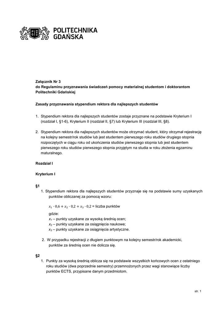 Załącznik Nr 3 do Regulaminu przyznawania świadczeń pomocy materialnej studentom i doktorantom Politechniki Gdańskiej Zasady przyznawania stypendium rektora dla najlepszych studentów 1. Stypendium rektora dla najlepszych studentów zostaje przyznane na podstawie Kryterium I (rozdział I, §1-6), Kryterium II (rozdział II, §7) lub Kryterium III (rozdział III, §8). 2. Stypendium rektora dla najlepszych studentów może otrzymać student, który otrzymał rejestrację na kolejny semestr/rok studiów lub jest studentem pierwszego roku studiów drugiego stopnia rozpoczętych w ciągu roku od ukończenia studiów pierwszego stopnia lub jest studentem pierwszego roku studiów pierwszego stopnia przyjętym na studia w roku złożenia egzaminu maturalnego. Rozdział I Kryterium I §1 1. Stypendium rektora dla najlepszych studentów przyznaje się na podstawie sumy uzyskanych punktów obliczanej za pomocą wzoru: = liczba punktów gdzie: x1 – punkty uzyskane za wysoką średnią ocen; x2 – punkty uzyskane za osiągnięcia naukowe; x3 – punkty uzyskane za osiągnięcia artystyczne. 2. W przypadku rejestracji z długiem punktowym na kolejny semestr/rok akademicki, punktów za średnią ocen nie dolicza się. §2 1. Punkty za wysoką średnią oblicza się na podstawie wszystkich końcowych ocen z ostatniego roku studiów (dwa poprzednie semestry) przemnożonych przez wagi stanowiące liczby punktów ECTS, przypisane danym przedmiotom. str. 1 2. W przypadku, gdy przedmioty nie mają wag punktowych, do wyznaczenia średniej, o której mowa w ust. 1, stosuje się średnią arytmetyczną. 3. Średnie wyliczane są na podstawie ocen wpisanych do protokołów. 4. Punkty za uzyskaną średnią przyznaje się od średniej 3,800 i ustala za pomocą wzoru: = liczba punktów gdzie: x - średnia ocen uzyskana przez studenta. §3 1. Za osiągnięcia naukowe przyznawane są punkty umożliwiające uzyskanie stypendium rektora dla najlepszych studentów. 2. Dla poszczególnych osiągnięć, o których mowa w ust. 1, przypisuje się odpowiednie wartości punktowe: a) publikacja lub udział w publikacji naukowej opublikowanej w czasopiśmie umieszczonym na liście JCR - 15 pkt. b) publikacja rozdziału w książce lub udział w publikacji w pozostałych wydawnictwach naukowych - 12 pkt. c) publikacje, artykuły naukowe i popularno-naukowe lub udział w publikacjach w innych czasopismach - 8 pkt. d) przedstawienie referatu, komunikatu lub posteru na konferencji naukowej – 10 pkt. e) laureat konkursu o charakterze naukowym na szczeblu wojewódzkim – 3 pkt., krajowym – 7 pkt., międzynarodowym – 15 pkt. f) aktywna działalność w kole naukowym lub organizacji studenckiej lub organizacji zrzeszających studentów, którego/której rezultaty są w postaci referatów, odczytów, wystaw, seminariów, konferencji, opracowań urządzeń i modeli, realizacji projektów popularyzujących naukę itp., potwierdzonym przez dziekana – 15 pkt. g) aktywny udział w projektach badawczych i wdrożeniowych, potwierdzony przez dziekana – 15 pkt. 3. Każde z osiągnięć naukowych musi zostać właściwie udokumentowane. Dla osiągnięć, o których mowa w ust. 2 ppkt. a-e, konieczne jest załączenie kopii publikacji (w przypadku obszernych prac należy załączyć abstrakt potwierdzony przez opiekuna pracy lub dziekana) lub dyplomu. str. 2 4. W przypadku wielokrotnych osiągnięć w poszczególnych podpunktach, o których mowa w ust. 2, punktacja może być w tych pozycjach zwielokrotniona, jednak sumarycznie student za osiągnięcia naukowe nie może otrzymać więcej niż 100 punktów. 5. Student studiujący na dwóch lub więcej kierunkach studiów otrzymuje dodatkowe 15 pkt. (jako dodatkowe osiągnięcie naukowe) za każdy dodatkowy kierunek studiów, na którym otrzymuje bez opóźnień rejestrację na kolejny semestr. Student jest zobowiązany do dostarczenia zaświadczenia potwierdzającego fakt studiowania na innym kierunku i otrzymania terminowej rejestracji na kolejny semestr. 6. W uzasadnionych przypadkach rektor w porozumieniu z UKS może zastosować indywidualną wartość punktową osiągnięć naukowych. §4 1. Za osiągnięcia artystyczne przyznawane są punkty umożliwiające uzyskanie stypendium rektora dla najlepszych studentów. 2. Dla poszczególnych osiągnięć, o których mowa w ust. 1 odpowiednie wartości punktowe przypisuje Rektor lub osoby przez niego upoważnione działające w porozumieniu z UKS. 3. Ilość punktów przyznana za osiągnięcia artystyczne zależy przede wszystkim od: a) prestiżu osiągnięcia/konkursu; b) zasięgu osiągnięcia/konkursu (np. lokalne/krajowe/międzynarodowe); c) osiągnięcie tytułu laureata/zajęcie czołowego miejsca w danym konkursie; d) pracochłonność i czasochłonność przygotowań do realizacji osiągnięcia/konkursu. 4. Każde z osiągnięć artystycznych musi zostać właściwie udokumentowane. 5. Maksymalna ilość punktów jakie można uzyskać za osiągnięcia artystyczne wynosi 100. §5 W uzasadnionych przypadkach rektor w porozumieniu z UKS może indywidualnie przyznać stypendium rektora dla najlepszych studentów. §6 1. Listy osób wraz ze średnimi ocen od 3,800 wzwyż za ostatni rok/semestr oraz wykaz i liczebność wszystkich kierunków, przygotowuje dziekanat w ciągu 4 tygodni od początku nowego roku akademickiego lub 2 tygodni od początku semestru letniego, w przypadku studentów rozpoczynających studia od tego semestru. str. 3 2. W przypadku studentów pierwszego semestru studiów drugiego stopnia warunkiem otrzymania stypendium rektora dla najlepszych studentów jest złożenie: 1) Wniosku o przyznanie stypendium rektora dla najlepszych studentów, z wyliczoną średnią ważoną. Średnia nie uwzględnia oceny z egzaminu dyplomowego. W przypadku, gdy skala ocen na studiach pierwszego stopnia była inna, niż na Politechnice Gdańskiej, należy przeskalować uzyskaną średnią stosując następujący wzór: i. Ze 