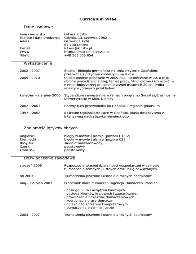 Curriculum Vitae Dane osobowe Imię i nazwisko Miejsce i data urodzenia Adres E-mail WWW Telefon Łukasz Kiczko Gdynia, 13. czerwca 1982 Ostroroga 42/4 64-100 Leszno [email protected] http://tlumaczenia.kiczko.pl +48 503 655 654 Wykształcenie 2002 - 2007 2009 - 2010 Studia - filologia germańska na Uniwersytecie Gdańskim, przerwane z przyczyn osobistych na V roku Studia podjęte ponownie w 2009 roku, zakończone w 2010 roku obroną pracy licencjackiej; temat pracy: 'Anglicyzmy i ich rozwój w niemieckojęzycznej prasie muzycznej ostatnich 20 lat. Próba analizy wybranych przykładów' kwiecień – sierpień 2006 Stypendium semestralne w ramach programu Socrates/Erasmus na uniwersytecie w Köln, Niemcy 2002 – 2003 Roczny kurs przewodnika po Gdańsku i regionie gdańskim 1997 – 2002 II Liceum Ogólnokształcące w Gdańsku, klasa dwujęzyczna z intensywną nauką języka niemieckiego Znajomość języków obcych Angielski Niemiecki Rosyjski Czeski Francuski biegły w mowie i piśmie [poziom C1/C2] biegły w mowie i piśmie [poziom C2] średnio zaawansowany podstawowy podstawowy Doświadczenie zawodowe styczeń 2009 Rozpoczęcie własnej działalności gospodarczej w zakresie tłumaczeń pisemnych i ustnych oraz usług powiązanych od 2007 Tłumaczenia pisemne i ustne dla różnych podmiotów maj – sierpień 2007 Pracownik biura tłumaczeń, Agencja Tłumaczeń Transleo - 2003 - 2007 obsługa biura i urządzeń biurowych obsługa klientów krajowych i zagranicznych prowadzenie projektów tłumaczeniowych koordynacja pracy tłumaczy opieka nad sprzętem komputerowym tłumaczenia pisemne i ustne Tłumaczenia pisemne i ustne dla różnych podmiotów Zakres dotychczas wykonanych tłumaczeń tłumaczenia pisemne od 2002 - instrukcje obsługi urządzeń medyczno-sanitarnych, oprogramowanie do obsługi magazynu medycznego [dla BTH Amed, Raszyn] - instrukcje obsługi oprogramowania do obróbki grafiki i dźwięku [dla Glasspalace Multimedia, Szczecin] - instrukcje eksploatacji i programowania oraz materiały reklamowe przemysłowych urządzeń pralniczych [dla Pramazut sp. z o. o., Masłów] - artykuły związane z historią Wrzeszcza [dla inicjatywy Dolny Wrzeszcz] - tłumaczenie list dialogowych i materiałów filmowych [dla OperatorKamery.pl, Kraków] - SIWZ, dokumentacja przetargowa, specyfikacje techniczne - kontrakty, umowy - instrukcje obsługi i serwisowe - teksty z zakresu szeroko pojętej informatyki, historii, historii sztuki, biochemii - korespondencja handlowa - tłumaczenia stron internetowych [portfolio na stronie internetowej] przetłumaczone publikacje - Rzepka, Anna; Sosnowski, Roman; Tylus, Piotr: Historia kolekcji rękopisów romańskich z byłej Pruskiej Biblioteki Państwowej w berlinie, przechowywanych w Bibliotece Jagiellońskiej w Krakowie studium ogólne, Wydział Filologiczny Uniwersytetu Jagiellońskiego. ISBN 978-83-62705-02-3 - Fibula, nr 2/2010 (5), ISSN 1899-640X - Fibula, nr 1/2011 (6), ISSN 1899-640X tłumaczenia ustne od 2003 - tłumaczenie podczas 26. spotkania grupy roboczej kierowników systemów produkcyjnych zakładów firmy Volkswagen, Poznań, 10.11. lipca 2014. [dla Volkswagen, Poznań] - tłumaczenie wyjazdowe podczas negocjacji handlowych, Cork, Irlandia, 23.-25. września 2013. [dla Smart Solutions, Poznań] - tłumacz i opiekun gościa z zagranicy podczas konferencji Blog Forum Gdańsk, 10.-12. grudnia 2010, 13.-17. października 2011 [dla Eureka!Art, Gdańsk] - asysta tłumaczeniowa dla dyrektora Wojewódzkiego Urzędu Pracy w Olsztynie podczas Europejskich Dni Promocji Przedsiębiorczości Młodych, 12.-13. października 2011 [dla WUP, Olsztyn] - tłumaczenie podczas szkolenia pracowników, 19.-23. września 2011 [dla Lear Polska, Tychy] - tłumaczenie podczas szkolenia w zakresie metody rekrutacji i oceny kompetencji Assessment centre, 16.-20. maja 2011 [dla Wojewódzkiego Urzędu Pracy, Olsztyn] - tłumaczenie podczas warsztatów fotograficznych 'Into the wild with photographic lens', 11.-15. kwietnia 2011 [dla fundacji Partnerzy dla Samorządu, Poznań] - tłumaczenie podczas szkolenia pracowników na terenie zakładu Varioboard GmbH, Magdeburg, Niemcy, 28. lutego-17. marca 2011 [dla Swedspan Polska, Bielsk Podlaski] - tłumacz spotkania z ambasadorem Japonii w Polsce, Yuichi Kusumoto, 10. grudnia 2010 [dla NCK, Gdańsk] - tłumacz ekipy technicznej i produkcyjnej na kongresach grupy Ergo Hestia, prace organizacyjne i koordynacyjne, Berlin 2006, Dresden 2007, Berlin 2008 [dla Eureka!Art, Gdańsk] - konferencja handlowa, grudzień 2004 [dla Siko Polska, Gdańsk] Pozostałe umiejętności Obsługa komputera - znajomość budowy komputera i sieci komputerowych, sprzętu i akcesoriów - systemy operacyjne Linux - systemy operacyjne rodziny MS Windows - oprogramowanie biurowe: OpenOffice.org [Writer, Calc, Impress], MS Office [Word, Excel, Power Point] - obróbka dźwięku: Sound Forge, Cool Edit - obróbka grafiki: GIMP, Adobe Photoshop - podstawy pracy z narzędziami CAT: Qt Linguist, Trados, Wordfast - język HTML, tworzenie prostych stron WWW - bardzo szybkie pisanie na klawiaturze [300 zn/min] Prawo jazdy - kategoria B, od 2010 Zainteresowania - fotografia podróże, autostop muzyka we wszystkich odmianach niezależne i amatorskie produkcje filmowe literatura XIX wieku