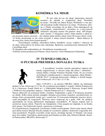 KOMÓRKA NA MISJE W tym roku już po raz drugi zapraszamy naszych uczniów do udziału w wyjątkowej akcji "Komórka na misje". Od kilku lat Zakon Księży Werbistów w ten sposób pozyskuje środki finansowe na misje. Przełożony zakonu o. Dudar, powołując się na dane z firm zajmujących się recyclingiem „elektrośmieci”, stwierdza, że „z tony starych telefonów odzyskać można 150 gramów złota, 100 kilogramów miedzi i 3 kilogramy srebra. Jeden telefon w takiej tonie pozornie znaczy niewiele – ale właśnie jeden telefon zatruć może 60 tysięcy litrów wody. Te liczby przekonują, że nie warto trzymać w domu starych komórek – lepiej dołączyć je do owej tony, która może komuś pomóc." Przeszukajcie szuflady, odwiedźcie babcie, dziadków, ciocie, wujków i włączcie się do akcji, która potrwa do końca roku szkolnego. Będziemy systematycznie informować Was o przebiegu akcji. W ubiegłym roku uzbieraliśmy ok. 50 telefonów komórkowych. Telefony można przekazywać Paniom Alicji Jurewicz i Pani Małogrzacie Piekarskiej. Iśka IV TURNIEJ ORLIKA O PUCHAR PREMIERA DONALDA TUSKA Z początkiem września ruszyła największa impreza piłkarska organizowana w naszym kraju dla dzieci i młodzieży turniej Orlika o Puchar Premiera Donalda Tuska. Po raz czwarty na boiskach wybudowanych w ramach programu „Moje Boisko ORLIK 2012” rywalizują dziewczęta i chłopcy w dwóch kategoriach wiekowych: 10-11 lat i 12-13 lat. Dnia 17.09.2013 r. na naszym ORLIKU odbyły się eliminacje gminne w kat. dziewcząt 12-13 lat. Do rywalizacji przystąpiły 4 zespoły: Szkoła Podstawowa nr 4 z Kętrzyna, Zespół Szkół nr 1 z Oddziałami Integracyjnymi z Kętrzyna, Zespół Szkół z Wilkowa oraz gospodarz imprezy - Szkoła Podstawowa nr 1 z Kętrzyna. Mecze odbywały się systemem każdy z każdym. Punktualnie o godz. 8.30 drużyny przybyły na obiekt. Kilka minut później nastąpiło oficjalne przywitanie zespołów, przedstawienie sędziego, który przypomniał zasady gry i system kar. Po losowaniu kolejności meczów dziewczęta przystąpiły do rozgrzewki. Pierwszy mecz rozpoczął się o godz. 9.00. Na obiekcie zgromadziła się liczna publiczność dopingująca zawodników. W dużym stopniu byli to uczniowie naszej szkoły. Pojawiły się transparenty. Choć pogoda nie dopisała, to na boisku było gorąco. Nie brakowało emocji i sportowej rywalizacji. Po trzygodzinnych zmaganiach rywalizacja została rozstrzygnięta. Dziewczęta naszej szkoły pod okiem trenera Macieja Duczka stanęły na wysokości zadania i dosłownie rozgromiły drużyny przybyłych. Wygrały wszystkie swoje mecze, strzelając łącznie 15 bramek i nie tracąc przy tym żadnej. Największe spustoszenie pod bramką rywalek siały Wiktoria Błażuk i Kamila Pietuszyńska. BRAWO, dziewczęta !!! Na drugim miejscu uplasował się Zespół Szkół z Wilkowa, który uległ tylko liderowi, trzecie miejsce przypadło Zespołowi Szkół nr 1 z Oddziałami Integracyjnymi z Kętrzyna, a czwarte Szkole Podstawowej nr 4 z Kętrzyna. O godz. 12.00 nastąpiło oficjalne zakończenie imprezy. Drużyny otrzymały pamiątkowe dyplomy oraz każda z piłkarek koszulki z logo „Moje Boisko - ORLIK 2012”. Organizator podziękował wszystkim uczestnikom za udział, po czym drużyny z uśmiechami na twarzach rozeszły się. Wyniki spotkań: 1. SP1 – ZS1 4 : 0 2. Wilkowo – SP4 11 : 0 3. SP4 – ZS1 0 : 5 4. SP1 – Wilkowo 2 : 0 5. Wilkowo – ZS1 1 : 0 6. SP1 – SP4 9 : 0 Reprezentacja Szkoły Podstawowej Nr 1 w Kętrzynie: Trener: Maciej Duczek Skład zespołu: Wiktoria Błażuk, Kamila Pietuszyńska, Martyna Jarmuszewicz, Aleksandra Cudziło, Wiktoria Tonojan, Katarzyna Kownacka, Weronika Szatrawska, Eliza Olszewska, Emilia Segin. Organizator: Maciej Duczek WIZYTA W PIEKARNI Dnia 20 września dzieci z klasy III b odwiedziły piekarnię Mistrza Jana w Biedaszkach Małych. Poznały pracę piekarza. Zapoznały się ze sprzętem w piekarni. Dowiedziały się, jak wypieka się chleb, bułeczki i pączki. Na koniec wizyty spałaszowały pyszne pączki upieczone przez panie „cukierniczki”. Dziękujemy Panu Janowi za możliwość zwiedzenia piekarni. Wiedza zdobyta podczas wycieczki zostanie wykorzystana na zajęciach pt. „O naszym chlebem” i „Od ziarenka do bochenka”. JAK PRZEPROWADZIĆ WYWIAD? 25.09.13r. uczestniczyliśmy w warsztatach pt. „Jak przeprowadzić wywiad?” doskonalących redagowanie różnych form wypowiedzi... Pani Joanna Wąsik, studentka socjologii Uniwersytetu w Białymstoku, przedstawiła nam zasady, które w przyszłości ułatwią właściwie przeprowadzić wywiad. Po krótkim wstępie otrzymaliśmy specjalne zadanie: zrobić wywiad z koleżanką lub kolegą, wykorzystując poznane wcześniej informacje. Spotkaniu towarzyszyła miła atmosfera. Liczymy na dalszą współpracę z Panią Joanną, a nowo poznane umiejętności postaramy się wykorzystać w praktyce. "Nowinki Jedynki" MIĘDZYNARODOWY KONKURS ARTYSTYCZNY „Litwa, Polska, Rosja – sąsiedzi, partnerzy i przyjaciele” – rozstrzygnięty Konkurs zorganizowany został w ramach Programu Współpracy Transgranicznej EISP LitwaPolska-Rosja 2007-2013 z okazji Dnia Europy. Około 300 uczestników zaprezentowało prace plastyczne. Nasi uczniowie również spróbowali swoich sił. Udało się!!! Nagrodzeni zostali: Miłosz Piechna (kl. IIIa) - III miejsce – zestaw gier w drewnianym pudełeczku Norbert Świderski (kl. IV a) - nagroda specjalna - puzzle Klaudia Krysiak i Nikola Serwin (kl. IV c) - nagroda specjalna - puzzle Mateusz Pająk (kl. IV c) nagroda specjalna - puzzle SPRZĄTANIE ŚWIATA Tradycją stało się, że uczniowie naszej szkoły przyłączają się do akcji „Sprzątanie Świata”. W tym roku przebiegała ona pod hasłem „Odkrywamy czystą Polskę” i wzięli w niej udział uczniowie klas IV i V wraz z nauczycielami. Dzieci uczestniczyły w sprzątaniu bardzo chętnie i z wielkim przejęciem. Śmieci z