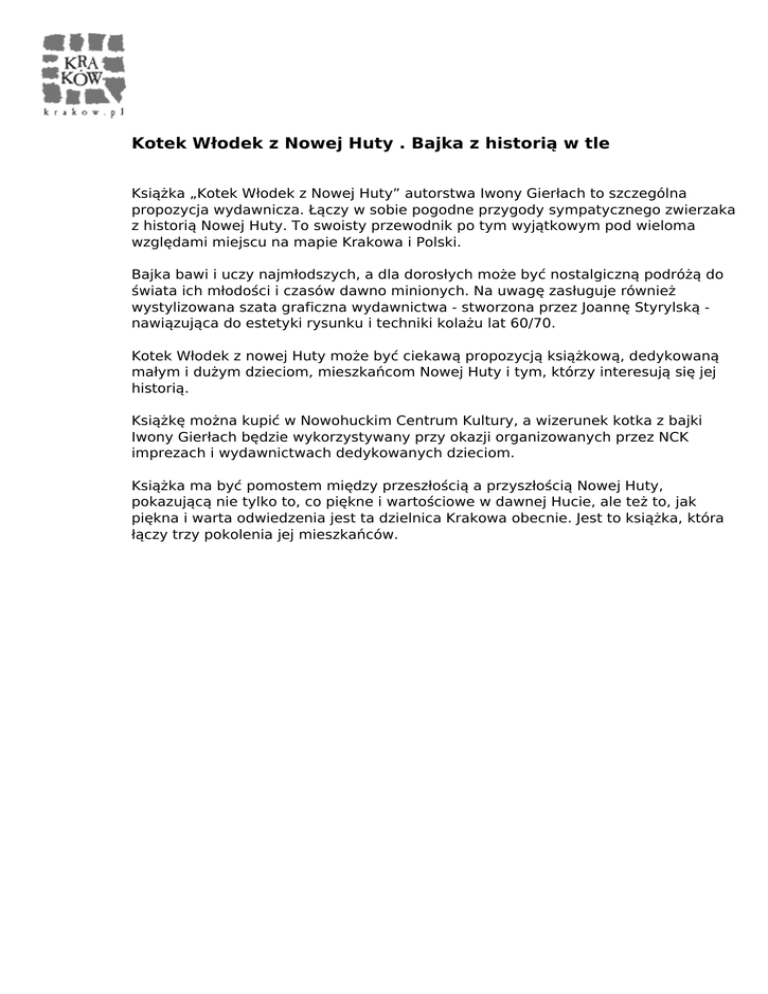Kotek Włodek z Nowej Huty . Bajka z historią w tle Książka „Kotek Włodek z Nowej Huty” autorstwa Iwony Gierłach to szczególna propozycja wydawnicza. Łączy w sobie pogodne przygody sympatycznego zwierzaka z historią Nowej Huty. To swoisty przewodnik po tym wyjątkowym pod wieloma względami miejscu na mapie Krakowa i Polski. Bajka bawi i uczy najmłodszych, a dla dorosłych może być nostalgiczną podróżą do świata ich młodości i czasów dawno minionych. Na uwagę zasługuje również wystylizowana szata graficzna wydawnictwa - stworzona przez Joannę Styrylską nawiązująca do estetyki rysunku i techniki kolażu lat 60/70. Kotek Włodek z nowej Huty może być ciekawą propozycją książkową, dedykowaną małym i dużym dzieciom, mieszkańcom Nowej Huty i tym, którzy interesują się jej historią. Książkę można kupić w Nowohuckim Centrum Kultury, a wizerunek kotka z bajki Iwony Gierłach będzie wykorzystywany przy okazji organizowanych przez NCK imprezach i wydawnictwach dedykowanych dzieciom. Książka ma być pomostem między przeszłością a przyszłością Nowej Huty, pokazującą nie tylko to, co piękne i wartościowe w dawnej Hucie, ale też to, jak piękna i warta odwiedzenia jest ta dzielnica Krakowa obecnie. Jest to książka, która łączy trzy pokolenia jej mieszkańców. Powered by TCPDF (www.tcpdf.org)