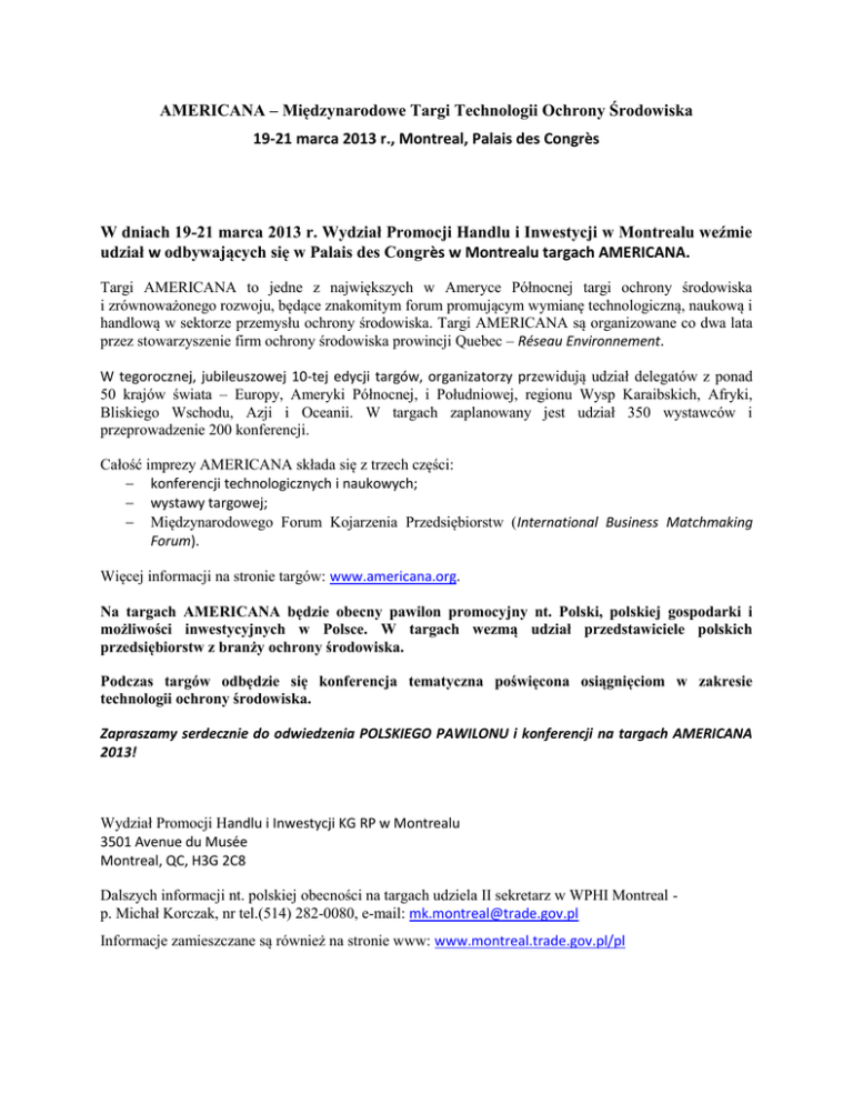 AMERICANA – Międzynarodowe Targi Technologii Ochrony Środowiska 19-21 marca 2013 r., Montreal, Palais des Congrès W dniach 19-21 marca 2013 r. Wydział Promocji Handlu i Inwestycji w Montrealu weźmie udział w odbywających się w Palais des Congrès w Montrealu targach AMERICANA. Targi AMERICANA to jedne z największych w Ameryce Północnej targi ochrony środowiska i zrównoważonego rozwoju, będące znakomitym forum promującym wymianę technologiczną, naukową i handlową w sektorze przemysłu ochrony środowiska. Targi AMERICANA są organizowane co dwa lata przez stowarzyszenie firm ochrony środowiska prowincji Quebec – Réseau Environnement. W tegorocznej, jubileuszowej 10-tej edycji targów, organizatorzy przewidują udział delegatów z ponad 50 krajów świata – Europy, Ameryki Północnej, i Południowej, regionu Wysp Karaibskich, Afryki, Bliskiego Wschodu, Azji i Oceanii. W targach zaplanowany jest udział 350 wystawców i przeprowadzenie 200 konferencji. Całość imprezy AMERICANA składa się z trzech części: konferencji technologicznych i naukowych; wystawy targowej; Międzynarodowego Forum Kojarzenia Przedsiębiorstw (International Business Matchmaking Forum). Więcej informacji na stronie targów: www.americana.org. Na targach AMERICANA będzie obecny pawilon promocyjny nt. Polski, polskiej gospodarki i możliwości inwestycyjnych w Polsce. W targach wezmą udział przedstawiciele polskich przedsiębiorstw z branży ochrony środowiska. Podczas targów odbędzie się konferencja tematyczna poświęcona osiągnięciom w zakresie technologii ochrony środowiska. Zapraszamy serdecznie do odwiedzenia POLSKIEGO PAWILONU i konferencji na targach AMERICANA 2013! Wydział Promocji Handlu i Inwestycji KG RP w Montrealu 3501 Avenue du Musée Montreal, QC, H3G 2C8 Dalszych informacji nt. polskiej obecności na targach udziela II sekretarz w WPHI Montreal p. Michał Korczak, nr tel.(514) 282-0080, e-mail: [email protected] Informacje zamieszczane są również na stronie www: www.montreal.trade.gov.pl/pl