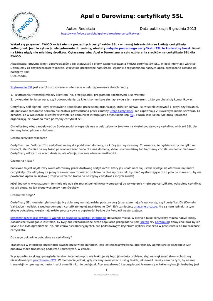 Apel o Darowiznę: certyfikaty SSL Autor: Redakcja Data publikacji: 9 grudnia 2013 http://www.fwioo.pl/article/apel-o-darowizne-certyfikaty-ssl Wstyd się przyznać, FWiOO wciąż nie ma porządnych certyfikatów SSL - w naszej infrastrukturze królują certyfikaty self-signed. Jest to sytuacja zdecydowanie do zmiany, niestety nabycie porządnego certyfikatu SSL to konkretny koszt. Koszt, na który nigdy nie mieliśmy środków. Ogłaszamy więc Apel o Darowiznę w celu uzbierania środków na certyfikaty SSL dla FWiOO. Aktualizacja: otrzymaliśmy i zdecydowaliśmy się skorzystać z oferty zasponsorowania FWiOO certyfikatów SSL. Więcej informacji wkrótce. Dziękujemy za dotychczasowe wsparcie. Wszystkie przekazane nam środki, zgodnie z regulaminem naszych apeli, przekazane zostaną na następny apel. O co chodzi? ___________________________ Szyfrowanie SSL jest szeroko stosowane w Internecie w celu zapewnienia dwóch rzeczy: 1. szyfrowania transmisji między klientem (np. przeglądarką, programem pocztowym) a serwerem; 2. uwierzytelnienia serwera, czyli udowodnienia, że klient komunikuje się naprawdę z tym serwerem, z którym chciał się komunikować. Certyfikaty self-signed - czyli wystawione i podpisane przez samą organizację, która ich używa - są w stanie zapewnić 1. (czyli szyfrowanie), ale ponieważ tożsamość serwera nie została potwierdzona przez zaufany Urząd Certyfikacji, nie zapewniają 2. (uwierzytelnienia serwera). To oznacza, że w większości klientów wyświetli się komunikat informujący o tym fakcie (np. tu). FWiOO jest już na tyle dużą i poważną organizacją, że powinna mieć porządny certyfikat SSL. Chcielibyśmy więc zaapelować do Społeczności o wsparcie nas w celu zebrania środków na 4-letni podstawowy certyfikat wildcard SSL dla domeny fwioo.pl oraz subdomen. Czemu certyfikat wildcard? Certyfikat tzw. "wildcard" to certyfikat ważny dla poddomen domeny, na którą jest wystawiony. To oznacza, że będzie ważny nie tylko na fwioo.pl, ale również na my.fwioo.pl, wioolontariat.fwioo.pl i inne domeny, które uruchomiliśmy lub będziemy chcieli uruchomić niebawem. Certyfikaty wildcard są nieco droższe, ale oferują znacznie większe możliwości. Czemu na 4 lata? Ponieważ to jest najdłuższy okres oferowany przez dostawcę certyfikatów, który jak udało nam się ustalić wydaje się oferować najtańsze certyfikaty. Chcielibyśmy za jednym zamachem rozwiązać problem na dłuższy czas tak, by mieć wystarczająco dużo pola do manewru, by nie powtarzać Apelu za szybko (i zdążyć uzbierać środki na następny certyfikat z innych źródeł). Jeżeli jednak w wyznaczonym terminie nie uda się zebrać pełnej kwoty wymaganej do wykupienia 4-letniego certyfikatu, wykupimy certyfikat na tak długo, na jak długo wystarczy nam środków. Czemu tak drogo? Certyfikaty SSL niestety tyle kosztują. My zbieramy na najbardziej podstawową (a zarazem najtańszą) wersję, czyli certyfikat DV (Domain Validation - walidacja według domeny); certyfikaty lepiej zwalidowane (OV i EV) są niestety znacznie droższe. Nie są nam jednak na tym etapie potrzebne, wersja najbardziej podstawowa w zupełności będzie dla Fundacji wystarczająca. Jesteśmy oczywiście otwarci (i wolni!) na wszelkie sugestie i informacje dotyczące miejsc, w których takie certyfikaty można nabyć taniej. Zasadnicze wymaganie jest takie, by były one rozpoznawane przez popularne przeglądarki (jak Firefox czy Chromium) domyślnie oraz by ich użycie nie było ograniczone (np. "do celów niekomercyjnych"), zaś podstawowym kryterium wyboru jest cena w przeliczeniu na rok ważności certyfikatu. Do czego dokładnie potrzebne są certyfikaty? Transmisja w Internecie przechodzi zawsze przez wiele punktów. Jeśli jest niezaszyfrowana, operator czy administrator każdego z tych punktów może transmisję podejrzeć i przeczytać. W całości. W przypadku zwykłego przeglądania stron internetowych, nie traktuje się tego jako duży problem, stąd na większość stron wchodzimy nieszyfrowanym protokołem HTTP. W momencie jednak, gdy chcemy skorzystać z usług takich, jak e-mail, zależy nam na tym, by naszej transmisji (w tym loginu, hasła, treści e-maili) nikt nie podejrzał. Aby zaszyfrować i zabezpieczyć transmisję w takien sytuacji niezbędny jest 1 WERSJA DO WYDRUKU właśnie certyfikat SSL. Dopóki usługi na naszych serwerach (jak poczta czy serwer Jabbera) uruchomione były tylko na wewnętrzne potrzeby Fundacji, nie było potrzeby kupowania certyfikatów SSL - my mogliśmy zaufać własnym, samodzielnie wystawionym certyfikatom self-signed. Ponieważ jednak przymierzamy się do uruchomienia usług dla naszych Wolontariuszy i Sympatyków, niezbędny jest porządny certyfikat SSL. Czemu nie CACert? CACert jest bardzo ciekawym rozwiązaniem podstawowego problemu z infrastrukturą SSL/TLS, czyli centralizacji kontroli nad nią w rękach kilku podmiotów, które niekoniecznie są wystarczająco przejrzyste i godne zaufania, by opierać na nich tak znaczący element infrastruktury sieciowej. Niestety, certyfikat CACert nie jest dodany do domyślnego zestawu certyfikatów większości przeglądarek, co oznacza, że nie zrealizuje nam punktu 2. (uwierzytelnienia serwera). Jeśli znajdziemy metodę serwowania certyfikatu CACert obok wykupionego (i akceptowanego przez większość przeglądarek) certyfikatu SSL, z chęcią to zrobimy. Zapraszamy do dyskusji i pomocy. Czemu nie StartSSL? StartSSL oferuje darmowe certyfikaty ważne jeden rok. Niestety, StartSSL oferuje te certyfikaty wyłącznie na użytek osobisty, w celach niekomercyjnych. Jako Fundacja mamy zarejestrowaną działalność gospodarczą i chcemy zachować możliwość otrzymywania wynagrodzenia za niektóre nasze działania (np. szkolenia), co oznacza, że nie możemy wykorzystać certyfikatu StartSSL. Zgodnie z regulaminem naszych apeli o darowiznę, ten apel zasilony został środkami, które zost