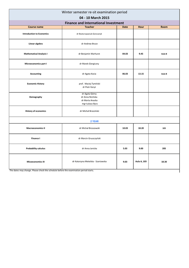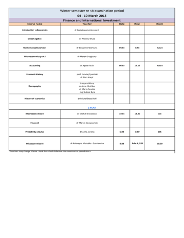 Course name Winter semester re-‐sit examination period 04 -‐ 10 March 2015 Finance and International Investment Teacher Introduction to Economics dr Beata Łopaciuk-‐Gonczaryk Linear algebra dr Andrew Bruce Mathematical Analysis I dr Benjamin Warhurst Microeconomics part I dr Marek Giergiczny Accounting dr Agata Kocia Economic History prof. Maciej Tymiński dr Piotr Koryś Demography History of economics Date Hour Room 04.03 9.45 Aula B 06.03 13.15 Aula B 10.03 18.20 103 dr Agata Górny dr Anna Nicińska dr Marta Anacka mgr Łukasz Byra dr Michał Brzeziński 2 YEAR Macroeconomics II dr Michał Brzozowski Finance I dr Marcin Gruszczyński Probability calculus dr Anna Janicka 5.03 9.00 205 Micoeconomics III dr Katarzyna Metelska -‐ Szaniawska 9.03 Aula A, 103 18.30 The dates may change. Please check the schedule before the examination period starts. Course name Winter semester re-‐sit examination period 04 -‐ 10 March 2015 International Economics Teacher 1 YEAR Date Hour Room Advanced Microeconomics prof. Tomasz Żylicz 06.03 9.45 C (1st year) dr Jan Hagemejer 04.03 18.30 104 Mathematical Methods prof. Robert Kruszewski 10.03 16.45 205 05.03 11.30 101 in Economics (1st year) Microeconometrics dr Jerzy Mycielski (1st year) International Labour Migration dr Paweł Kaczmarczyk (1st year) 2 YEAR International Finance prof. Stanisław Kubielas (2nd year) International Trade Policy prof. Jan Jakub Michałek (2nd year) International Economic Geography prof. Andrzej Cieślik (2nd year) The dates may change. Please check the schedule before the examination period starts. written essay Winter semester re-‐sit examination period Course name 04 -‐ 10 March 2015 Quantitative Finance Teacher 1 YEAR Date Hour Room 10.03 16.45 205 Mathematical Methods in Finance prof. Robert Kruszewski Ethical Standards and Financial Law dr Beata Łopaciuk-‐Gonczaryk Financial Statement Analysis dr Agata Kocia 04.03 13.15 C Macroeconomics of finance dr Juliusz Jabłecki 10.03 13.15 203 Statistics and Econometrics dr Marcin Chlebus 06.03 18.30 C prof. Tomasz Żylicz 06.03 9.45 C 2 YEAR Advanced Microeconomics dr Jan Hagemejer 04.03 18.30 104 Quantitative Strategies. High Frequency Data dr Piotr Wójcik 05.03 11.30 C C++ in Quantitative Finance part 1 dr Paweł Sakowski 10.03 11.30 E Risk Analysis and Modelling part I prof. Janusz Kudła mgr Dawid Kamiński The dates may change. Please check the schedule before the examination period starts.