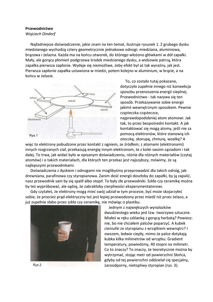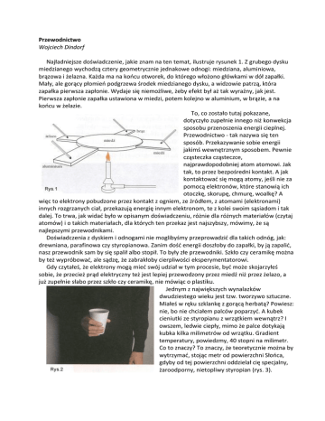 Przewodnictwo Wojciech Dindorf Najładniejsze doświadczenie, jakie znam na ten temat, ilustruje rysunek 1. Z grubego dysku miedzianego wychodzą cztery geometrycznie jednakowe odnogi: miedziana, aluminiowa, brązowa i żelazna. Każda ma na koocu otworek, do którego włożono główkami w dół zapałki. Mały, ale gorący płomieo podgrzewa środek miedzianego dysku, a widzowie patrzą, która zapałka pierwsza zapłonie. Wydaje się niemożliwe, żeby efekt był aż tak wyraźny, jak jest. Pierwsza zapłonie zapałka ustawiona w miedzi, potem kolejno w aluminium, w brązie, a na koocu w żelazie. To, co zostało tutaj pokazane, dotyczyło zupełnie innego niż konwekcja sposobu przenoszenia energii cieplnej. Przewodnictwo - tak nazywa się ten sposób. Przekazywanie sobie energii jakimś wewnętrznym sposobem. Pewnie cząsteczka cząsteczce, najprawdopodobniej atom atomowi. Jak tak, to przez bezpośredni kontakt. A jak kontaktowad się mogą atomy, jeśli nie za pomocą elektronów, które stanowią ich otoczkę, skorupę, chmurę, woalkę? A więc to elektrony pobudzone przez kontakt z ogniem, ze źródłem, z atomami (elektronami) innych rozgrzanych ciał, przekazują energię innym elektronom, te z kolei swoim sąsiadom i tak dalej. To trwa, jak widad było w opisanym doświadczeniu, różnie dla różnych materiałów (czytaj atomów) i o takich materiałach, dla których ten przekaz jest najszybszy, mówimy, że są najlepszymi przewodnikami. Doświadczenia z dyskiem i odnogami nie moglibyśmy przeprowadzid dla takich odnóg, jak: drewniana, parafinowa czy styropianowa. Zanim dośd energii doszłoby do zapałki, by ją zapalid, nasz przewodnik sam by się spalił albo stopił. To były złe przewodniki. Szkło czy ceramikę można by też wypróbowad, ale sądzę, że zabrakłoby cierpliwości eksperymentatorowi. Gdy czytałeś, że elektrony mogą mied swój udział w tym procesie, byd może skojarzyłeś sobie, że przecież prąd elektryczny też jest lepiej przewodzony przez miedź niż przez żelazo, a już zupełnie słabo przez szkło czy ceramikę, nie mówiąc o plastiku. Jednym z największych wynalazków dwudziestego wieku jest tzw. tworzywo sztuczne. Miałeś w ręku szklankę z gorącą herbatą? Powiesz: nie, bo nie chciałem palców poparzyd. A kubek cieniutki ze styropianu z wrzątkiem wewnątrz? I owszem, ledwie ciepły, mimo że palce dotykają kubka kilka milimetrów od wrzątku. Gradient temperatury, powiedzmy, 40 stopni na milimetr. Co to znaczy? To znaczy, że teoretycznie można by wytrzymad, stojąc metr od powierzchni Słooca, gdyby od tej powierzchni oddzielał cię specjalny, żaroodporny, nietopliwy styropian (rys. 3). Oto zestaw niektórych przewodników prądu elektrycznego i przewodników ciepła od najlepszych do najgorszych: Przewodniki prądu elektrycznego srebro miedź złoto aluminium mosiądz żelazo szkło parafina styropian złoto aluminium mosiądz żelazo szkło parafina styropian Przewodniki ciepła srebro miedź By prąd byt przewodzony, potrzebna jest różnica potencjałów V. Aby ciepło było przewodzone, potrzebna jest różnica temperatur T. W obu przypadkach im większy przekrój S, tym mniejszy opór, tym większa ilośd ładunku q lub energii cieplnej Q może byd w jednostce czasu przekazana; natężenie prądu I = q/t, „moc" ciepła Q/t. W obu przypadkach, im większa długośd przewodnika l, tym większy opór. Czy można się dziwid, że prawa przewodnictwa wyraża się dla obu przepływów bardzo podobnie? Dla prądu: prawo Ohma Dla ciepła: prawo Newtona Tu to tak zwane przewodnictwo właściwe, to odwrotnośd oporu właściwego; k to współczynnik przewodnictwa cieplnego lub przewodnośd cieplna; P to szybkośd przepływu energii cieplnej (moc). Wartości stałych i k (stałe materiałowe, patrz tabela 1) można napisad na naklejkach przyczepid do różnych materiałów. Informują one o jakości materiału jako przewodnika elektryczności lub ciepła k. Co one faktycznie określają? Coś w pewnym sensie podobnego do ceny: • Niech na przykład = 2 [A*m/(V*mm2)]. Czytamy z wzoru: jeśli do kooców drutu o długości 1 metra i przekroju 1 milimetra kwadratowego przyłożymy napięcie równe 1 wolt, to przez przewodnik popłynie prąd o natężeniu 2 ampery. • Niech k = 2 [W*m/(K*mm2)]. Czytamy: jeśli między koocami przewodnika o długości 1 metra i przekroju 1 milimetra kwadratowego zapewnimy różnicę temperatur równą 1 kelwin, to przez przewodnik przepłynie energia w ilości 2 dżuli na sekundę, czyli 2 waty. Jak znamy „cenę", to sobie wszystko z wzoru policzymy. A „cena" dotyczy materiału. Zapiszmy naszą tabelę, dodając „cenę" w takich jednostkach, jakie podałem w przykładach. Tabela 1 Srebro Miedź Złoto Aluminium Mosiądz Żelazo Szkło Parafina Styropia 2 n Przewodnictwo prądu elektrycznego (-przybliżona wartośd-[A*m/(V*mm )] -16 -20 -22 62 58 44 36 16 10 10 10 10 Przewodnictwo ciepła k - przybliżona wartośd - [W*m/(K*mm2)] 429 400 310 237 110 80 1 0,1 0,4 Wiadomo, że producenci urządzeo elektrycznych i cieplnych muszą z tabel tego typu korzystad, a producenci grzejników elektrycznych - z obu części jednocześnie. Lodówka (rys. 4a) to bardzo dobry przykład wykorzystania wiedzy zgromadzonej w tabeli przewodników ciepła. Tam potrzeba i dobrych przewodników, i złych. Dobrych, by odbierad energię cieplną od umieszczonych we wnętrzu jajek i masła, złych, by nie przeszkadzało w tym chłodzeniu ciepło, które mogłoby wedrzed się do środka, chodby od dośd ciepłego właściciela lodówki stojącego tuż obok i pijącego w dodatku gorącą herbatę (rys. 4b).