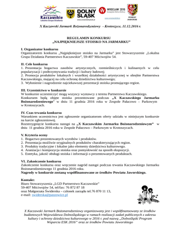 REGULAMIN KONKURSU „NAJPIĘKNIEJSZE STOISKO NA JARMARKU” I. Organizator konkursu Organizatorem konkursu „Najpiękniejsze stoisko na Jarmarku” jest Stowarzyszenie „Lokalna Grupa Działania Partnerstwo Kaczawskie”, 59-407 Mściwojów 54. II. Cele konkursu 1. Prezentacja bogactwa zasobów artystycznych, rzemieślniczych i kulinarnych w celu popularyzacji i podtrzymywania tradycji i kultury ludowej; 2. Promocja produktów lokalnych i wszelkiej działalności artystycznej w obrębie Partnerstwa Kaczawskiego, mającej na celu ochronę dziedzictwa kulturowego; 3. Wyłonienie i nagrodzenie najciekawszej prezentacji stoiska promującego region. III. Uczestnictwo w konkursie W konkursie uczestniczyć mogą wszyscy wystawcy z terenu Partnerstwa Kaczawskiego. Konkursem będą objęte stoiska prezentowane podczas „X Kaczawskiego Jarmarku Bożonarodzeniowego” w dniu 11 grudnia 2016 roku w Zespole Pałacowo – Parkowym w Krotoszycach. IV. Czas trwania konkursu Warunkiem uczestnictwa jest zgłoszenie organizatorom oferty udziału w niniejszym konkursie na karcie zgłoszeniowej. Rozstrzygnięcie konkursu nastąpi na „X Kaczawskim Jarmarku Bożonarodzeniowym” w dniu 11 grudnia 2016 roku w Zespole Pałacowo – Parkowym w Krotoszycach. V. Kryteria oceny 1. Bogactwo prezentowanych wyrobów i produktów. 2. Prezentacja możliwie oryginalnych produktów charakteryzujących region. 3. Produkty tradycyjne i lokalne jako elementy dziedzictwa kulturowego. 4. Aranżacja i kompozycja stoiska oraz pomysłowość na sposób ekspozycji. 5. Estetyka, jakość obsługi stoiska i informacji o prezentowanych produktach. VI. Zakończenie konkursu Zakończenie konkursu oraz wręczenie nagród nastąpi podczas trwania Kaczawskiego Jarmarku Bożonarodzeniowego 11 grudnia 2016 roku. Nagrody w konkursie zostaną współfinansowane ze środków Powiatu Jaworskiego. Kontakt: Biuro Stowarzyszenia „LGD Partnerstwo Kaczawskie” 59-407 Mściwojów 54, tel/fax: 76 872 87 18 oraz Małgorzata Świderska – członek zarządu tel.76 870 11 13, e-mail: [email protected] X Kaczawski Jarmark Bożonarodzeniowy organizowany jest i współfinansowany ze środków budżetowych Województwa Dolnośląskiego w ramach realizacji zadań publicznych z zakresu kultury i ochrony dziedzictwa kulturowego w 2016 r. pod nazwą „Dolnośląski Program Wsparcia ESK 2016” oraz ze środków Powiatu Jaworskiego