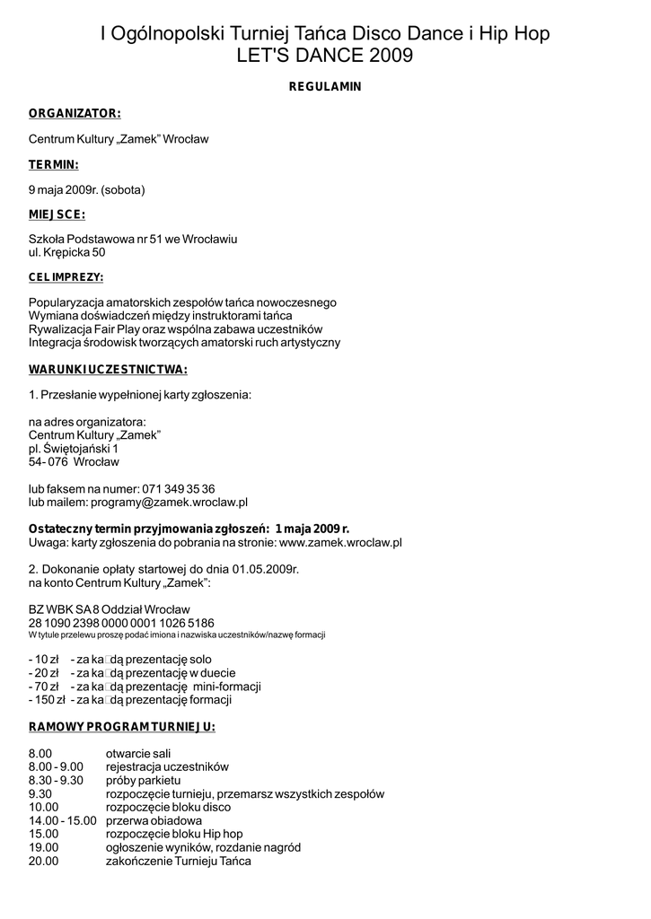 I Ogólnopolski Turniej Tańca Disco Dance i Hip Hop LET'S DANCE 2009 REGULAMIN ORGANIZATOR: Centrum Kultury „Zamek” Wrocław TERMIN: 9 maja 2009r. (sobota) MIEJSCE: Szkoła Podstawowa nr 51 we Wrocławiu ul. Krępicka 50 CEL IMPREZY: Popularyzacja amatorskich zespołów tańca nowoczesnego Wymiana doświadczeń między instruktorami tańca Rywalizacja Fair Play oraz wspólna zabawa uczestników Integracja środowisk tworzących amatorski ruch artystyczny WARUNKI UCZESTNICTWA: 1. Przesłanie wypełnionej karty zgłoszenia: na adres organizatora: Centrum Kultury „Zamek” pl. Świętojański 1 54- 076 Wrocław lub faksem na numer: 071 349 35 36 lub mailem: [email protected] Ostateczny termin przyjmowania zgłoszeń: 1 maja 2009 r. Uwaga: karty zgłoszenia do pobrania na stronie: www.zamek.wroclaw.pl 2. Dokonanie opłaty startowej do dnia 01.05.2009r. na konto Centrum Kultury „Zamek”: BZ WBK SA 8 Oddział Wrocław 28 1090 2398 0000 0001 1026 5186 W tytule przelewu proszę podać imiona i nazwiska uczestników/nazwę formacji - 10 zł - 20 zł - 70 zł - 150 zł - za każdą prezentację solo - za każdą prezentację w duecie - za każdą prezentację mini-formacji - za każdą prezentację formacji RAMOWY PROGRAM TURNIEJU: 8.00 8.00 - 9.00 8.30 - 9.30 9.30 10.00 14.00 - 15.00 15.00 19.00 20.00 otwarcie sali rejestracja uczestników próby parkietu rozpoczęcie turnieju, przemarsz wszystkich zespołów rozpoczęcie bloku disco przerwa obiadowa rozpoczęcie bloku Hip hop ogłoszenie wyników, rozdanie nagród zakończenie Turnieju Tańca KATEGORIE TANECZNE: DISCO DANCE SOLO do lat 8 (roczniki do 2001) 9 - 11 lat (roczniki 2000 - 1998) 12 - 15 lat (roczniki 1997 - 1994) powyżej 15 lat (roczniki od 1993) DUETY do 11 lat 12 - 15 lat powyżej 15 lat MINI FORMACJE (3 - 7 osób) do 11 lat 12 - 15 lat powyżej 15 lat FORMACJE (8-24 osób) do 11 lat 12 - 15 lat powyżej 15 lat HIP HOP SOLO do 11 lat (roczniki do 1998) 12 - 15 lat (roczniki 1997 - 1994) powyżej 15 lat (roczniki od 1993) DUETY do 11 lat 12 - 15 lat powyżej 15 lat MINI FORMACJE (3 - 7 osób) do 11 lat 12 - 15 lat powyżej 15 lat FORMACJE (8-24 osób) do 11 lat 12 - 15 lat powyżej 15 lat INNE FORMY TAŃCA: show, jazz, funky, towarzyski, współczesny, z pomponami, widowisko taneczne, balet i inne FORMACJE (5-24 osób) do 11 lat (roczniki do 1998) 12 - 15 lat (roczniki 1997 - 1994) powyżej 15 lat (roczniki od 1993) CZAS PREZENTACJI: - solo: 1 minuta (muzyka organizatora) - duety: 1 minuta (muzyka organizatora) - mini formacje: od 1,5 min do 2 min (muzyka własna) - formacje: od 3 do 4 minut (muzyka własna) OCENA: Turniej oceniać będzie 5 osobowe jury. Ocenie podlegać będą: - technika tańca, poziom trudności elementów - choreografia - różnorodność elementów, ustawień - pomysłowość, estetyka i dobór kostiumów - ogólny wyraz artystyczny NAGRODY: - Jury przyzna medale za I, II i III miejsca w występach solowych i duetach oraz puchary za I, II i III miejsca w występach mini formacji i formacji. - Wszyscy finaliści otrzymują dyplomy. PODCZAS TURNIEJU DZIAŁAJĄ: - kierownik turnieju - komisja sędziowska - opieka medyczna - punkt informacyjny INFORMACJE UZUPEŁNIAJĄCE: - Ilość miejsc w turnieju jest ograniczona. O zakwalifikowaniu się decyduje kolejność zgłoszeń. - Wymiary parkietu: 11m x 11m - O przynależności do kategorii wiekowej, we wszystkich konkurencjach decyduje wiek najstarszego uczestnika. - Solo i duety w rundach eliminacyjnych i półfinałowych - prezentacja w grupach, w finałach - prezentacja indywidualna. - Każdy uczestnik może być członkiem tylko jednej formacji oraz jednej mini formacji w danej kategorii wiekowej i tanecznej. - W przypadku zbyt małej ilości zgłoszeń organizator zastrzega sobie prawo do łączenia kategorii wiekowych oraz zmiany ramowego programu w przypadku małej lub zbyt dużej frekwencji. - Płytę CD z muzyką do której tańczy zespół należny przekazać akustykowi 15 minut przed występem. - Wszystkie zespoły biorące udział w turnieju przyjeżdżają na koszt własny lub instytucji delegującej. - Każdy zespół powinien posiadać odpowiednią liczbę opiekunów. - Organizator nie ubezpiecza uczestników turnieju. - Organizator zapewnia opiekę medyczną podczas trwania turnieju. - Organizator nie odpowiada za rzeczy pozostawione w szatniach. - W trakcie turnieju czynny będzie punk gastronomiczny. - Organizator zastrzega sobie prawo do filmowania i fotografowania imprezy w celach dokumentacyjnych. - W przypadku odwołania uczestnictwa po 5 maja, opłata startowa nie podlega zwrotowi. - Zgłoszenie udziału w turnieju oznacza akceptację regulaminu. - Opiekunowie przesyłając zgłoszenie, potwierdzają brak przeciwskazań lekarskich do udziału w turnieju zgłoszonych tancerzy. - O sprawach nie ujętych w niniejszym regulaminie lub spornych decyduje Kierownictwo Turnieju (w porozumieniu z sędzią głównym). - Dodatkowych informacji udziela: Joanna Boś tel: 071 349 32 81 w. 25, e-mail: [email protected] Honorata Wilanowska: 601 93 85 78, e-mail: [email protected]