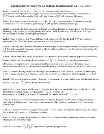 Zadania przygotowawcze na konkurs matematyczny „EUKLIDES” Zad.1. Punkty A = (1;2), B = (-1;-1), C = (5;2) są wierzchołkami trójkąta. a) Napisz równanie prostej zawierającej wysokość tego trójkąta poprowadzoną z wierzchołka A. b) Wyznacz współrzędne punktu D tak , aby czworokąt ABCD był równoległobokiem. Zad.2. Cięciwą okręgu o równaniu x2 + y2 + 4x - 2y - 20 = 0 jest odcinek AB zawarty w prostej o równaniu x + y - 6 = 0. Oblicz pole trójkąta ABO, gdzie O jest środkiem okręgu. Zad.3. Leśna szkółka doświadczalna ma kształt prostokąta, którego przekątna jest o 1 m dłuŜsza od dłuŜszego boku prostokąta. Gdyby powiększyć o 3m kaŜdy wymiar tego prostokąta, to przekątna zwiększyłaby się o 4m. Oblicz wymiary szkółki. Zad.4. Cena towaru wraz z 7% podatkiem VAT jest równa 85,60 zł. Podatek VAT na ten towar podniesiono do 22%. Oblicz o ile procent wzrosła cena tego towaru? Zad.5. Sadownik miał posadzić 200 drzewek owocowych w określonym terminie. Sadząc kaŜdego dnia o 5 drzewek więcej niŜ było przewidziane w planie, sadzenie zakończył na dwa dni przed terminem. Ile dni trwało sadzenie drzew? Zad.6. Jednokierunkowa droga o szerokości 8 m prowadzi przez tunel. Przekrój poprzeczny tunelu ma 3 8 kształt zbliŜony do łuku paraboli o równaniu y = − x 2 + 6 . Sprawdź, wykonując odpowiednie obliczenia, czy cięŜarówka wioząca prostopadłościenny kontener o szerokości 4,8 metra, moŜe przejechać tym tunelem, jeŜeli najwyŜszy punkt kontenera znajduje się znajduję się 4 metry nad drogą. Zad.7. Samolot, którego prędkość własna jest równa 900km/h, leci 5500km z wiatrem i 4500km pod wiatr, wiejący z taką samą prędkością. Czasy obu przelotów są jednakowe. Jaka jest prędkość wiatru? Zad.8. Pole rombu jest równe 60 cm2. DłuŜsza przekątna rombu podzieliła kąt ostry na takie dwa kąty o mierze α , Ŝe tgα = 8 . Oblicz długość boku rombu. 15 Zad.9. Wykresem funkcji kwadratowej f jest parabola, której wierzchołkiem jest punkt W = (1, 4). Najmniejsza wartość funkcji f w przedziale <−2, 2> wynosi −5. Przedstaw wzór funkcji f w postaci iloczynowej. RozwiąŜ nierówność f ( x) < 0 . Zad.10. W trójkącie równoramiennym podstawa AB ma długość 8cm. Promień okręgu, stycznego w punktach A i B do prostych zawierających ramiona AC i BC trójkąta, ma długość 5cm. Oblicz pole trójkąta ABC. Zad.11. Cztery liczby tworzą ciąg geometryczny. Trzecia liczba jest większa od pierwszej o 9, a druga jest większa od czwartej o 18. Wyznacz ten ciąg. Zad.12. Cenę pewnego towaru podwyŜszono o 20%, a następnie obniŜono do początkowej wartości. O jaki procent obniŜono cenę? Zad.13. WyraŜenie 2164 ⋅ 6 2 − 2166 przedstaw w postaci potęgi liczby 2. 2 − 23 ⋅ 2 48 Przyjmując, Ŝe 210 ≈ 1000 zapisz przybliŜenie otrzymanej liczby w postaci a ⋅ 10 k , gdzie a ∈< 1,10) , k ∈C . Zad.14. Punkty A = (0, 3) i B = (4, 5) są wierzchołkami trójkąta równoramiennego ABC, w którym AB = BC . Wysokość BD trójkąta zawiera się w prostej o równaniu 3x − y − 7 = 0. Oblicz: Współrzędne wierzchołka C. Pole trójkąta ABC. Zad.15. W wycinek koła o promieniu 3 dm wpisano okrąg o promieniu 1 dm. Oblicz pole wycinka koła. Wynik podaj z dokładnością do 10 cm2. Zad.16. Miejscami zerowymi funkcji kwadratowej f są liczby −6 oraz 1. Oblicz wartość wyraŜenia 3 ⋅ f (94) . f (−24) Zad.17. Z kwadratu odcięto ćwiartkę koła o promieniu równym długości boku kwadratu. Następnie w pozostałą figurę wpisano koło, którego pole jest równe π . Oblicz długość boku kwadratu. Wynik przedstaw w postaci a + b c , gdzie a, b, c są liczbami naturalnymi. Zad.18. Wyznacz równanie symetralnej odcinka o końcach A = (−2, −3), i B = (10, 3). Zad.19. Długości boków trójkąta prostokątnego tworzą ciąg arytmetyczny. Najkrótszy bok ma długość 6 cm. Oblicz: a) Pole tego trójkąta. b) Długość promienia okręgu opisanego na trójkącie. c) Długość promienia okręgu wpisanego w trójkąt. Zad.20. Oblicz: a) 6−4 2 + 6+4 2 = b) 9−4 5 − 9+4 5 = c) 3 20 − 14 2 + 3 20 + 14 2 = Zad.21. Właściciel drukarni zaopatruje się w papier w odległych o 250 km zakładach papierniczych lub w oddalonej o 20 km hurtowni. U producenta cena jednej ryzy papieru wynosi 20 zł, a w hurtowni jest o 30% wyŜsza. Zakupiony papier przywozi do drukarni firma transportowa, która pobiera opłatę w wysokości 1 zł 60 gr. za kilometr ( niezaleŜnie od wielkości ładunku). Niech KP(n), KH(n) oznaczają całkowite koszty zakupu n ryz. a) Podaj wzory funkcji KP(n) oraz KH(n). b) Przy jakiej liczbie ryz korzystniej dla właściciela drukarni jest zaopatrywać siew papier u producenta? Zad.22. Punkty A = (1, 2), B = (_1, 0), C = (2, –2) są wierzchołkami trójkąta ABC. Napisz równanie prostej zawierającą wysokość poprowadzoną z wierzchołka C. Zad.23. W trójkącie równoramiennym ABC, w którym AC = BC dane są: A = (−3, 2), E = (1, 0), gdzie punkt E jest środkiem boku AB, oraz równanie prostej, w której zawarty jest bok BC: y = −x + 7. Wyznacz współrzędne pozostałych wierzchołków trójkąta oraz jego pole.