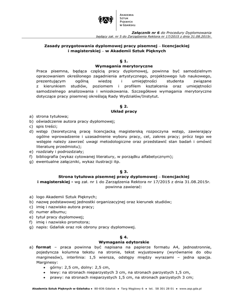 Załącznik nr 6 do Procedury Dyplomowania będący zał. nr 5 do Zarządzenia Rektora nr 17/2015 z dnia 31.08.2015r. Zasady przygotowania dyplomowej pracy pisemnej – licencjackiej i magisterskiej – w Akademii Sztuk Pięknych § 1. Wymagania merytoryczne Praca pisemna, będąca częścią pracy dyplomowej, powinna być samodzielnym opracowaniem określonego zagadnienia artystycznego, projektowego lub naukowego, prezentującym ogólną wiedzę i umiejętności studenta związane z kierunkiem studiów, poziomem i profilem kształcenia oraz umiejętności samodzielnego analizowania i wnioskowania. Szczegółowe wymagania merytoryczne dotyczące pracy pisemnej określają Rady Wydziałów/Instytut. § 2. Układ pracy a) b) c) d) strona tytułowa; oświadczenie autora pracy dyplomowej; spis treści; wstęp (teoretyczną pracę licencjacką magisterską rozpoczyna wstęp, zawierający ogólne wprowadzenie i uzasadnienie wyboru pracy, cel, zakres pracy; prócz tego we wstępie należy zawrzeć uwagi metodologiczne oraz przedstawić stan badań i omówić literaturę przedmiotu); e) rozdziały i podrozdziały; f) bibliografia (wykaz cytowanej literatury, w porządku alfabetycznym); g) ewentualne załączniki, wykaz ilustracji itp. § 3. Strona tytułowa pisemnej pracy dyplomowej – licencjackiej i magisterskiej - wg zał. nr 1 do Zarządzenia Rektora nr 17/2015 z dnia 31.08.2015r. powinna zawierać: a) b) c) d) e) f) g) logo Akademii Sztuk Pięknych; nazwę podstawowej jednostki organizacyjnej oraz kierunek studiów; imię i nazwisko autora pracy; numer albumu; tytuł pracy dyplomowej; imię i nazwisko promotora; napis: Gdańsk oraz rok obrony pracy dyplomowej. § 4. Wymagania edytorskie a) format – praca powinna być napisana na papierze formatu A4, jednostronnie, pojedyncza kolumna tekstu na stronie, tekst wyjustowany (wyrównanie do obu marginesów), interlinia: 1,5 wiersza, odstępy między wyrazami – jedna spacja. Marginesy: • górny: 2,5 cm, dolny: 2,5 cm, • lewy: na stronach nieparzystych 3 cm, na stronach parzystych 1,5 cm, • prawy: na stronach nieparzystych 1,5 cm, na stronach parzystych 3 cm; Akademia Sztuk Pięknych w Gdańsku ● 80-836 Gdańsk ● Targ Węglowy 6 ● tel. 58 301 28 01 ● www.asp.gda.pl b) akapity – pierwszy wiersz zaczyna się konsekwentnie w całym tekście wcięciem specjalnym 0,5; c) czcionka – czcionkę różnicujemy następująco • tekst główny zapisujemy Times New Roman 12, niepogrubione pismo, • tytuł rozdziału (na początku strony) zapisujemy czcionką Times New Roman 13, pogrubioną, • tytuł podrozdziału zapisujemy Times New Roman 12, pogrubioną, tytuł zapisujemy od nowego wiersza w ciągu tekstu rozdziału; d) dzielenie i przenoszenie wyrazów – dzielenie wyrazów automatyczne, koniec wiersza nie może być zakończony pojedynczą literą ani spójnikiem, należy je przenieść do następnego wiersza za pomocą twardej spacji (jednocześnie wciśnięte klawisze Ctrl + Shift + spacja); e) wyliczenia – wyliczenia robimy za pomocą punktorów, jednakowo w całym tekście, odstępy między wyliczeniami stałe; f) numeracja stron – zgodna z układem pracy (zob. § 2), wstawiamy ją automatycznie, położenie numeru: na dole strony, wyrównanie zewnętrzne, kolejność następująca: • strona pierwsza /tytułowa/ – wzór zał. nr 1 do Zarządzenia Rektora nr 17/2015 z dnia 31.08.2015r. (bez numeru strony); • druga strona – oświadczenie autora pracy /wzór w załączniku nr 2/ zamieszcza się jako następną stronę po tytułowej, już numerowaną jako 2; • trzecia strona zawiera spis treści - uwzględnia się w nim wszystkie części składowe pracy: od rozdziałów, przez podrozdziały, po ewentualnie dalszy podział, ze wskazaniem stron, na których się rozpoczynają; spis treści zawiera również bibliografię oraz spis załączników; g) liczba znaków tekstu pisemnej pracy dyplomowej musi wynosić: • minimum 80 tysięcy znaków dla prac licencjackich pisanych w Międzywydziałowym Instytucie Nauk o Sztuce, • minimum 140 tysięcy znaków dla prac magisterskich pisanych w Międzywydziałowy Instytucie Nauk o Sztuce, • minimum 22 tysiące znaków dla prac pisanych na pozostałych Wydziałach; h) liczba cytowań nie powinna przekraczać 20% objętości całości tekstu pracy; i) przypisy i bibliografia – praca powinna być opatrzona przypisami i zawierać bibliografię zgodne z podanymi dalej normami; a) tabele i reprodukcje (ilustracje, ryciny itd.) – każda tabela i reprodukcja powinna mieć tytuł, a numerujemy te elementy następująco • tabele należy numerować w kolejności w całej pracy, ich opis umieszcza się nad tabelą, • reprodukcje (ilustracje, ryciny) należy numerować w kolejności w całej pracy, ich opis umieszcza się pod reprodukcją, • tabele i reprodukcje nie mogą być dzielone stronami; wraz z tytułem muszą być sformatowane w całości na stronie. § 5. Zasady redagowania tekstu pisemnej pracy dyplomowej a) interpunkcja - stosujemy pojedyncze spacje po kropkach, przecinkach, dwukropkach, średnikach itd.; nie stosujemy spacji przed pytajnikiem i wykrzyknikiem ani przed znakiem zamknięcia cytatu; nie ma spacji między znakiem waluty a kwotą ($45.000); używamy kropek lub pauz do zapisu liczb tysięcy (10.000 lub 10 000), przecinków do zapisu ułamków dziesiętnych itd. (0,15); Akademia Sztuk Pięknych w Gdańsku ● 80-836 Gdańsk ● Targ Węglowy 6 ● tel. 58 301 28 01 ● www.asp.gda.pl daty i czas • jeśli chodzi o czas, preferujemy zapis dwudziestoczterogodzinny (08:00, 13:30), • daty piszemy w następującym porządku: poniedziałek, 16 października 2000 roku (bez przecinków między miesiącem i rokiem), • preferujemy zapis stuleci w pełnym brzmieniu słownym (dwudziesty wiek), • preferujemy dla określeń typu „lata trzydzieste” zapis słowny. c) pismo proste, podkreślenia i kursywa • powinno się unikać nadmiernego wyróżniania kurs