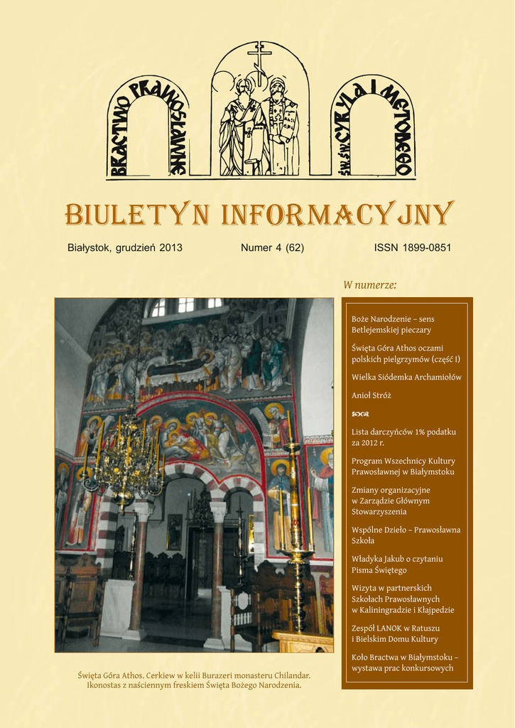 BIULETYN INFORMACYJNY Białystok, grudzień 2013 Numer 4 (62) ISSN 1899-0851 W numerze: Boże Narodzenie – sens Betlejemskiej pieczary Święta Góra Athos oczami polskich pielgrzymów (część I) Wielka Siódemka Archamiołów Anioł Stróż Lista darczyńców 1% podatku za 2012 r. Program Wszechnicy Kultury Prawosławnej w Białymstoku Zmiany organizacyjne w Zarządzie Głównym Stowarzyszenia Wspólne Dzieło – Prawosławna Szkoła Władyka Jakub o czytaniu Pisma Świętego Wizyta w partnerskich Szkołach Prawosławnych w Kaliningradzie i Kłajpedzie Zespół LANOK w Ratuszu i Bielskim Domu Kultury Święta Góra Athos. Cerkiew w kelii Burazeri monasteru Chilandar. Ikonostas z naściennym freskiem Święta Bożego Narodzenia. 1 Koło Bractwa w Białymstoku – wystawa prac konkursowych Nasze Prawosławie Boże Narodzenie – sens Betlejemskiej pieczary Prawosławie na świecie Stwórca, przyjmując obraz Swojego stworzenia „uniża się”, dokonuje tego, co po grecku nazywamy kenozą (kenosis) a po starocerkiewnosłowiańsku „istoszczanije” (samouniżenie, ogołocenie – przyp. red.). Ewangelista Łukasz pisze: „I stało się w owe dni, że wyszedł dekret cesarza Augusta, aby spisano cały świat. Pierwszy ten spis odbył się, gdy Kwiryniusz był namiestnikiem Syrii. Szli więc wszyscy do spisu, każdy do swego miasta. Poszedł też i Józef z Galilei, z miasta Nazaretu, do Judei, do miasta Dawidowego, zwanego Betlejem, dlatego, że był z domu i z rodu Dawida, Aby był spisany wraz z Marią, poślubioną sobie małżonką, która była brzemienna. I gdy tam byli, nadszedł czas, aby porodziła. I porodziła syna swego pierworodnego, i owinęła go w pieluszki, i położyła go w żłobie, gdyż nie było dla nich miejsca w gospodzie” (Łk 2, 1–7, wg tłum. wyd. Brytyjskie i Zagraniczne Towarzystwo Biblijne). Dokładnie tak – w jaskini, przeznaczonej dla bydła, pośród słomy i siana, porozrzucanych jako pokarm i podściółka dla zwierząt, w chłodną zimową noc, w okolicznościach, pozbawionych nie tyle ziemskiego majestatu, dostojeństwa, co nawet minimalnych wygód – narodził się Bogoczłowiek, Zbawiciel świata. Taką, nieodpowiednią dla Świętej Rodziny, podróż przez całą Palestynę objaśnia się tym, że Rzymianie byli spisywani według miejsca swojego zamieszkania, natomiast Żydzi według miejsca pochodzenia. Józef i Maria, jak wiadomo, byli potomkami króla Dawida, rodem z Betlejem, położonego w siedmiu kilometrach na południowy zachód od Jerozolimy. Przedstawiciele tej dynastii byli pozbawieni tronu jeszcze w VI w. p.n.e. i prowadzili życie zwykłych obywateli, nie afiszując się swym pochodzeniem. Ikona Bożego Narodzenia – Serbia, XVII w. Święta Góra Athos oczami polskich pielgrzymów (część I) „I zobaczył Bóg, że było dobre”…, i nadal jest dobre! Ziemia została stworzona przez Boga by być rajem. Była dobra i miała wiecznie służyć człowiekowi. Być mu domem i świątynią zarazem. Miejscem gdzie patrząc na otaczającą przyrodę będzie on wysławiał Doskonałego Stwórcę. Miała się stać Ewangelią zapisaną zakolami rzek i linijkami gór. Miała być naszą nagrodą za miłość do Niebiańskiego Ojca. Ziemia miała być rajem. Patrząc obiektywnie nadal nim jest. Niesie nam w darze wszystko, co jest niezbędne do „wygodnego i dostatniego życia”. Wegetarianin znajdzie na niej bogactwo flory nie do przejedzenia. Amator dziczyzny ma równie bogatą dietę. Człowiek oddychając wydycha dwutlenek węgla, który w fotosyntezie rośliny przerobią na życiodajny tlen. Wieczne zmarzliny Antarktydy i Arktyki magazynują dla nas zapasy słodkiej wody. Gdzie tylko się nie obejrzymy ujrzymy służbę przyrody wobec człowieka. To nie ziemia się zmieniła, a człowiek. Ona nie odrzuciła powierzonego jej przez Stwórcę zadania, to człowiek zdradził boskie ideały. Zamiast nadal być opiekunem stworzenia stał się jego destruktorem. Nie uświęca a niszczy. Miał otulić świat miłością i modlitwą. Pokrył go zaś nienawiścią i egoizmem. Nie dziwmy się więc, że ziemia zaczęła mu rodzić chwasty. Gdybyśmy tylko potrafili odrodzić jej pierwotne piękno… Potrafimy? Zgodnie z cerkiewną tradycją pierwszą głosicielką Ewangelii na Athosie była sama Przenajświętsza Bogarodzica. Gdy po Pięćdziesiątnicy św. św. Apostołowie, rzucając losy określą gdzie udadzą się z misją, Przenajświętszej w udziale przypadła Gruzja. Statek Jej zepchnięty został przez burzę morska ku brzegom Athosu. Tu czekali na Nią rdzenni mieszkańcy, do których w pogańskich świątyniach przemówiły posągi bóstw, nakazując im iść nad brzeg na spotkanie Matki Jedynego Prawdziwego Boga. Przenajświętsza nauczyła ich prawdziwej wiary. Pierwsze monastery miały tu powstać jeszcze za czasów św. Konstantyna Wielkiego w IV w. Potwierdzone historycznie dane mamy dopiero z okresu przed ikonoklazmem – VIII w. W historii ikony Bogarodzicy Iwierskiej mówi się, że gdy przybyła ona na Athos w czasach ikonoklazmu istniały już tu dobrze zorganizowane wspólnoty. Delegacja Św. Góry uczestniczyła też na soborze 843 r. potępiającym ikonoklazm. Wspólnotowe życie monastyczne na Athosie było więc w tym czasie już bardzo dobrze zorganizowane, miało za sobą dłuższą historię kształtowania się. Pustelnicze życie musiało się rozwijać znacznie wcześniej. Poza niezbyt obszernymi ewangelicznymi świadectwami o narodzeniu Chrystusa, szereg szczegółów dotyczących pojawienia się na świecie Zbawiciela znajdziemy w dwóch źródłach apokryficznych: „Protoewangelii Jakuba” oraz „Ewangelii Pseudo-Mateusza”. Zgodnie z tymi apokryfami, gdy Maria poczuła, że poród się rozpoczyna, Józef poszedł szukać akuszerki. Powróciwszy zobaczyli oni, że poród już się zakończył, a w jaskini zajaśniała światłość takiej mocy, której nie byli w stanie znieść. Dopiero po p