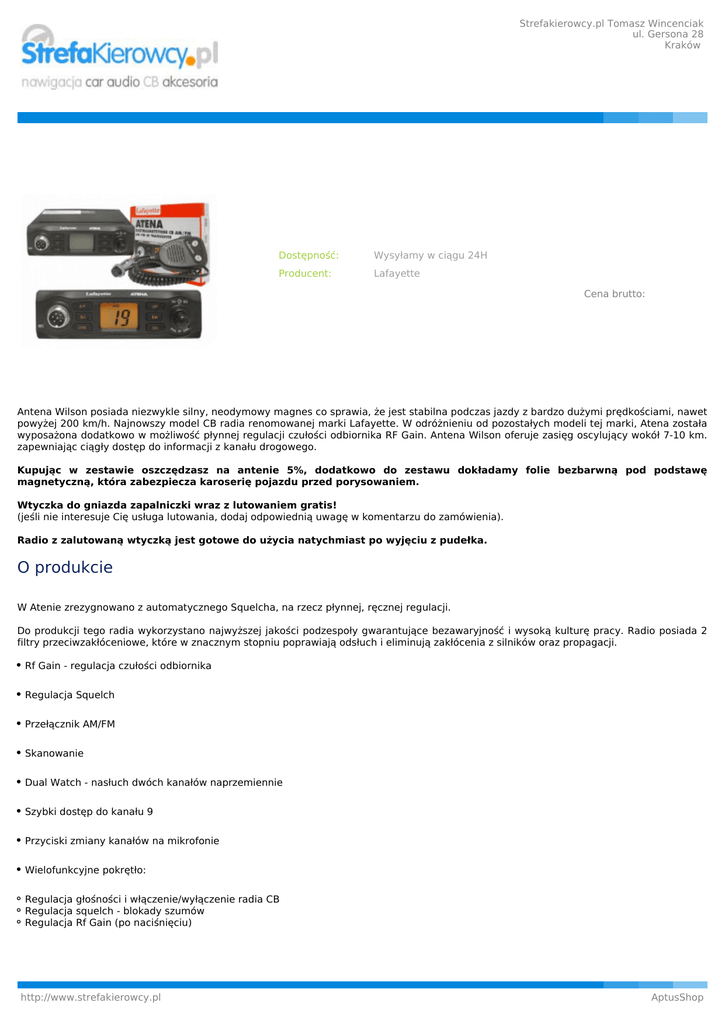Strefakierowcy.pl Tomasz Wincenciak ul. Gersona 28 Kraków Dostępność: Wysyłamy w ciągu 24H Producent: Lafayette Cena brutto: Antena Wilson posiada niezwykle silny, neodymowy magnes co sprawia, że jest stabilna podczas jazdy z bardzo dużymi prędkościami, nawet powyżej 200 km/h. Najnowszy model CB radia renomowanej marki Lafayette. W odróżnieniu od pozostałych modeli tej marki, Atena została wyposażona dodatkowo w możliwość płynnej regulacji czułości odbiornika RF Gain. Antena Wilson oferuje zasięg oscylujący wokół 7-10 km. zapewniając ciągły dostęp do informacji z kanału drogowego. Kupując w zestawie oszczędzasz na antenie 5%, dodatkowo do zestawu dokładamy folie bezbarwną pod podstawę magnetyczną, która zabezpiecza karoserię pojazdu przed porysowaniem. Wtyczka do gniazda zapalniczki wraz z lutowaniem gratis! (jeśli nie interesuje Cię usługa lutowania, dodaj odpowiednią uwagę w komentarzu do zamówienia). Radio z zalutowaną wtyczką jest gotowe do użycia natychmiast po wyjęciu z pudełka. O produkcie W Atenie zrezygnowano z automatycznego Squelcha, na rzecz płynnej, ręcznej regulacji. Do produkcji tego radia wykorzystano najwyższej jakości podzespoły gwarantujące bezawaryjność i wysoką kulturę pracy. Radio posiada 2 filtry przeciwzakłóceniowe, które w znacznym stopniu poprawiają odsłuch i eliminują zakłócenia z silników oraz propagacji. Rf Gain - regulacja czułości odbiornika Regulacja Squelch Przełącznik AM/FM Skanowanie Dual Watch - nasłuch dwóch kanałów naprzemiennie Szybki dostęp do kanału 9 Przyciski zmiany kanałów na mikrofonie Wielofunkcyjne pokrętło: Regulacja głośności i włączenie/wyłączenie radia CB Regulacja squelch - blokady szumów Regulacja Rf Gain (po naciśnięciu) http://www.strefakierowcy.pl AptusShop Strefakierowcy.pl Tomasz Wincenciak ul. Gersona 28 Kraków Wyświetlacz LCD w kolorze bursztynowym Dane techniczne Ogólne Nadajnik: Synteza PLL kontrolowana rezonatorem kwarcowym Odbiornik: Superheterodyna z podwójną przemianą Napięcie zasilania: DC 13.8 V Impedancja anteny: 50 ? Temperatura: -10 °C ~ +50 °C Krok: 10 kHz Wymiary: 142 (D) x 125 (W) x 42(D) mm Nadajnik Moc: 4W Zakres częstotliwości: 40 kanałów - 26.960 ~ 27.400 MHz Tolerancja częstotliwości: ?500 Hz Czułość modulacji: 6mV (1.25 kHz input) Głębokość modulacji: AM: 90 %, FM: 2 kHz Odbiornik Czułość: AM: 0.5 ?V (s/n 10dB) FM: 0.3 ?V (sinad 12dB) Squelch: 0.5 ?V Auto Squelch: 0.3 ?V S/n ratio: 40 dB Zniekształcenia: 5 % Charakterystyka anteny częstotliwość : 26 - 28,5 Mhz zysk: + 4 dB impedancja : 50 ohm moc max : 300W SWR: 1,1 do 1,2 średnica magnesu: 100 mm wysokość: około 980 mm długość kabla: 4,5 m masa: 1 kg W zestawie radiotelefon mikrofon uchwyt montażowy zawieszka do mikrofonu deklaracja zgodności CE (homologacja) instrukcja antena Wilson Little Wil (promiennik + podstawa magnetyczna + kabel z zalutowaną wtyczką) podkładka bezbarwna na karoserię kluczyk imbusowy do montażu http://www.strefakierowcy.pl AptusShop