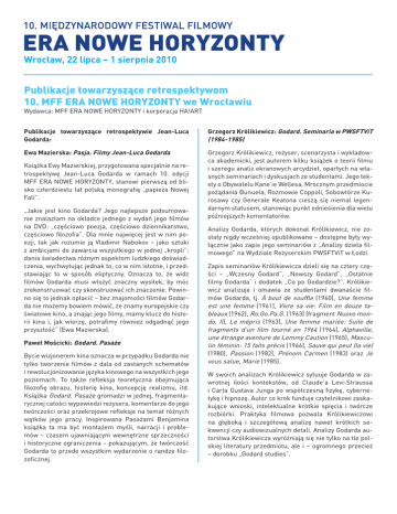 Publikacje towarzyszące retrospektywom 10. MFF ERA NOWE HORYZONTY we Wrocławiu Wydawca: MFF ERA NOWE HORYZONTY i korporacja HA!ART Publikacje towarzyszące retrospektywie Jean-Luca Godarda: Grzegorz Królikiewicz: Godard. Seminaria w PWSFTViT (1984-1985) Ewa Mazierska: Pasja. Filmy Jean-Luca Godarda Grzegorz Królikiewicz, reżyser, scenarzysta i wykładowca akademicki, jest autorem kilku książek o teorii filmu i szeregu analiz ekranowych arcydzieł, opartych na własnych seminariach i dyskusjach ze studentami. Jego teksty o Obywatelu Kane’ie Wellesa, Mrocznym przedmiocie pożądania Bunuela, Rozmowie Coppoli, Sobowtórze Kurosawy czy Generale Keatona cieszą się niemal legendarnym statusem, stanowiąc punkt odniesienia dla wielu późniejszych komentatorów. Książka Ewy Mazierskiej, przygotowana specjalnie na retrospektywę Jean-Luca Godarda w ramach 10. edycji MFF ERA NOWE HORYZONTY, stanowi pierwszą od blisko czterdziestu lat polską monografię „papieża Nowej Fali”. „Jakie jest kino Godarda? Jego najlepsze podsumowanie znalazłam na okładce jednego z wydań jego filmów na DVD: „częściowo poezja, częściowo dziennikarstwo, częściowo filozofia”. Dla mnie najwięcej jest w nim poezji, tak jak rozumie ją Vladimir Nabokov – jako sztuki z ambicjami do zawarcia wszystkiego w jednej „kropli”: dania świadectwa różnym aspektom ludzkiego doświadczenia, wychwytując jednak to, co w nim istotne, i przedstawiając to w sposób eliptyczny. Oznacza to, że widz filmów Godarda musi włożyć znaczny wysiłek, by móc zrekonstruować czy skonstruować ich znaczenie. Powinno się to jednak opłacić – bez znajomości filmów Godarda nie możemy bowiem mówić, że znamy europejskie czy światowe kino, a znając jego filmy, mamy klucz do historii kina i, jak wierzę, potrafimy również odgadnąć jego przyszłość” (Ewa Mazierska). Paweł Mościcki: Godard. Pasaże Bycie wizjonerem kina oznacza w przypadku Godarda nie tylko tworzenie filmów z dala od zastanych schematów i rewolucjonizowanie języka kinowego na wszystkich jego poziomach. To także refleksja teoretyczna obejmująca filozofię obrazu, historię kina, koncepcję realizmu, itd. Książka Godard. Pasaże gromadzi w jednej, fragmentarycznej całości wypowiedzi reżysera, komentarze do jego twórczości oraz przekrojowe refleksje na temat różnych wątków jego pracy. Inspirowana Pasażami Benjamina książka ta ma być montażem myśli, narracji i problemów – czasem ujawniającym wewnętrzne sprzeczności i historyczne ograniczenia – pokazującym, że twórczość Godarda to przede wszystkim wydarzenie o randze filozoficznej. Analizy Godarda, których dokonał Królikiewicz, nie zostały nigdy wcześniej opublikowane – dostępne były wyłącznie jako zapis jego seminariów z „Analizy dzieła filmowego” na Wydziale Reżyserskim PWSFTViT w Łodzi. Zapis seminariów Królikiewicza dzieli się na cztery części – „Wczesny Godard”, „Nowszy Godard”, „Ostatnie filmy Godarda” i dodatek „Co po Godardzie?”. Królikiewicz analizuje i omawia ze studentami dwanaście filmów Godarda, tj. À bout de souffle (1960), Une femme est une femme (1961), Vivre sa vie: Film en douze tableaux (1962), Ro.Go.Pa.G. (1963) (fragment Nuovo mondo, Il), Le mépris (1963), Une femme mariée: Suite de fragments d’un film tourné en 1964 (1964), Alphaville, une étrange aventure de Lemmy Caution (1965), Masculin féminin: 15 faits précis (1966), Sauve qui peut (la vie) (1980), Passion (1982), Prénom Carmen (1983) oraz Je vous salue, Marie (1985). W swoich analizach Królikiewicz sytuuje Godarda w zawrotnej ilości kontekstów, od Claude’a Levi-Straussa i Carla Gustava Junga po współczesną fizykę, cybernetykę i hipnozę. Autor co krok funduje czytelnikowi zaskakujące wnioski, intelektualne krótkie spięcia i twórcze rozbiórki. Praktyka filmowa pozwala Królikiewiczowi na głęboką i szczegółową analizę nawet krótkich sekwencji czy audiowizualnych detali. Analizy Godarda autorstwa Królikiewicza wyróżniają się nie tylko na tle polskiej literatury przedmiotu, ale i – ogromnego przecież – dorobku „Godard studies”. Publikacje towarzyszące retrospektywie Wojciecha Jerzego Hasa: Festiwal dofinansował również publikację którą można już kupić w księgarniach całego kraju: HAS pod redakcją Roberta Kardzisa Marcin Maron: Dramat czasu i wyobraźni. Filmy Wojciecha J. Hasa (wyd. UNIVERSITAS, Kraków 2010) Wystawie poświęconej Jerzemu Wojciechowi Hasowi będzie towarzyszył katalog, w którym znajdzie się rozbudowana, możliwe najbardziej szczegółowa z dotychczas opublikowanych biografia J. W. Hasa. Miejsce typowych dla tego typu publikacji tekstów krytycznych zajmą fotosy, zdjęcia z planów filmowych oraz fotografie prywatne, którymi spróbujemy opowiedzieć o życiu i twórczości wybitnego reżysera. Dzieje grzechu. Surrealizm w kinie polskim / Story of Sin. Surrealism in Polish Cinema pod redakcją Kuby Mikurdy i Kamili Wielebskiej (publikacja dwujęzyczna) Obraz polskiego kina, który wyłania się na podstawie publikacji, konferencji i komentarzy zachodnich filmoznawców sprowadza się zwykle do trzech dominujących tradycji filmowych: Szkoły Polskiej, kina moralnego niepokoju i polskiego surrealizmu filmowego. O dwóch pierwszych pisali szeroko zarówno badacze polscy, jak i zagraniczni. O tej trzeciej polski czytelnik dowiaduje się niemal wyłącznie z rozproszonych artykułów publikowanych w zachodniej prasie filmowej. Dzieje grzechu. Surrealizm w kinie polskim – wyczerpująca, pionierska publikacja z udziałem autorów z Polski i Wielkiej Brytanii – wypełnia tę poważną lukę. Książka Dzieje grzechu spełnia podwójną funkcję – przed czytelnikiem polskim odsłania „źle obecne”, nieoczywiste, alternatywne oblicze rodzimej kinematografii; dla czytelnika anglojęzycznego zaś stanowi bezcenny przewodnik po surrealistycznej terra 