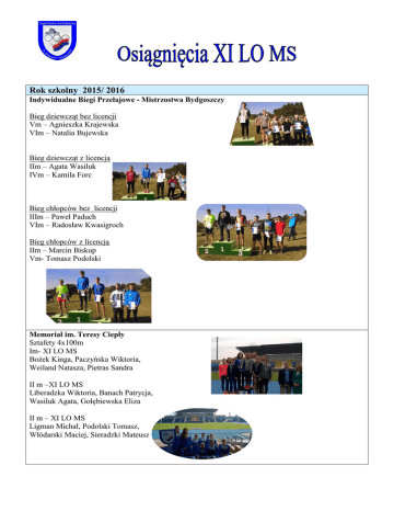 Rok szkolny 2015/ 2016 Indywidualne Biegi Przełajowe - Mistrzostwa Bydgoszczy Bieg dziewcząt bez licencji Vm – Agnieszka Krajewska VIm – Natalia Bujewska Bieg dziewcząt z licencją IIm – Agata Wasiluk IVm – Kamila Forc Bieg chłopców bez licencji IIIm – Paweł Paduch VIm – Radosław Kwasigroch Bieg chłopców z licencją IIm – Marcin Biskup Vm- Tomasz Podolski Memoriał im. Teresy Ciepły Sztafety 4x100m Im- XI LO MS Bożek Kinga, Paczyńska Wiktoria, Weiland Natasza, Pietras Sandra II m –XI LO MS Liberadzka Wiktoria, Banach Patrycja, Wasiluk Agata, Gołębiewska Eliza II m – XI LO MS Ligman Michał, Podolski Tomasz, Włódarski Maciej, Sieradzki Mateusz Indywidualne biegi przełajowe - Mistrzostwa Województwa Bieg chłopców z licencją IIm – Marcin Biskup VIm- Tomasz Podolski Bieg dziewcząt bez licencji IXm – Agnieszka Krajewska Sztafetowe biegi przełajowe - Mistrzostwa Bydgoszczy Im –XI LO MS -dziewczęta Natalia Bujakiewicz, Wasiluk Agata ,Banach Patrycja Paczyńska Wiktoria, Pietras Sandra, Weiland Natasza Pluschke Anna, Gołebiewska Eliza, Nowak Nicole Krajewska Agnieszka -chłopcy Biskup Marcin, Ligman Michał, Sieradzki Mateusz, Włódarski Maciej, Podolski Tomasz, Jędraszek Oskar, Paduch Paweł, Łassa Rafał Kwasigroch Radosław, Jakubowski Daniel Sztafetowe biegi przełajowe - Mistrzostwa Województwa Im –XI LO MS -dziewczęta Natalia Bujewska, Wasiluk Agata, Forc Kamila , Kurpińska Aleksandra ,Paczyńska Wiktoria Pietras Sandra , Gołebiewska Eliza, Nowak Nicole ,Krajewska Agnieszka, Schab Weronika IIm –XI LO MS - chłopcy Biskup Marcin, Ligman Michał, Sieradzki Mateusz, Włódarski Maciej, Jędraszek OskarPodolski Tomasz, Paduch Paweł, Kwasigroch Radosław, Łassa Rafał Mistrzostwa Bydgoszczy Szkół Ponadgimnazjalnych w pływaniu /03.11.15/ IIm –XI LO MS -dziewczęta Naskręt Agata, Grzella Paulina, Dojczman Anna , Szczepocka Joanna, Gałek Izabela, Barlik Katarzyna Agata Naskret Im- 50m styl grzbietowy Im- 100m styl zmienny sztafeta 4x50m - IIm Grzella Paulina,Dojczman Anna, Szczepocka Joanna, Naskręt Agata Grzella Paulina IIIm – 50m styl klasyczny IVm –XI LO MS - chłopcy Barglowski Mateusz, Paduch Paweł, Markowski Daniel, Nowicki Tomasz, Miszczyk Dominik, Gil-Pilarski Szymon Barglowski Mateusz IIIm – 50m styl motylkowy IVm – 50m styl dowolny Mieszczyk Dominik IVm – 50m styl klasyczny sztafeta 4x50m – IVm Nowicki Tomasz, Mieszczyk Dominik, Gil-Pilarski Szymon, Barglowski Mateusz