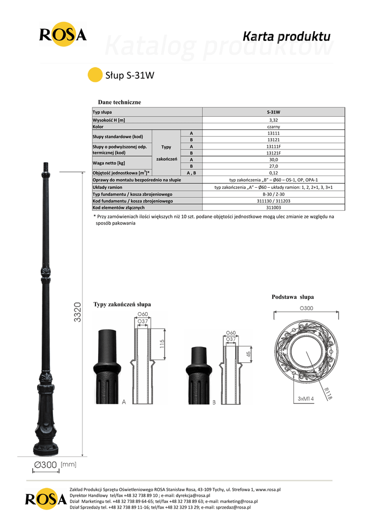 Słup S-31W Dane techniczne Typ słupa S-31W Wysokośd H *m+ Kolor Słupy standardowe (kod) Słupy o podwyższonej odp. termicznej (kod) Waga netto [kg] Typy zakooczeo Objętośd jednostkowa *m3]* Oprawy do montażu bezpośrednio na słupie Układy ramion Typ fundamentu / kosza zbrojeniowego Kod fundamentu / kosza zbrojeniowego Kod elementów złącznych A B A B A B A,B 3,32 czarny 13111 13121 13111F 13121F 30,0 27,0 0,12 typ zakooczenia „B” – Ø60 – OS-1, OP, OPA-1 typ zakooczenia „A” – Ø60 – układy ramion: 1, 2, 2+1, 3, 3+1 B-30 / Z-30 311130 / 311203 311003 * Przy zamówieniach ilości większych niż 10 szt. podane objętości jednostkowe mogą ulec zmianie ze względu na sposób pakowania Podstawa słupa Typy zakończeń słupa Zakład Produkcji Sprzętu Oświetleniowego ROSA Stanisław Rosa, 43-109 Tychy, ul. Strefowa 1, www.rosa.pl Dyrektor Handlowy tel/fax +48 32 738 89 10 ; e-mail: [email protected] Dział Marketingu tel. +48 32 738 89 64-65; tel/fax +48 32 738 89 63; e-mail: [email protected] Dział Sprzedaży tel. +48 32 738 89 11-16; tel/fax +48 32 329 13 29; e-mail: [email protected]