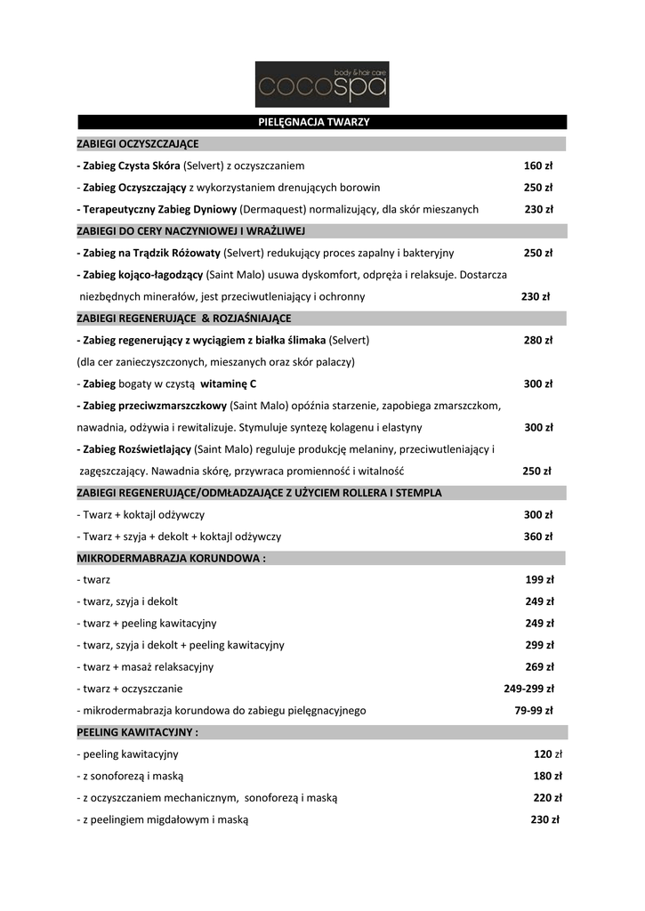 PIELĘGNACJA TWARZY . ZABIEGI OCZYSZCZAJĄCE . - Zabieg Czysta Skóra (Selvert) z oczyszczaniem 160 zł - Zabieg Oczyszczający z wykorzystaniem drenujących borowin 250 zł - Terapeutyczny Zabieg Dyniowy (Dermaquest) normalizujący, dla skór mieszanych 230 zł ZABIEGI DO CERY NACZYNIOWEJ I WRAŻLIWEJ . - Zabieg na Trądzik Różowaty (Selvert) redukujący proces zapalny i bakteryjny 250 zł - Zabieg kojąco-łagodzący (Saint Malo) usuwa dyskomfort, odpręża i relaksuje. Dostarcza niezbędnych minerałów, jest przeciwutleniający i ochronny 230 zł ZABIEGI REGENERUJĄCE & ROZJAŚNIAJĄCE - Zabieg regenerujący z wyciągiem z białka ślimaka (Selvert) . 280 zł (dla cer zanieczyszczonych, mieszanych oraz skór palaczy) - Zabieg bogaty w czystą witaminę C 300 zł - Zabieg przeciwzmarszczkowy (Saint Malo) opóźnia starzenie, zapobiega zmarszczkom, nawadnia, odżywia i rewitalizuje. Stymuluje syntezę kolagenu i elastyny 300 zł - Zabieg Rozświetlający (Saint Malo) reguluje produkcję melaniny, przeciwutleniający i zagęszczający. Nawadnia skórę, przywraca promienność i witalność 250 zł ZABIEGI REGENERUJĄCE/ODMŁADZAJĄCE Z UŻYCIEM ROLLERA I STEMPLA . - Twarz + koktajl odżywczy 300 zł - Twarz + szyja + dekolt + koktajl odżywczy 360 zł MIKRODERMABRAZJA KORUNDOWA : . - twarz 199 zł - twarz, szyja i dekolt 249 zł - twarz + peeling kawitacyjny 249 zł - twarz, szyja i dekolt + peeling kawitacyjny 299 zł - twarz + masaż relaksacyjny 269 zł - twarz + oczyszczanie - mikrodermabrazja korundowa do zabiegu pielęgnacyjnego 249-299 zł 79-99 zł PEELING KAWITACYJNY : . - peeling kawitacyjny 120 zł - z sonoforezą i maską 180 zł - z oczyszczaniem mechanicznym, sonoforezą i maską 220 zł - z peelingiem migdałowym i maską 230 zł KWASY : . - Migdałowy (zabieg całoroczny) 180 zł - Azelainowy (skóra naczyniowa / wrażliwa) 180 zł - Ferulowy (skóra szara / zmęczona / przebarwienia) 280 zł - Jessner (skóra trądzikowa) 280 zł - Dyniowy – enzymatyczny (skóra trądzikowa & z oznakami starzenia) 250 zł MEZOTERAPIA BEZIGŁOWA : . - twarz 250 zł - twarz + szyja + dekolt 350 zł FALE RADIOWE : . - twarz 250 zł - twarz + szyja 300 zł - twarz + szyja + dekolt 350 zł DODATKI : . - ampułka do zabiegu 50 zł - maska 60 zł - ampułka + sonoforeza do zabiegu 60 zł PIELĘGNACJA CIAŁA . BIOVACUUS : ZABIEG PRÓŻNIOWY . - nogi 170 zł - nogi + brzuch 240 zł - nogi + brzuch + ręce 280 zł - brzuch 90 zł - ręce 80 zł - próżniowa rewitalizacja twarzy / twarz + szyja, dekolt 120 zł/170 zł MASAŻE . - Masaż klasyczny (plecy + ręce) 30 / 60 / 90 min 80 zł / 140 zł / 180 zł - Masaż relaksacyjny 30 / 60 / 90 min 75 zł / 130 zł / 170 zł 60 / 90 min 150 zł / 190 zł 30 / 60 / 90 min 100 zł / 160 ZŁ / 200 zł 30 min 70 zł - Masaż antycellulitowy 30 / 60 min 90 zł / 150 zł - Masaż bańką chińską 30 / 60 min 90 zł / 150 zł 30 / 60 / 90 min 80 zł / 150 zł / 180 zł - Masaż rewitalizacyjny poporodowy 30 min 80 zł - Refleksologia stóp 30 min 65 zł - Masaż limfatyczny - Masaż sportowy - Masaż twarzy i dekoltu - Masaż dla kobiet w ciąży - Masaż klasyczny + peeling ciała - Masaż gorącymi kamieniami 90 min 1,5 h – 2 h - Zapachowy peeling ciała 210 zł 200 zł 90 zł PAZNOKCIE . - IBX : Zabieg odbudowujący i regenerujący płytkę paznokcia Pierwszy zabieg (manicure / pedicure) 50 zł Kolejne zabiegi 25 zł - Peeling dłoni / opiłowanie / malowanie - Manicure z malowaniem / french 20 zł 50 zł / 60 zł - Manicure bez malowania 40 zł - Manicure japoński 70 zł - Manicure z odżywką 45 zł - Manicure hybrydowy / french 100 zł / 110 zł - Malowanie hybrydowe 65 zł - Zdjęcie hybrydy 25 zł - Manicure z lakierem vinylux / french 70 zł / 75 zł - Malowanie lakierem vinylux 45 zł - Syrenka 1 paznokieć 5 zł 10 paznokci 25 zł - Pedicure (bez malowania) 95 zł - Pół pedicure (bez malowania) 80 zł - Pedicure z malowaniem / french 115 zł / 125 zł - Pedicure z odżywką 100 zł - Callus Peel (dodatek do zabiegu) 80 zł - Pedicure hybrydowy / french 160 zł / 170 zł - Pedicure z lakierem vinylux / french 140 zł / 150 zł - Komplet hybryda ręce i stopy / french 250 zł / 270 zł ŻEL : . - Założenie szablon clear z malowaniem / french 150 zł / 170 zł - Uzupełnienie clear z malowaniem / french 130 zł / 150 zł - Podpiłowanie żelu z manicure 65 zł - Naprawa 1 paznokcia 20 zł - Założenie żel clear + hybryda 210 zł - Uzupełnienie żel clear + hybryda 180 zł - Zdjęcie żelu 60 zł HENNA . - Rzęsy lub brwi (bez regulacji) 30 zł - Brwi z regulacją pęsetą/ woskiem 35 zł / 40 zł - Regulacja pęsetą / woskiem 20 zł / 25 zł - Komplet 50 zł MAKIJAŻ . - Makijaż dzienny / wieczorowy 150 zł - Makijaż ślubny 200 zł XTREME LASHES – PRZEDŁUŻANIE RZĘS MOTODĄ JEDEN DO JEDNEGO - Pierwsza aplikacja rzęs 250 zł - Uzupełnienie rzęs (do 3 tygodni) 150 zł - Uzupełnienie (po 3 tygodniach) 200 zł - Zdjęcie rzęs 50 zł PRZEKŁUWANIE USZU (BLOMDAHL) - Przekłuwanie uszu : 2 dziurki – 1 przekłucie . 150 zł DEPILACJA . WOSK LYCON - Wąsik / broda /baczki 25 zł 40 zł - Pachy 40 zł 60 zł - Bikini 40-90 zł 80-140 zł - Ręce całe 40-60 zł 60-90 zł - Całe nogi 100 zł 150 zł - Łydki 50 zł 80 zł - Uda 50-60 zł 70-100 zł 100 zł 150 zł 50-100 zł 100-150 zł - Plecy męskie - Tors FRYZJERSTWO . STYLIZACJA : - Modelowanie . 50-70 zł - Stylizacja / warkocz / kucyk / loki / prostownica 100-120 zł - Upięcia 150–300 zł STRZYŻENIE : - Strzyżenie damskie . 80-100 zł - Podcięcie grzywki 10 zł - Strzyżenie męskie 50 zł - Strzyżenie dziecięce 35-65 zł KOLORYZACJA : (STRZYŻENIE GRATIS) . - Koloryzacja 220-280 zł - Koloryzacja INOA 230-290 zł - koloryzacja + refleksy 310-350 zł - Refleksy 230-250 zł - Balayage (1 kolor) 260-290 zł - Balayage (wielokolorowy) 270-320 zł - Koloryzacja : Eco koloryzacja farbami firmy Natulique 230–290 zł - Dekoloryzacja 150-500 zł - Dodatkowa doza farby 30