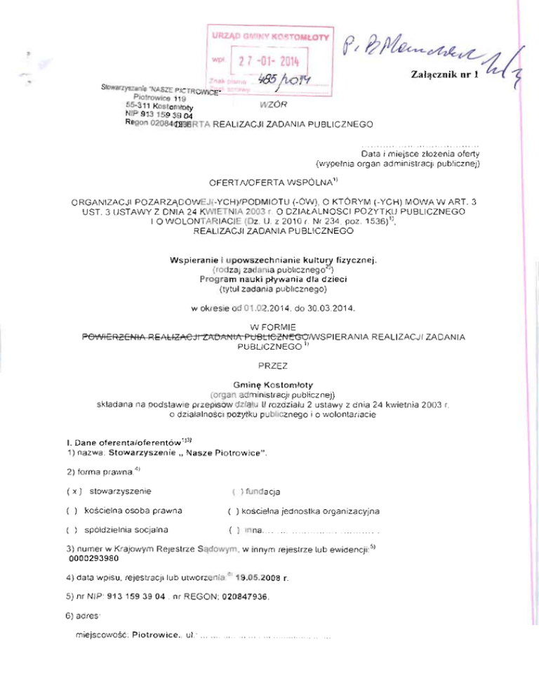 OFERTNOFERTA WSPOLNA ' 1 ORGANIZACJI POZARZADOWEJ (-YCH )IPODMIOTU (-OW), 0 KTORYM (-YCH) MOWA W ART. 3 UST. 3 USTAWY Z DNIA 24 KW IETNIA 2003 r. 0 DZIAtALNOSCI POZYTKU PUBLlCZNEGO 10 WOLON TARI ACIE (Dz U. z 2010 r Nr 234 , poz 1536)'1, REALlZACJI ZADANIA PUBLlCZNEGO Wspieranie ; upowszechnianie kultug: lizycznej. (rodzaj zadania pubhcznego' ) Program nauk; plywania dla dziec; (tytul zadania publlcznego) w okresie od 0102.2014. do 300320 14 WFORMI E POWIERZENIA "' .. ALlZ,'<CJI ZAISAlqlA PUBLICmEi30NVSPIERANI A REALlZACJI ZADANIA PUBLlCZNEGO 11 PRZEZ