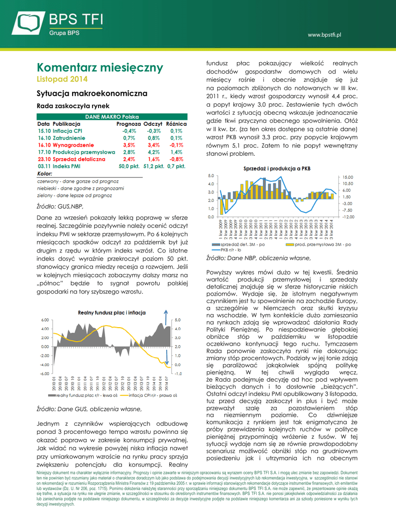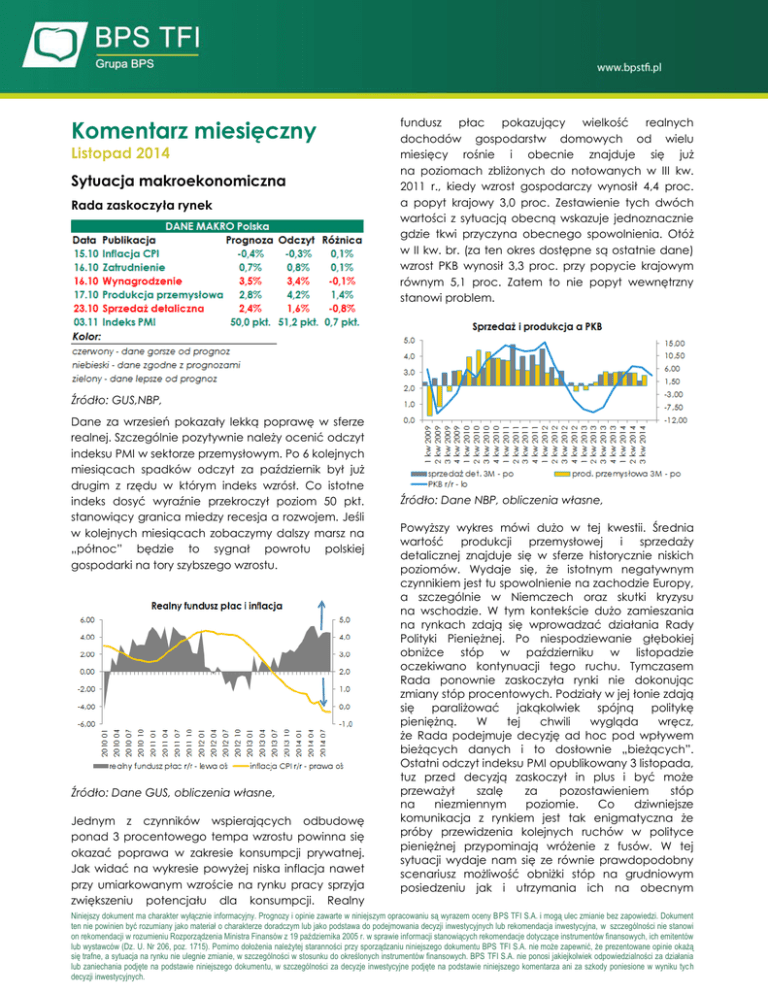 Komentarz miesięczny Listopad 2014 Sytuacja makroekonomiczna Rada zaskoczyła rynek fundusz płac pokazujący wielkość realnych dochodów gospodarstw domowych od wielu miesięcy rośnie i obecnie znajduje się już na poziomach zbliżonych do notowanych w III kw. 2011 r., kiedy wzrost gospodarczy wynosił 4,4 proc. a popyt krajowy 3,0 proc. Zestawienie tych dwóch wartości z sytuacją obecną wskazuje jednoznacznie gdzie tkwi przyczyna obecnego spowolnienia. Otóż w II kw. br. (za ten okres dostępne są ostatnie dane) wzrost PKB wynosił 3,3 proc. przy popycie krajowym równym 5,1 proc. Zatem to nie popyt wewnętrzny stanowi problem. Źródło: GUS,NBP, Dane za wrzesień pokazały lekką poprawę w sferze realnej. Szczególnie pozytywnie należy ocenić odczyt indeksu PMI w sektorze przemysłowym. Po 6 kolejnych miesiącach spadków odczyt za październik był już drugim z rzędu w którym indeks wzrósł. Co istotne indeks dosyć wyraźnie przekroczył poziom 50 pkt. stanowiący granica miedzy recesja a rozwojem. Jeśli w kolejnych miesiącach zobaczymy dalszy marsz na „północ” będzie to sygnał powrotu polskiej gospodarki na tory szybszego wzrostu. Źródło: Dane GUS, obliczenia własne, Jednym z czynników wspierających odbudowę ponad 3 procentowego tempa wzrostu powinna się okazać poprawa w zakresie konsumpcji prywatnej. Jak widać na wykresie powyżej niska inflacja nawet przy umiarkowanym wzroście na rynku pracy sprzyja zwiększeniu potencjału dla konsumpcji. Realny Źródło: Dane NBP, obliczenia własne, Powyższy wykres mówi dużo w tej kwestii. Średnia wartość produkcji przemysłowej i sprzedaży detalicznej znajduje się w sferze historycznie niskich poziomów. Wydaje się, że istotnym negatywnym czynnikiem jest tu spowolnienie na zachodzie Europy, a szczególnie w Niemczech oraz skutki kryzysu na wschodzie. W tym kontekście dużo zamieszania na rynkach zdają się wprowadzać działania Rady Polityki Pieniężnej. Po niespodziewanie głębokiej obniżce stóp w październiku w listopadzie oczekiwano kontynuacji tego ruchu. Tymczasem Rada ponownie zaskoczyła rynki nie dokonując zmiany stóp procentowych. Podziały w jej łonie zdają się paraliżować jakąkolwiek spójną politykę pieniężną. W tej chwili wygląda wręcz, że Rada podejmuje decyzję ad hoc pod wpływem bieżących danych i to dosłownie „bieżących”. Ostatni odczyt indeksu PMI opublikowany 3 listopada, tuz przed decyzją zaskoczył in plus i być może przeważył szalę za pozostawieniem stóp na niezmiennym poziomie. Co dziwniejsze komunikacja z rynkiem jest tak enigmatyczna że próby przewidzenia kolejnych ruchów w polityce pieniężnej przypominają wróżenie z fusów. W tej sytuacji wydaje nam się ze równie prawdopodobny scenariusz możliwość obniżki stóp na grudniowym posiedzeniu jak i utrzymania ich na obecnym Niniejszy dokument ma charakter wyłącznie informacyjny. Prognozy i opinie zawarte w niniejszym opracowaniu są wyrazem oceny BPS TFI S.A. i mogą ulec zmianie bez zapowiedzi. Dokument ten nie powinien być rozumiany jako materiał o charakterze doradczym lub jako podstawa do podejmowania decyzji inwestycyjnych lub rekomendacja inwestycyjna, w szczególności nie stanowi on rekomendacji w rozumieniu Rozporządzenia Ministra Finansów z 19 października 2005 r. w sprawie informacji stanowiących rekomendacje dotyczące instrumentów finansowych, ich emitentów lub wystawców (Dz. U. Nr 206, poz. 1715). Pomimo dołożenia należytej staranności przy sporządzaniu niniejszego dokumentu BPS TFI S.A. nie może zapewnić, że prezentowane opinie okażą się trafne, a sytuacja na rynku nie ulegnie zmianie, w szczególności w stosunku do określonych instrumentów finansowych. BPS TFI S.A. nie ponosi jakiejkolwiek odpowiedzialności za działania lub zaniechania podjęte na podstawie niniejszego dokumentu, w szczególności za decyzje inwestycyjne podjęte na podstawie niniejszego komentarza ani za szkody poniesione w wyniku tych decyzji inwestycyjnych. poziomie i zakończenia cyklu przy stopie referencyjnej wynoszącej 2 proc. Tak czy inaczej na czoło czynników decydujących o zmianach stóp procentowych wysuwa się kwestia wzrostu gospodarczego. Inflacja zaś schodzi na dalszy plan. Rynek akcji Końcówka roku może być udana Po wrześniowych wzrostach październik przyniósł spadki. Indeks szerokiego rynku WIG zakończył miesiąc na poziomie nieco poniżej 54 tys. pkt., co oznaczało spadek w stosunku do końca września o 1,7 proc. Indeks największych spółek WIG20 również zanotował regres o 1,5 proc. Działo się tak pomimo spadku stóp procentowych banku centralnego i wzrostu oczekiwań na ich dalsze obniżki. 3,0 proc. W 18 ostatnich latach w 13 przypadkach grudzień przynosił wzrost indeksu WIG. Czynnikiem przemawiającymi za akcjami obecnie może być fakt, że w środowisku niskich stóp procentowych banku centralnego utrzymuje się relatywnie niskie oprocentowanie depozytów bankowych, a biorąc pod uwagę podatek Belki rentowność lokat spada jeszcze bardziej. Inną alternatywą dla akcji zawsze były obligacje. Jednak obecnie poziomy ich rentowności biją już historyczne rekordy. Źródło: Dane Bloomberg, Tym samy papiery skarbowe są niezwykle drogie. A cykl obniżek stóp procentowych może w każdej chwili zostać zahamowany. Pozwala to na wzrost atrakcyjności akcji jako alternatywnej inwestycji. Źródło: Dane Bloomberg, W takim przypadku czynnikami najsilniej oddziałującymi na krajowy rynek kapitałowy były zapewne decyzje inwestorów zagranicznych. A ci raczej wyprzedawali w październiku akcje z rynków wschodzących. Indeks banku Morgan Stanley dla rynków wschodzących MSCI EM jeszcze na początku września notował blisko 10 procentową stopę zwrotu licząc od końca ub.r. Jednak od tego momentu następuje jego nieustanny spadek. Polska giełda nie pozostała odporna na te globalne przepływy kapitału. Listopa