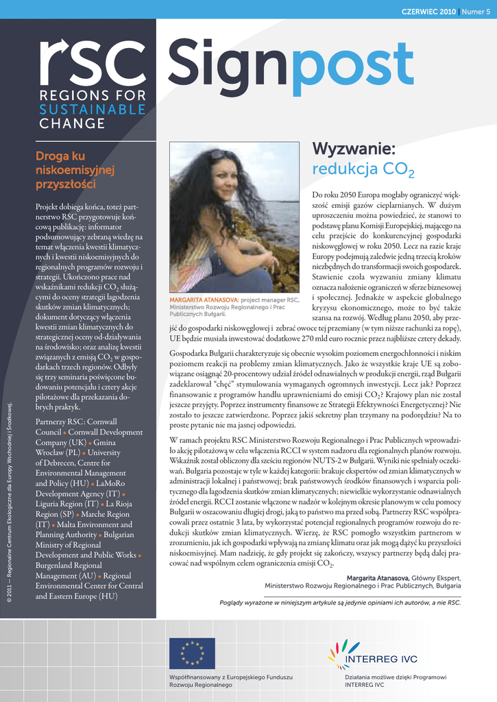 cZerwiec 2010 | numer 5 signpost wyzwanie: redukcja co2 © 2011 — regionalne centrum ekologiczne dla europy wschodniej i Środkowej. droga ku niskoemisyjnej przyszłości Projekt dobiega końca, toteż partnerstwo RSC przygotowuje końcową publikację: informator podsumowujący zebraną wiedzę na temat włączenia kwestii klimatycznych i kwestii niskoemisyjnych do regionalnych programów rozwoju i strategii. Ukończono prace nad wskaźnikami redukcji CO2 służącymi do oceny strategii łagodzenia skutków zmian klimatycznych; dokument dotyczący włączenia kwestii zmian klimatycznych do strategicznej oceny od-działywania na środowisko; oraz analizę kwestii związanych z emisją CO2 w gospodarkach trzech regionów. Odbyły się trzy seminaria poświęcone budowaniu potencjału i cztery akcje pilotażowe dla przekazania dobrych praktyk. Partnerzy RSC: Cornwall Council • Cornwall Development Company (UK) • Gmina Wrocław (PL) • University of Debrecen, Centre for Environmental Management and Policy (HU) • LaMoRo Development Agency (IT) • Liguria Region (IT) • La Rioja Region (SP) • Marche Region (IT) • Malta Environment and Planning Authority • Bulgarian Ministry of Regional Development and Public Works • Burgenland Regional Management (AU) • Regional Environmental Center for Central and Eastern Europe (HU) Do roku 2050 Europa mogłaby ograniczyć większość emisji gazów cieplarnianych. W dużym uproszczeniu można powiedzieć, że stanowi to podstawę planu Komisji Europejskiej, mającego na celu przejście do konkurencyjnej gospodarki niskowęglowej w roku 2050. Lecz na razie kraje Europy podejmują zaledwie jedną trzecią kroków niezbędnych do transformacji swoich gospodarek. Stawienie czoła wyzwaniu zmiany klimatu oznacza nałożenie ograniczeń w sferze biznesowej i społecznej. Jednakże w aspekcie globalnego Margarita atanasoVa: project manager rsc, Ministerstwo rozwoju regionalnego i prac kryzysu ekonomicznego, może to być także publicznych Bułgarii. szansa na rozwój. Według planu 2050, aby przejść do gospodarki niskowęglowej i zebrać owoce tej przemiany (w tym niższe rachunki za ropę), UE będzie musiała inwestować dodatkowe 270 mld euro rocznie przez najbliższe cztery dekady. Gospodarka Bułgarii charakteryzuje się obecnie wysokim poziomem energochłonności i niskim poziomem reakcji na problemy zmian klimatycznych. Jako że wszystkie kraje UE są zobowiązane osiągnąć 20-procentowy udział źródeł odnawialnych w produkcji energii, rząd Bułgarii zadeklarował “chęć” stymulowania wymaganych ogromnych inwestycji. Lecz jak? Poprzez finansowanie z programów handlu uprawnieniami do emisji CO2? Krajowy plan nie został jeszcze przyjęty. Poprzez instrumenty finansowe ze Strategii Efektywności Energetycznej? Nie zostało to jeszcze zatwierdzone. Poprzez jakiś sekretny plan trzymany na podorędziu? Na to proste pytanie nie ma jasnej odpowiedzi. W ramach projektu RSC Ministerstwo Rozwoju Regionalnego i Prac Publicznych wprowadziło akcję pilotażową w celu włączenia RCCI w system nadzoru dla regionalnych planów rozwoju. Wskaźnik został obliczony dla sześciu regionów NUTS-2 w Bułgarii. Wyniki nie spełniały oczekiwań. Bułgaria pozostaje w tyle w każdej kategorii: brakuje ekspertów od zmian klimatycznych w administracji lokalnej i państwowej; brak państwowych środków finansowych i wsparcia politycznego dla łagodzenia skutków zmian klimatycznych; niewielkie wykorzystanie odnawialnych źródeł energii. RCCI zostanie włączone w nadzór w kolejnym okresie planowym w celu pomocy Bułgarii w oszacowaniu długiej drogi, jaką to państwo ma przed sobą. Partnerzy RSC współpracowali przez ostatnie 3 lata, by wykorzystać potencjał regionalnych programów rozwoju do redukcji skutków zmian klimatycznych. Wierzę, że RSC pomogło wszystkim partnerom w zrozumieniu, jak ich gospodarki wpływają na zmianę klimatu oraz jak mogą dążyć ku przyszłości niskoemisyjnej. Mam nadzieję, że gdy projekt się zakończy, wszyscy partnerzy będą dalej pracować nad wspólnym celem ograniczenia emisji CO2. Margarita atanasova, główny ekspert, Ministerstwo rozwoju regionalnego i prac publicznych, Bułgaria Poglądy wyrażone w niniejszym artykule są jedynie opiniami ich autorów, a nie RSC. współfinansowany z europejskiego Funduszu rozwoju regionalnego działania możliwe dzięki programowi interreg iVc analiza emisji co2 i związane z tym kwestie ekonomiczne trzech regionów europy © 2011 — regionalne centrum ekologiczne dla europy wschodniej i Środkowej. W ramach projektu RSC konsultanci SQW, ICLEI–Europe i Mercados EMI zostali poproszeni o zanalizowanie kwestii związanych z emisją dwutlenku węgla w gospodarkach trzech europejskich regionów: Kornwalii (Wielka Brytania), Burgenlandu (Austria) i Marche (Włochy). Celem badania było wypracowanie narzędzia ilościowego do porównania różnych rozwiązań redukcji CO2 pod względem kosztu, emisji dwutlenku węgla i zatrudnienia. Uzyskane w ten sposób narzędzie PACE (z ang. Priorytyzacja Działań na rzecz Gospadarki Niskoemisyjnej) zostało rozwinięte w celu pomocy regionalnym strategiom i planowaniu działań niskoemisyjnych. PACE umożliwia porównanie środków łagodzenia zmian klimatycznych, które dany region może brać pod uwagę, np: energia odnawialna; inicjatywy dla poprawienia efektywności energetycznej i transportu; oraz zmiany w użytkowaniu ziemi. PACE ma być na tyle elastyczne, by poradzić sobie z nowymi czynnikami lub zmianami w proponowanych strategiach. Gdy karty danych zostaną już wypełnione dla każdego z rozwiązań, można wykorzystać to narzędzie do porównania wybranych rozwiązań dla każdego regionu pod kątem kosztów, emisji CO2 i tworzenia nowych miejsc pracy. PACE tworzy uproszczone tabele i wykresy, pokazujące decydentom, które środki należy potraktować priorytetowo — wesprzeć lub doinwestować. Ana