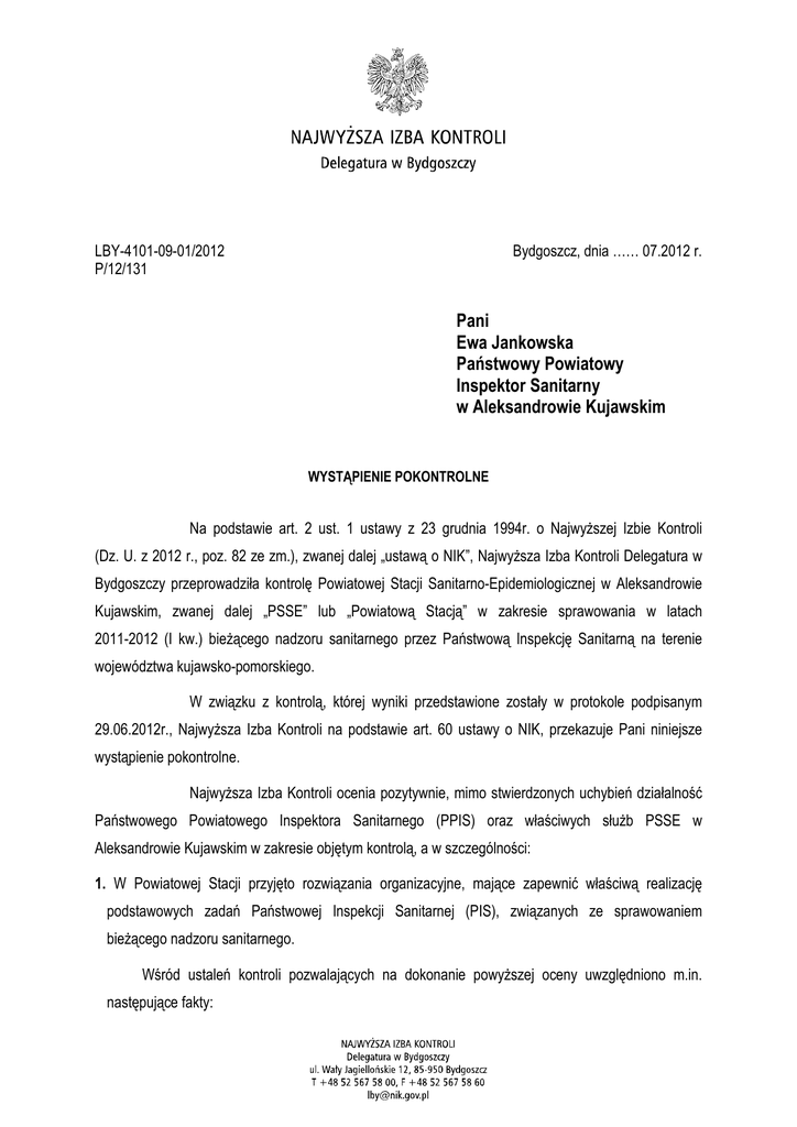 LBY-4101-09-01/2012 P/12/131 Bydgoszcz, dnia …… 07.2012 r. Pani Ewa Jankowska Państwowy Powiatowy Inspektor Sanitarny w Aleksandrowie Kujawskim WYSTĄPIENIE POKONTROLNE Na podstawie art. 2 ust. 1 ustawy z 23 grudnia 1994r. o Najwyższej Izbie Kontroli (Dz. U. z 2012 r., poz. 82 ze zm.), zwanej dalej „ustawą o NIK”, Najwyższa Izba Kontroli Delegatura w Bydgoszczy przeprowadziła kontrolę Powiatowej Stacji Sanitarno-Epidemiologicznej w Aleksandrowie Kujawskim, zwanej dalej „PSSE” lub „Powiatową Stacją” w zakresie sprawowania w latach 2011-2012 (I kw.) bieżącego nadzoru sanitarnego przez Państwową Inspekcję Sanitarną na terenie województwa kujawsko-pomorskiego. W związku z kontrolą, której wyniki przedstawione zostały w protokole podpisanym 29.06.2012r., Najwyższa Izba Kontroli na podstawie art. 60 ustawy o NIK, przekazuje Pani niniejsze wystąpienie pokontrolne. Najwyższa Izba Kontroli ocenia pozytywnie, mimo stwierdzonych uchybień działalność Państwowego Powiatowego Inspektora Sanitarnego (PPIS) oraz właściwych służb PSSE w Aleksandrowie Kujawskim w zakresie objętym kontrolą, a w szczególności: 1. W Powiatowej Stacji przyjęto rozwiązania organizacyjne, mające zapewnić właściwą realizację podstawowych zadań Państwowej Inspekcji Sanitarnej (PIS), związanych ze sprawowaniem bieżącego nadzoru sanitarnego. Wśród ustaleń kontroli pozwalających na dokonanie powyższej oceny uwzględniono m.in. następujące fakty: ♦ Wymienione w statucie i regulaminie organizacyjnym PSS-E w Aleksandrowie Kujawskim zadania były zgodne z art. 1-6 ustawy z dnia 14 marca 1985 r. o Państwowej Inspekcji Sanitarnej (Dz. U. z 2011r., nr 212, poz. 1263), - zwanej dalej ustawą o PIS i obejmowały cały zakres kompetencji Inspekcji Sanitarnej na terenie działania, tj. miasta Aleksandrów Kujawski i powiatu aleksandrowskiego. ♦ Faktyczne zatrudnienie było zgodne ze statutem, regulaminem i schematem organizacyjnym Powiatowej Stacji. ♦ Kwalifikacje Powiatowego Inspektora i pracowników Stacji spełniały wymogi art. 13 ustawy o PIS oraz rozporządzenia Ministra Zdrowia z dnia 22 marca 2010r. w sprawie kwalifikacji wymaganych na poszczególnych stanowiska pracy w stacji sanitarno-epidemiologicznej (Dz. U. Nr 48, poz. 283). 2. Najwyższa Izba Kontroli ocenia pozytywnie skuteczność działań Inspekcji Sanitarnej w badanym okresie, w tym m.in. kontrolę przestrzegania na podległym obszarze działania przepisów określających wymagania higieniczne i zdrowotne w zakresie: higieny żywności, żywienia i przedmiotów użytku; nadzoru nad obiektami komunalnymi; prewencji chorób zawodowych oraz higieny dzieci i młodzieży. Ogółem w badanym okresie w wymienionych obszarach przeprowadzono 2.347 kontroli, wykonano 2.182 badania, wydano 284 decyzje merytoryczne, 613 decyzji płatniczych, 53 postanowienia, wystawiono 4 tytuły wykonawcze oraz nałożono 88 mandatów na łączną kwotę 16.450 zł. Pozytywną ocenę skuteczności działania Inspekcji Sanitarnej na terenie miasta Aleksandrów Kujawski i powiatu aleksandrowskiego potwierdzają także niżej wymienione fakty: ♦ Planowanie działalności kontrolnej PSSE w badanym okresie odbywało się zgodnie z kompetencjami określonymi w ustawie o PIS oraz w oparciu o wytyczne Głównego Inspektora Sanitarnego (GIS) i Państwowego Wojewódzkiego Inspektora Sanitarnego w Bydgoszczy (PWIS), a także z uwzględnieniem wyników oceny stanu sanitarnego obiektów. ♦ PSSE posiadała wiedzę, co do ilości podmiotów objętych ustawowym bieżącym nadzorem sanitarnym, a ich ewidencję prowadzoną w formie centralnego wykazu podmiotów i obiektów (oraz według branż w poszczególnych pionach organizacyjnych), bieżąco aktualizowano. ♦ Jednostki na terenie działania Powiatowej Stacji były objęte bieżącym nadzorem sanitarnym, zgodnie z harmonogramem kontroli uwzględniając: - obiekty o zwiększonym ryzyku zagrożeń np. bezpieczeństwo żywności, 2 - obiekty charakteryzujące się najgorszym stanem higieniczno-sanitarnym stwierdzonym w poprzednich kontrolach, - specyfikę nadzorowanego terenu, w tym m.in.: potrzeby i warunki lokalne, stan środowiska, itp. ♦ W kontrolach obiektów objętych bieżącym nadzorem sanitarnym uwzględniano przestrzeganie określonych wymagań – wskazanych przez GIS czy PWIS, np.: dotyczących żywności genetycznie zmodyfikowanej, żywności mogącej zawierać niedozwolone środki (sól przemysłową), a także realizację zadań nałożonych przez system wczesnego ostrzegania o produktach niebezpiecznych. 3. W ocenie Najwyższej Izby Kontroli o skuteczności i poprawności decyzji administracyjnych wydawanych przez Państwowego Powiatowego Inspektora Sanitarnego w Aleksandrowie Kujawskim, świadczy także fakt, że na wydane w badanym okresie 284 decyzje merytoryczne odwołanie do Państwowego Wojewódzkiego Inspektora Sanitarnego w Bydgoszczy wniesiono tylko w jednym przypadku, w którym PWIS utrzymał w mocy decyzję PPIS. Zdaniem Izby oceną poprawności działania Inspekcji Sanitarnej na terenie miasta Aleksandrów Kujawski i powiatu aleksandrowskiego jest fakt, że w badanym okresie nie wpłynęły żadne skargi na działalność zarówno Powiatowego Inspektora jak i PSSE. 4. Najwyższa Izba Kontroli ocenia pozytywnie, pomimo stwierdzenia dwóch uchybień prawidłowość prowadzenia postępowań kontrolnych oraz działań podejmowanych w przypadkach stwierdzenia naruszenia wymagań higienicznych i zdrowotnych, a także skuteczność egzekucji decyzji administracyjnych i zaleceń poinspekcyjnych. NIK ocenia pozytywnie 40 losowo wybranych akt z kontroli podmiotów i obiektów, na podstawie których stwierdzono, że: ♦ Przeprowadzanie kontroli odbywało się na podstawie ważnych upoważnień, podpisanych przez Powiatowego Inspektora, lub osoby upoważnione oraz po upływie 7 i nie później niż 30 dni od dnia doręczenia zawiadomienia o zamiarze wszczęcia kontrol