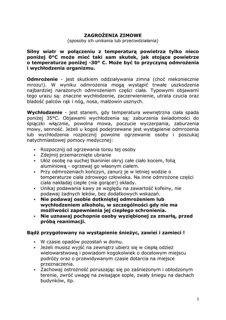ZAGROŻENIA ZIMOWE (sposoby ich unikania lub przeciwdziałania) Silny wiatr w połączeniu z temperaturą powietrza tylko nieco poniżej 0°C może mieć taki sam skutek, jak stojące powietrze o temperaturze poniżej -30° C. Może być to przyczyną odmrożenia i wychłodzenia organizmu. Odmrożenie - jest skutkiem oddziaływania zimna (choć niekoniecznie mrozu!). W wyniku odmrożenia mogą wystąpić trwałe uszkodzenia najbardziej narażonych odmrożeniem części ciała. Typowymi objawami tego urazu są: znaczne wychłodzenie, zaczerwienienie, utrata czucia oraz bladość palców rąk i nóg, nosa, małżowin usznych. Wychłodzenie - jest stanem, gdy temperatura wewnętrzna ciała spada poniżej 35°C. Objawami wychłodzenia są: zaburzenia świadomości do śpiączki włącznie, powolna mowa, poczucie wyczerpania, zaburzenia mowy, senność. Jeżeli u kogoś podejrzewane jest wystąpienie odmrożenia lub wychłodzenia rozpocznij powolne ogrzewanie osoby i poszukaj natychmiastowej pomocy medycznej: Rozpocznij od ogrzewania torsu tej osoby Zdejmij przemarznięte ubranie Ułóż osobę na suchej tkaniniei okryj całe ciało kocem, folią aluminiową - ogrzewaj go własnym ciałem. Przy odmrożeniach kończyn, zanurz je w letniej wodzie o temperaturze ciała zdrowego człowieka. Na inne odmrożone części ciała nakładaj ciepłe (nie gorące!) okłady. Unikaj podawania kawy ze względu na zawartość kofeiny, nie podawaj żadnych leków, bez dodatkowych wskazań. Nie podawaj osobie dotkniętej odmrożeniem lub wychłodzeniem alkoholu, w szczególności gdy nie ma możliwości zapewnienia jej ciepłego schronienia. Nie uznawaj pochopnie osoby wyziębionej za zmarłą, przed próbą reanimacji. Bądź przygotowany na wystąpienie śnieżyc, zawiei i zamieci ! W czasie opadów pozostań w domu. Jeżeli musisz wyjść na zewnątrz ubierz się w ciepłą odzież wielowarstwową i powiadom kogokolwiek o docelowym miejscu podróży oraz o przewidywanym czasie dotarcia na miejsce przeznaczenia. Zachowaj ostrożność poruszając się po zaśnieżonym i oblodzonym terenie, zwróć uwagę na zwisające sople, zwały śniegu na dachach budynków, itp. 1 Jazda samochodem w zimie Jedną z wielu przyczyn ofiar śmiertelnych w zimie jest niewłaściwe przygotowanie pojazdu do sezonu zimowego oraz brak znajomości postępowania na wypadek unieruchomienia pojazdu lub zabłądzenia podczas podróżowania. Dlatego też, aby bezpiecznie podróżować sprawdź następujące elementy twojego samochodu: akumulator, płyn chłodzący, wycieraczki i płyn do spryskiwania szyb, układ zapłonowy, termostat, oświetlenie pojazdu światła awaryjne, układ wydechowy, układ ogrzewania hamulce, odmrażacz, poziom oleju (jeśli jest taka potrzeba, wymień na olej zimowy). Załóż zimowe opony i upewnij się, czy mają odpowiedni bieżnik. Uniwersalne opony radialne zazwyczaj nadają się do większości warunków zimowych. Jednakże, przepisy w niektórych krajach wymagają stosowania opon z łańcuchami lub opon śniegowych z kolcami. Miej przygotowaną skrobaczkę do szyb oraz narzędzie do usuwania śniegu. Utrzymuj co najmniej połowę pojemności zbiornika paliwa w czasie zimy. Starannie planuj długie podróże. Słuchaj komunikatów radiowych o aktualnych warunkach drogowych. Podróżuj w ciągu dnia i jeśli to możliwe, w towarzystwie przynajmniej jednej osoby. W czasie burzy śniegowej staraj się korzystać z komunikacji publicznej. Ubieraj się ciepło. Noś odzież wielowarstwową, lekko dopasowaną. Na czas dłuższej podróży przygotuj wysokoenergetyczne, suche pożywienie oraz kilka butelek wody. Miej w swoim samochodzie: migające światło przenośne z zapasowymi bateriami, apteczkę pierwszej pomocy oraz niezbędne leki, śpiwór lub koc, torby plastikowe (do celów sanitarnych), zapałki, małą łopatkę - saperkę, 2 podręczne narzędzia - szczypce uniwersalne, klucz nastawny, śrubokręt itp., przewody do rozruchu silnika, łańcuchy lub siatki do opon, jaskrawo kolorową tkaninę do użycia, jako flagi sygnalizacyjnej. Jeśli utknąłeś w drodze Pozostań w samochodzie. Nie szukaj sam pomocy, chyba, że pomoc jest widoczna w odległości 100 m. Umocuj na antenie lub dachu samochodu jaskrawą część ubrania (najlepiej koloru czerwonego) tak, aby widoczna była dla ratowników. Użyj wszelkich dostępnych środków do poprawienia izolacji samochodu. Uruchamiaj silnik co godzinę na 10 minut. W czasie pracy silnika włącz ogrzewanie oraz zewnętrzne światła samochodu. Zachowaj ostrożność z uwagi na trujące działanie tlenku węgla w spalinach. Utrzymuj rurę wydechową wolną od śniegu oraz dla wentylacji lekko uchyl okna Zwracaj uwagę na oznaki odmrożeń lub wychłodzenia organizmu. Wykonuj lekkie ćwiczenia dla utrzymania krążenia krwi. Od czasu do czasu klaskaj w dłonie, wykonuj wymachy ramionami. Staraj się nie przebywać w jednej pozycji zbyt długo. Jeśli w samochodzie jest więcej niż jedna osoba, należy spać kolejno, na zmianę. Dla utrzymania ciepła osoby powinny zgromadzić się koło siebie. Unikaj zbędnego lub nadmiernego wysiłku. Zimne otoczenie powoduje dodatkowe obciążenie dla serca. Nadmierny wysiłek, taki jak odgarnianie śniegu albo pchanie samochodu może spowodować zdrowotne dolegliwości. 3