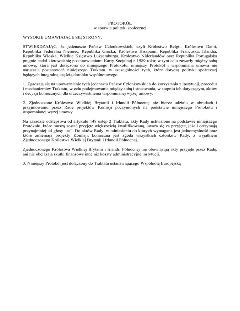 PROTOKÓŁ w sprawie polityki społecznej WYSOKIE UMAWIAJĄCE SIĘ STRONY, STWIERDZAJĄC, że jedenaście Państw Członkowskich, czyli Królestwo Belgii, Królestwo Danii, Republika Federalna Niemiec, Republika Grecka, Królestwo Hiszpanii, Republika Francuska, Irlandia, Republika Włoska, Wielkie Księstwo Luksemburga, Królestwo Niderlandów oraz Republika Portugalska pragnie nadal kierować się postanowieniami Karty Socjalnej z 1989 roku; w tym celu zawarły między sobą umowę, która jest dołączona do niniejszego Protokołu; niniejszy Protokół i wspomniana umowa nie naruszają postanowień niniejszego Traktatu, w szczególności tych, które dotyczą polityki społecznej będących integralną częścią dorobku wspólnotowego. 1. Zgadzają się na upoważnienie tych jedenastu Państw Członkowskich do korzystania z instytucji, procedur i mechanizmów Traktatu, w celu podejmowania między sobą i stosowania, w stopniu ich dotyczącym, aktów i decyzji koniecznych dla urzeczywistnienia wspomnianej wyżej umowy. 2. Zjednoczone Królestwo Wielkiej Brytanii i Irlandii Północnej nie bierze udziału w obradach i przyjmowaniu przez Radę projektów Komisji poczynionych na podstawie niniejszego Protokołu i wspomnianej wyżej umowy. Na zasadzie odstępstwa od artykułu 148 ustęp 2 Traktatu, akty Rady uchwalone na podstawie niniejszego Protokołu, które muszą zostać przyjęte większością kwalifikowaną, uważa się za przyjęte, jeżeli otrzymają przynajmniej 44 głosy „za”. Do aktów Rady, w odniesieniu do których wymagana jest jednomyślność oraz które zmieniają projekty Komisji, konieczna jest zgoda wszystkich członków Rady, z wyjątkiem Zjednoczonego Królestwa Wielkiej Brytanii i Irlandii Północnej. Zjednoczonego Królestwa Wielkiej Brytanii i Irlandii Północnej nie obowiązują akty przyjęte przez Radę, ani nie obciążają skutki finansowe inne niż koszty administracyjne instytucji. 3. Niniejszy Protokół jest dołączony do Traktatu ustanawiającego Wspólnotę Europejską