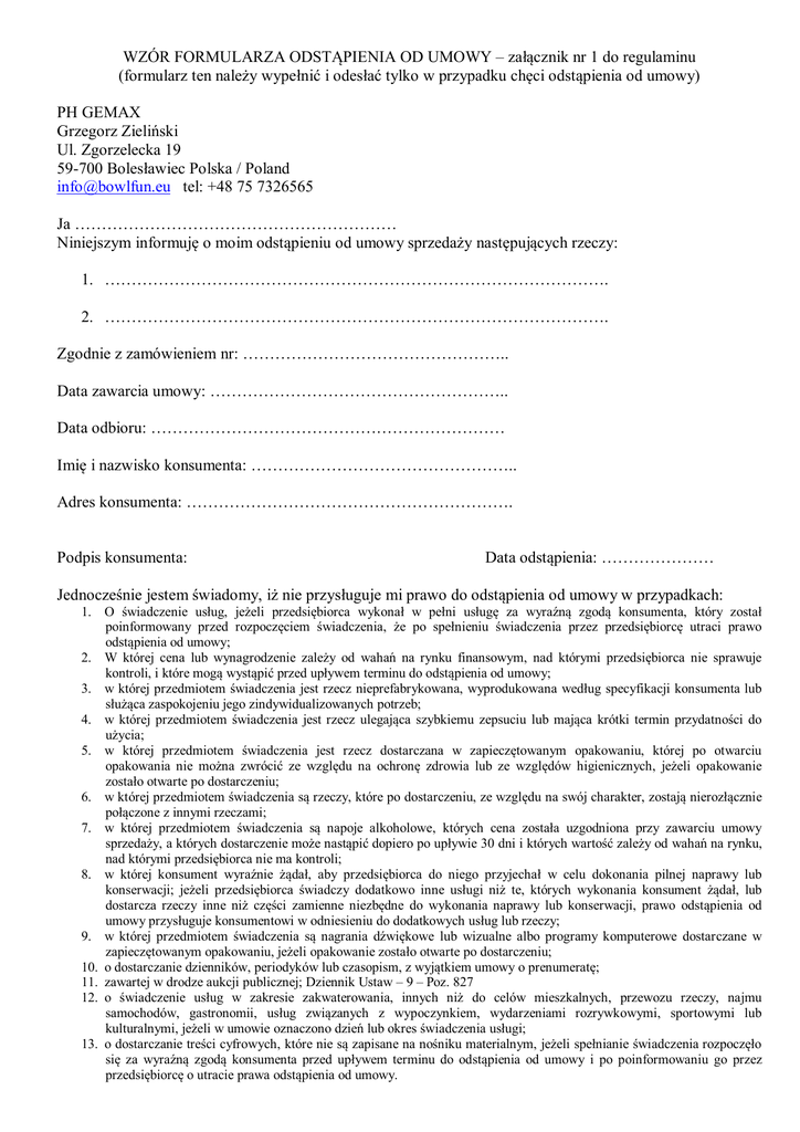 WZÓR FORMULARZA ODSTĄPIENIA OD UMOWY – załącznik nr 1 do regulaminu (formularz ten należy wypełnić i odesłać tylko w przypadku chęci odstąpienia od umowy) PH GEMAX Grzegorz Zieliński Ul. Zgorzelecka 19 59-700 Bolesławiec Polska / Poland [email protected] tel: +48 75 7326565 Ja …………………………………………………… Niniejszym informuję o moim odstąpieniu od umowy sprzedaży następujących rzeczy: 1. …………………………………………………………………………………. 2. …………………………………………………………………………………. Zgodnie z zamówieniem nr: ………………………………………….. Data zawarcia umowy: ……………………………………………….. Data odbioru: ………………………………………………………… Imię i nazwisko konsumenta: ………………………………………….. Adres konsumenta: ……………………………………………………. Podpis konsumenta: Data odstąpienia: ………………… Jednocześnie jestem świadomy, iż nie przysługuje mi prawo do odstąpienia od umowy w przypadkach: 1. O świadczenie usług, jeżeli przedsiębiorca wykonał w pełni usługę za wyraźną zgodą konsumenta, który został poinformowany przed rozpoczęciem świadczenia, że po spełnieniu świadczenia przez przedsiębiorcę utraci prawo odstąpienia od umowy; 2. W której cena lub wynagrodzenie zależy od wahań na rynku finansowym, nad którymi przedsiębiorca nie sprawuje kontroli, i które mogą wystąpić przed upływem terminu do odstąpienia od umowy; 3. w której przedmiotem świadczenia jest rzecz nieprefabrykowana, wyprodukowana według specyfikacji konsumenta lub służąca zaspokojeniu jego zindywidualizowanych potrzeb; 4. w której przedmiotem świadczenia jest rzecz ulegająca szybkiemu zepsuciu lub mająca krótki termin przydatności do użycia; 5. w której przedmiotem świadczenia jest rzecz dostarczana w zapieczętowanym opakowaniu, której po otwarciu opakowania nie można zwrócić ze względu na ochronę zdrowia lub ze względów higienicznych, jeżeli opakowanie zostało otwarte po dostarczeniu; 6. w której przedmiotem świadczenia są rzeczy, które po dostarczeniu, ze względu na swój charakter, zostają nierozłącznie połączone z innymi rzeczami; 7. w której przedmiotem świadczenia są napoje alkoholowe, których cena została uzgodniona przy zawarciu umowy sprzedaży, a których dostarczenie może nastąpić dopiero po upływie 30 dni i których wartość zależy od wahań na rynku, nad którymi przedsiębiorca nie ma kontroli; 8. w której konsument wyraźnie żądał, aby przedsiębiorca do niego przyjechał w celu dokonania pilnej naprawy lub konserwacji; jeżeli przedsiębiorca świadczy dodatkowo inne usługi niż te, których wykonania konsument żądał, lub dostarcza rzeczy inne niż części zamienne niezbędne do wykonania naprawy lub konserwacji, prawo odstąpienia od umowy przysługuje konsumentowi w odniesieniu do dodatkowych usług lub rzeczy; 9. w której przedmiotem świadczenia są nagrania dźwiękowe lub wizualne albo programy komputerowe dostarczane w zapieczętowanym opakowaniu, jeżeli opakowanie zostało otwarte po dostarczeniu; 10. o dostarczanie dzienników, periodyków lub czasopism, z wyjątkiem umowy o prenumeratę; 11. zawartej w drodze aukcji publicznej; Dziennik Ustaw – 9 – Poz. 827 12. o świadczenie usług w zakresie zakwaterowania, innych niż do celów mieszkalnych, przewozu rzeczy, najmu samochodów, gastronomii, usług związanych z wypoczynkiem, wydarzeniami rozrywkowymi, sportowymi lub kulturalnymi, jeżeli w umowie oznaczono dzień lub okres świadczenia usługi; 13. o dostarczanie treści cyfrowych, które nie są zapisane na nośniku materialnym, jeżeli spełnianie świadczenia rozpoczęło się za wyraźną zgodą konsumenta przed upływem terminu do odstąpienia od umowy i po poinformowaniu go przez przedsiębiorcę o utracie prawa odstąpienia od umowy. Return Form- Appendix 1 to the Terms and Conditions (This form is only for customers who want to return items.) PH GEMAX Grzegorz Zielinski Zgorzelecka 19 PL59700 Boleslawiec Poland [email protected] +48757326565 Name: I hereby declare that I want to return following items based on Terms and Conditions of the agreement I entered: 1. 2. Order Number: ……………………………………. Date of placing order: …………………………………….. Date of receiving items: ……………………………………. Full name of customer: ……………………………………... Address: ………………………………………………………………………………………….. Signature: ………………………….. Date of return: ………………………. At the same time I am aware that I can not return items in following cases: 1. After the company have given the service to customer who agreed that this service will not grant him the right to rescind the contract. 2. If the price is dependant on market fluctuations that are independent from the company, and if those fluctuations occur before rescind from contract. 3. If customer orders personalised item to match his specified design or any other specified request. 4. If the item has very short lifespan or its expiration date occurs very quickly. 5. If the item has a seal that when it is broken can not be return due to hygienic reasons, if item was opened after it was received. 6. If the items delivered based on its character can not be detached from other items. 7. If the items are alcoholic beverages which price was agreed and delivery can take up to 30 days and which are prone to market fluctuations that can not be controlled by company. 8. If consumer clearly demanded for the company to come and perform repair or conservation, if company offers other services than the one that consumer req