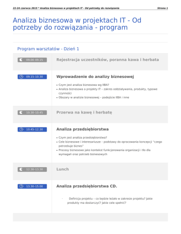 22-24 czerwca 2015 * Analiza biznesowa w projektach IT - Od potrzeby do rozwiązania Strona 1 Analiza biznesowa w projektach IT - Od potrzeby do rozwiązania - program Program warsztatów - Dzień 1 09.00–09.15 Rejestracja uczestników, poranna kawa i herbata 09.15–10.30 Wprowadzenie do analizy biznesowej ● Czym jest analiza biznesowa wg IIBA? ● Analiza biznesowa a projekty IT – zakres oddziaływania, produkty, typowe czynności ● Obszary w analizie biznesowej – podejście IIBA i inne 10.30–10.45 Przerwa na kawę i herbatę 10.45–12.30 Analiza przedsiębiorstwa ● Czym jest analiza przedsiębiorstwa? ● Cele biznesowe i interesariusze – podstawy do opracowania koncepcji “czego potrzebuje biznes” ● Procesy biznesowe jako kontekst funkcjonowania organizacji i tło dla wymagań oraz potrzeb biznesowych 12.30–13.30 Lunch 13.30–15.00 Analiza przedsiębiorstwa CD. · Definicja projektu – co będzie leżało w zakresie projektu? Jakie produkty ma dostarczyć? Jakie cele spełnić? 22-24 czerwca 2015 * Analiza biznesowa w projektach IT - Od potrzeby do rozwiązania Strona 2 Przerwa na kawę i herbatę 15.00–15.15 15.15–16.30 Planowanie komunikacji w analizie biznesowej i inżynierii wymagań ● Czemu ma służyć planowanie komunikacji? ● Co może być przedmiotem komunikacji? ● Plan komunikacji – udokumentowanie wymagań i założeń dotyczących komunikacji Program warsztatów - Dzień 2 09.00–10.30 Inżynieria wymagań ● Analiza biznesowa a inżynieria wymagań – związki, cele, zakres oddziaływania ● Podstawy inżynierii wymagań – terminologia, klasyfikacja wymagań ● Czynności wchodzące w skład inżynierii wymagań 10.30–10.45 Przerwa na kawę i herbatę 10.45–12.30 Identyfikacja wymagań ● Proces identyfikacji wymagań – cele, założenia, wymagania dla realizacji procesu ● Techniki identyfikacji wymagań i ich możliwe zastosowanie ● Śledzenie wymagań jako sposób zarządzania wymaganiami 12.30–13.30 Lunch 13.30–15.00 Analiza i dokumentacja wymagań ● Proces analizy i dokumentacji wymagań – cele, założenia, wymagania dla realizacji procesu ● Podejścia do analizy wymagań i analizy rozwiązania – użycie notacji do modelowania 22-24 czerwca 2015 * Analiza biznesowa w projektach IT - Od potrzeby do rozwiązania Strona 3 Przerwa na kawę i herbatę 15.00–15.15 15.15–16.30 Analiza i dokumentacja wymagań CD ● Różne sposoby dokumentowania wymagań ❍ Opis w języku naturalnym przy użyciu szablonów ❍ Przypadki użycia i scenariusze ❍ Prototypowanie Program warsztatów - Dzień 3 09.00–10.30 Tworzenie specyfikacji wymagań ● Czym jest specyfikacja wymagań? ● Różne typy specyfikacji wymagań – przykłady bazujące na IEEE 830, UML, SysML, metodach Agile 10.30–10.45 Przerwa na kawę i herbatę 10.45–12.30 Specyfikacja wymagań CD ● Zawartość SRS wg IEEE 830 ● Błędy i dobre praktyki w specyfikacji wymagań 12.30–13.30 Lunch 13.30–14.45 Ocena i walidacja rozwiązania 14.45–15.00 ● Czym jest ocena rozwiązania? ● Czym jest walidacja rozwiązania? ● Umiejscowienie oceny i walidacji rozwiązania w cyklu życia produktu IT Przerwa na kawę i herbatę 22-24 czerwca 2015 * Analiza biznesowa w projektach IT - Od potrzeby do rozwiązania Strona 4 Zarządzanie jakością wymagań 15.00–16.00 ● Proces zarządzania jakością – krótkie wprowadzenie, terminologia, podstawowe techniki ● 16.00–16.15 Przykłady wykorzystania technik zarządzania jakością w analizie biznesowej Podsumowanie i rozdanie certyfikatów Organizatorzy dołożą wszelkich starań, aby konferencja odbyła się zgodnie z prezentowanym programem, jednak zastrzega się możliwość częściowych zmian. x
