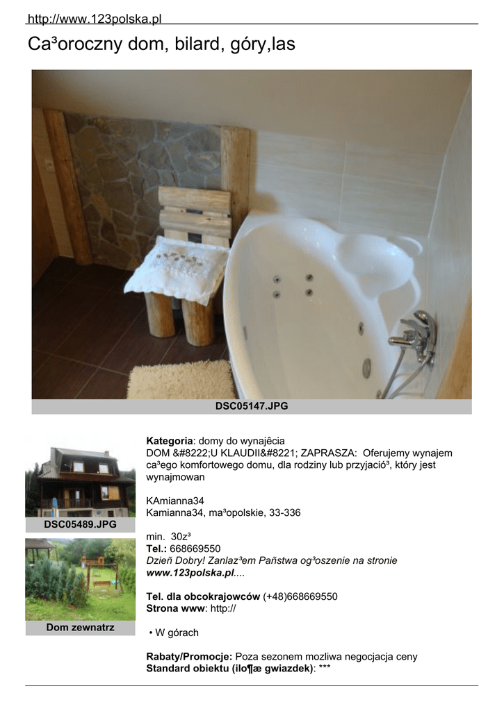 http://www.123polska.pl Ca³oroczny dom, bilard, góry,las DSC05147.JPG Kategoria: domy do wynajêcia DOM „U KLAUDII” ZAPRASZA: Oferujemy wynajem ca³ego komfortowego domu, dla rodziny lub przyjació³, który jest wynajmowan KAmianna34 Kamianna34, ma³opolskie, 33-336 DSC05489.JPG min. 30z³ Tel.: 668669550 Dzieñ Dobry! Zanlaz³em Pañstwa og³oszenie na stronie www.123polska.pl.... Tel. dla obcokrajowców (+48)668669550 Strona www: http:// Dom zewnatrz • W górach Rabaty/Promocje: Poza sezonem mozliwa negocjacja ceny Standard obiektu (ilo¶æ gwiazdek): *** http://www.123polska.pl Obiekt: ca³oroczny Pe³en opis obiektu DSC05500.JPG DSC05505.JPG DSC05508.JPG DOM „U KLAUDII” ZAPRASZA:Oferujemy wynajem ca³ego komfortowego domu, dla rodziny lub przyjació³, który jest wynajmowany przez ca³y rok. Zapraszamy na ferie, weekendy, wakacje, sylwestra, weekend majowy oraz wtedy „kiedy znajdziesz czas warto nas odwiedziæ”. Dom jest po³o¿ony w miejscowo¶ci Kamianna ok. 10km od Krynicy Zdroju. To spokojna miejscowo¶æ po³o¿ona w piêknej okolicy otoczonej lasami, górami, cisz± . Obiekt sk³ada siê z 4 pokoi,(dwa pokoje 4 osobowe i dwa 2 osobowe) 3 ³azienek, przytulnego salonu z kominkiem, TV-cyfra, DVD, playstation 2, kuchnii z jadalni±, Na wyposa¿eniu domu: pralka, suszarka, lodówka z zamra¿ark±, kuchenka gazowa z piekarnikiem, mikrofala, toster, mikser, zmywarka do naczyñ, garnki, zastawa obiadowa, oraz wiele akcesoriów kuchennych, , le¿aki, deska do prasowania , ¯elasko,Aby uprzyjemniæ wypoczynek w ogrodzie oferujemy Pañstwu (trampolina, ping-pong ,basen okres lipiec,sierpieñ) miejsce na ognisko, grill. Do dyspozycji Pañstwa jest 5 rowerów górskich , które daj± mo¿liwo¶æ pokonywania rozmaitych tras i szlaków górskich. Dla najm³odszych drewniany plac zabaw , piaskownica, zje¿d¿alnia, ¶ciana wspinaczkowa, zabawki dla dzieci. Ca³o¶æ domu posiada ogrzewanie centralne piec VAILANT dwufunkcyjny. Dla poprawienia nastroju i dla w³asnej przyjemno¶ci mo¿na zapaliæ w kominku. Ca³a oferta jest zgodna ze zdjêciami. itd. Wnêtrze wykoñczone w ciep³ych kolorach daje przytulny klimat.Na narciarzy w Kamiannej czekaj± 3 niewielkie rodzinne wyci±gi narciarskie oraz restauracja. Do dyspozycji go¶ci 6 par sanek. Mo¿liwo¶æ zorganizowania kuligu z pieczeniem kie³basek po wcze¶niejszym uzgodnieniu. Okoliczne lasy obfituj± w jagody i grzyby wiec zapraszamy amatorów zbierania owoców le¶nych. Serdecznie zapraszam Pañstwa, którzy pragn± odpocz±æ w cichej , spokojnej miejscowo¶ci jakim jest Kamianna. Na miejscu s± trzy sklepy spo¿ywcze, restauracja, skansen, ko¶ció³. Na miejscu równie¿ mo¿na posmakowaæ oscypków, wiejskiego chleba, oraz pysznych wypieków (po wcze¶niejszym zamówieniu) Minimalny okres pobytu w sezonie to od soboty do soboty lub od niedzieli do niedzieli. Natomiast poza sezonem 2 doby. Cena wynajmu domu to 250-350za dobê. Koñcowe sprz±tanie 150, drewno 80z³ do kominka Przy mniejszej ilo¶ci osób oraz poza sezonem cena ustalana indywidualnie. Serdecznie zapraszamKlaudia Sowa668 669 550 Kamianna dom 18 474 16 86 Oferowane pokoje: 2-osobowe: 2 pokoi(-je) 4-osobowe: 2 pokoi(-je) Ilo¶æ domków trzyrodzinnych (i wiêksze): 1 Cena za ca³o¶æ: Cena za dobê (za ca³o¶æ): 400 z³ Cena za miesi±c (za ca³o¶æ): 2500 z³ Ca³kowieta ilo¶c miejsc noclegowych: ok. 14 http://www.123polska.pl Cena za osobê (w SEZONIE): w pokoju 1-osob: 30 z³ w pokoju 2-osob: 50 z³ w pokoju 3-osob: 60 z³ w pokoju 4 osob: 100 z³ Cena za ma³e dzieci: - dzieci do 4 lat GRATIS ! Cena za dzieci: - dzieci do 4 lat 50-75% ceny Wy¿ywienie: • Mo¿liwo¶æ zorganizowania obiadów (w innym obiekcie) • Wspólna kuchnia do dyspozycji Na terenie obiektu: • pralnia • salka TV • sala kominkowa • billard • grill • miejsce na ognisko • basen • plac zabaw • tenis sto³owy • mo¿liwo¶æ przechowania rowerów • mo¿liwo¶æ przechowania nart • parking Pozosta³e: • wystawiamy faktury VAT • akceptujemy zwierzêta • zakaz palenia w ca³ym obiekcie • mówimy po angielsku W KA¯DYM pokoju apartamencie domku: • toaleta • ³azienka • prysznic • wanna • tylko umywalka • lodówka • czajnik elektryczny • garnki • podstawowe naczynia • sztuæce • telewizor • telefon wewnêtrzny • balkon W pobli¿u: do sklepu: 50 km