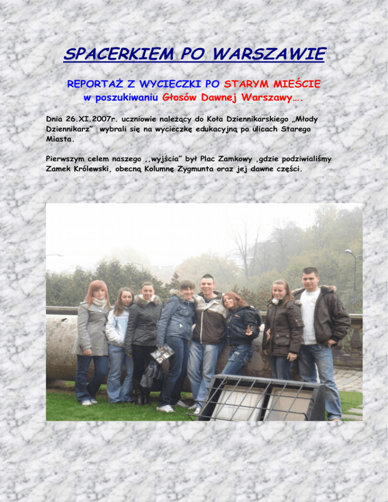 SPACERKIEM PO WARSZAWIE REPORTAŻ Z WYCIECZKI PO STARYM MIEŚCIE w poszukiwaniu Głosów Dawnej Warszawy…. Dnia 26.XI.2007r. uczniowie należący do Koła Dziennikarskiego „Młody Dziennikarz” wybrali się na wycieczkę edukacyjną po ulicach Starego Miasta. Pierwszym celem naszego ,,wyjścia” był Plac Zamkowy ,gdzie podziwialiśmy Zamek Królewski, obecną Kolumnę Zygmunta oraz jej dawne części. Następnie skręciliśmy w ulicę Świętojańską, na której znajduje się budynek Archikatedry. Znaleźliśmy też trochę czasu na zmierzenie … zbędnych kilogramów :P J Idąc wzdłuż ulicy Świętojańskiej i podziwiając architekturę kamienic ,dotarliśmy do ulicy Zapiecek znajdującej się obok wejścia na Rynek Starego Miasta. W tym miejscu znajduje się tablica upamiętniająca wpisanie Starego Miasta na Listę Światowego Dziedzictwa Kulturowego (UNESCO). Urzeczeni urokiem dobytku kulturowego naszej stolicy udaliśmy się na Rynek Starego Miasta. Rynek możemy podzielić na cztery strony: 1. Dekerta 2. Zakrzewskiego 3. Kołłątaja 4. Barssa W następnej kolejności udaliśmy się na ulicę Kanonia blisko arcypsy Archikatedry, a następnie zgodnie z legendą …wypowiedzieliśmy swoje życzenia przy dzwonie!!! Kiedy skończyliśmy zwiedzać ulicę Kanonia ,obejrzeliśmy Barbakan. Barbakan Warszawski – budowla obronna, wzniesiona około 1548 w pasie warszawskich murów obronnych na przejściu ze Starego do Nowego Miasta. Spacerek po Starej Warszawie obudził Jej głosy,,, Głosy Dawnej Warszawy… Bo…jak przygoda, to tylko w Warszawie…. Wsłuchani w głosy dawnej Warszawy… Słyszeliśmy, zaklęte w kamieniach echa Jej Sławy… Barbakan…. Poważny, samotny, dumny… Stoi Barbakan na Starówki straży. Wycieczki nie wiedzą, nie słyszą kolumny Że jeszcze niejedna odsiecz mu się marzy… Barbakan – strażnik odwieczny nas woła, czas historii szmerem wiatru przywołuje. Warszawie, Wiśle, Zygmuntowej Kolumnie Staremu Miastu i Nam- wierność ślubuje… Bo po cóż spacerować po Starej Warszawie? Słuchać głosów dawnych, w murach zaklętych? Dziś nikt przecież nie marzy o takiej zabawie, Aby wskrzeszać dźwięki chwil …w czasie zamkniętych. A jednak jest w nas ,młodych trochę uniesienia, Szczypta zadumy, łyk ciekawości, haust chwili, Aby zobaczyć i na zawsze , dokładnie pamiętać, Że kiedyś inni tu żyli, oddychali i… jak my…byli. Po obejrzeniu Barbakanu skierowaliśmy się na Róg Placu Krasińskich oraz ulicy Długiej. Następnie przechadzaliśmy się ulicą Zakroczymską blisko kościoła Franciszkanów. Spacerkiem po Warszawie…słuchając Jej głosów dawnych i dzisiejszych… Kościół franciszkański, mimo że znajduje się na samym końcu turystycznego szlaku po warszawskiej „Starówce”, cieszy się licznymi odwiedzinami turystów i sympatyków. Tak oto klasa 3D TGH w składzie: Michał Kubiak Kamil Łuczyk Magdalena Karasiewicz Justyna Witczak Kinga Bartosiewicz Mateusz Birek Paulina Rydel Marta Woch Katarzyna Nowakowska.… …zakończyła wycieczkę z pozytywnymi wrażeniami oraz wzbogaconym umysłem (o nowe doświadczenia )J PS. Opiekunem Koła jest pani prof. Ewa Bielak- wychowawczyni naszej klasy!!!!