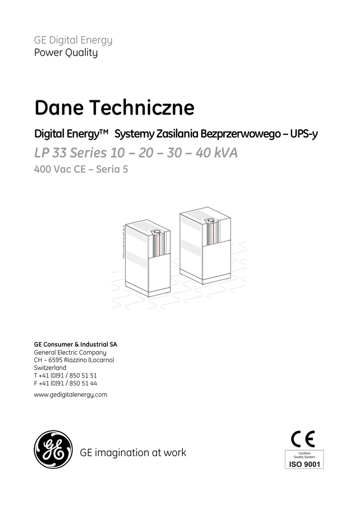 GE Digital Energy Power Quality Dane Techniczne Digital Energy™ Systemy Zasilania Bezprzerwowego – UPS-y LP 33 Series 10 – 20 – 30 – 40 kVA 400 Vac CE – Seria 5 GE Consumer & Industrial SA General Electric Company CH – 6595 Riazzino (Locarno) Switzerland T +41 (0)91 / 850 51 51 F +41 (0)91 / 850 51 44 www.gedigitalenergy.com GE imagination at work Model: LP 33 Series 10 – 20 – 30 - 40 kVA, Seria 5 Data wydania: 15.01.2008 Nazwa pliku: TDS_LPS_33E_10K_40K_5PL_V010 Wersja polska: 1.0 Numer ident.: Uaktualnienia Wersja Dotyczy Data COPYRIGHT © 2008 by GE Consumer & Industrial SA Wszelkie prawa zastrzeżone. Informacje zawarte w tej instrukcji są przeznaczone do wykorzystania tylko w celach opisywanych w instrukcji. Bieżąca publikacja ani żadna inna dokumentacja dostarczona z systemem UPS, nie może być w żaden sposób powielana, częściowo lub w całości, bez pisemnej zgody firmy GE. Ilustracje i schematy opisujące urządzenia służą tylko ogólnemu przedstawieniu opisywanego zagadnienia i mogą nie zawierać wszystkich szczegółów, jakie w urządzeniu występują w rzeczywistości. Producent zastrzega sobie prawo do wprowadzania poprawek do niniejszej instrukcji bez wcześniejszego powiadomienia. Prawo do zmian zastrzeżone TDS_LPS_33E_10K_40K_5PL_V010.doc Strona 2/6 Dane Techniczne LP 33 Series / 10-20-30-40 kVA / S5 DANE OGÓLNE Topologia Moc wyjściowa Znamionowy wyjściowy współczynnik mocy (L) Maksymalna moc aktywna w znamionowych warunkach pracy Całk. sprawność dla 100% obciążenia i trybu pracy VFI Całk. sprawność dla 100% obciążenia i trybu pracy ECO Rozproszenie ciepła dla 100% obciążenia w trybie pracy VFI, przy PF=0,8 L i naładowanych bateriach Wymagana ilość powietrza chłodzącego (25oC ÷ 30oC) Poziom głośności Typ baterii VFI-SS-111 (True on-line, podwójna konwersja energii) 10 20 30 40 kVA 1.0 1.0 1.0 0.8 kW 10 20 30 32 % 91.1 91.6 91.0 91.7 % 98.2 98.6 98.5 98.0 kW 0.78 1.47 2.37 2.90 m3/h 235 430 700 dB(A) 53 55 60 Standardowo: szczelne bezobsługowe baterie ołowiowe (standard VRLA) 850 65 kwasowo- UPS: 0oC ÷ 40oC (znamionowo 25oC) Bateria: 20oC ÷ 25oC (zakres zalecany) -25°C ÷ +55°C (im wyższa jest temperatura przechowywania, tym krótszy jest czas przechowywania baterii) Maks. 6 miesięcy Maks. 95% (bez kondensacji) 1000m 1500m: -5% / 2000m: -9% / 2500m: -14% / 3000m: -18% IP 20 (IEC 60529) EN 50091 / EN/IEC 62040, oznaczenie CE EN 50091-2 / EN/IEC 62040-2 Klasa A 4kV dotykowe / 8kV powietrzne Wszystkie aktywne części są osłonięte Konstrukcja metalowa, z kółkami samonastawnymi Obudowa dostosowana do transportu wózkiem widłowym RAL 9003 (biały) Minimalna odległość od ściany: 5cm Wymagany dostęp z lewej i z prawej strony urządzenia Od dołu, z lewej strony Wymuszone – od boku urządzenia do góry W celu zwiększenia mocy wyjściowej lub jako konfiguracja równoległa-redundancyjna - do 4 urządzeń (opcja) Temperatura otoczenia podczas pracy Temperatura przechowywania Czas przechow. baterii bez ich doładowywania przy 20oC Wilgotność względna Maks. wysokość n.p.m. bez zmniejszenia mocy wyjściowej Obniżenie mocy wyjściowej (zgodnie z EN/IEC 62040-3) Stopień ochrony Spełniane standardy EMC Odporność na rozładowania elektrostatyczne Zabezpieczenia wewnętrzne Obudowa Transportowanie Kolor Instalowanie Dostęp serwisowy Połączenia kablowe Chłodzenie Konfiguracja równoległa (wersja RPA) PROSTOWNIK Mostek prostownika Standardowe napięcia wejściowe Częstotliwość wejściowa Współczynnik mocy (wartość rzeczywista) Zniekształcenia prądu wejściowego (THDi) Tolerancja napięcia wyjściowego Pulsacje prądu DC Trójfazowy z zabezpieczeniem temperaturowym Znamionowe: 3 x 380V / 400V / 415V + N Prostownik akceptuje napięcia międzyfazowe w zakresie: 323÷460V Ograniczenie prądu ładowania baterii 50/60Hz +/-10% (45÷66Hz) >0,98 L <8% +/- 1% <40 mA (pk-pk) IU (DIN 41773), napięcie konserwujące temperaturowo Ustawiane programowo: 1,4A, 2,8A, 4,2A Znamionowa moc wejściowa kVA 10 20 30 40 kW 8.78 17.47 26.37 34.90 kW 9.68 19.27 29.07 37.12 A 1.4 2.8 4.2 4.2 Charakterystyka ładowania baterii Moc wejściowa przy znamionowym obciążeniu falownika, PF=0,8 L i naładowanych bateriach Maksymalna moc wejściowa przy znamionowym obciążeniu falownika i maksymalnym prądzie ładowania baterii (ustawiana programowo) Maksymalny prąd ładowania baterii (dla standardowej baterii wewnętrznej) Prawo do zmian zastrzeżone TDS_LPS_33E_10K_40K_5PL_V010.doc kompensowane Strona 3/6 Dane Techniczne LP 33 Series / 10-20-30-40 kVA / S5 BATERIA Ilość bloków zainstalowanych wewnątrz szafy UPS-a (12V / 7Ah) Napięcie konserwujące przy 20°C Minimalne napięcie rozładowania baterii Czas ponownego ładowania po powrocie sieci Automatyczny i ręczny test baterii Znamionowa moc wyjściowa Moc DC przy pełnym obciążeniu i PF=0,8 L Standardowy czas autonomii przy 100% obciążeniu i PF=0,8 L Standardowy czas autonomii przy 50% obciążeniu i PF=0,8 L Standardowo: szczelne bezobsługowe baterie kwasowoołowiowe (standard VRLA) 10kVA: 40 (2x20) 20kVA: 80 (2x2x20) 30-40kVA: 120 (3x 2x20) 2 x 273 VDC 2 x 198 Vdc (1.65 V/ogniwo) 6 ÷ 8 godzin Standardowo kVA 10 20 30 40 kW 8.8 17.5 26.4 35.0 min. 10 10 10 7 min. 26 26 26 15 Odpowiednie szafy bateryjne Patrz tabela na stronie 6 (wyposażenie dodatkowe) Typ baterii Czas autonomii przy 100% obciążeniu, PF=0,8L i tylko dla baterii bardzo dobrej jakości FALOWNIK Znamionowa moc wyjściowa Znamionowe napięcie wyjściowe (ustawiane przy instalacji) Mostek falownika Kształt napięcia wyjściowego Tolerancja napięcia wyjściowego: - statyczna ............................................................................................................ - dynamiczna (przy skoku obciążenia 0 – 100 – 0%) ........................ - dynamiczna (przy skoku obciążenia 0 – 50 – 0%) ........................... - czas regulacji do +/-1% .....................