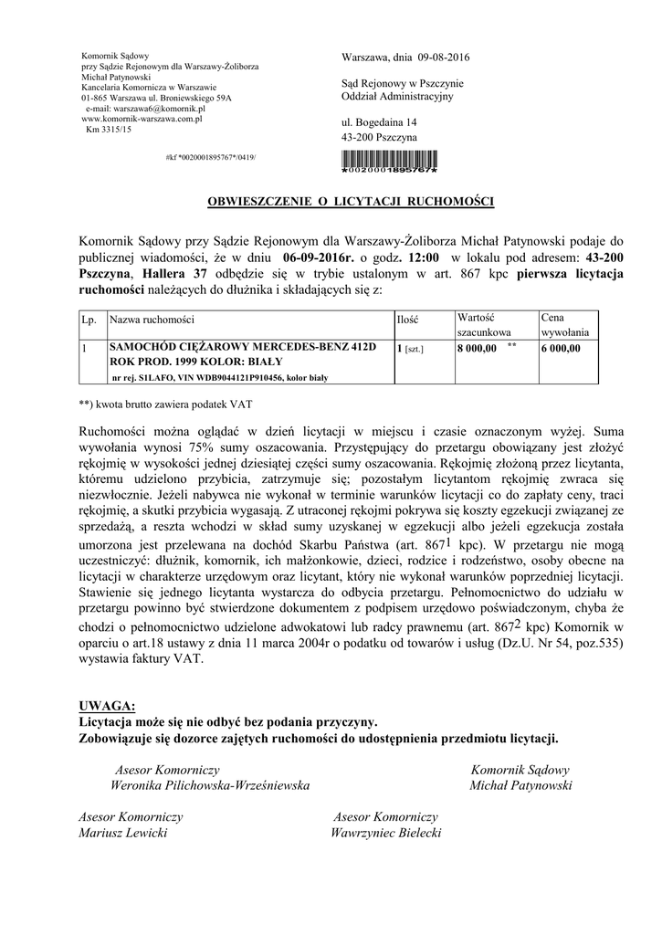 Komornik Sądowy przy Sądzie Rejonowym dla Warszawy-Żoliborza Michał Patynowski Kancelaria Komornicza w Warszawie 01-865 Warszawa ul. Broniewskiego 59A e-mail: [email protected] www.komornik-warszawa.com.pl Km 3315/15 #kf *0020001895767*/0419/ Warszawa, dnia 09-08-2016 Sąd Rejonowy w Pszczynie Oddział Administracyjny ul. Bogedaina 14 43-200 Pszczyna *0020001895767* OBWIESZCZENIE O LICYTACJI RUCHOMOŚCI Komornik Sądowy przy Sądzie Rejonowym dla Warszawy-Żoliborza Michał Patynowski podaje do publicznej wiadomości, że w dniu 06-09-2016r. o godz. 12:00 w lokalu pod adresem: 43-200 Pszczyna, Hallera 37 odbędzie się w trybie ustalonym w art. 867 kpc pierwsza licytacja ruchomości należących do dłużnika i składających się z: Lp. Nazwa ruchomości Ilość 1 SAMOCHÓD CIĘŻAROWY MERCEDES-BENZ 412D ROK PROD. 1999 KOLOR: BIAŁY 1 [szt.] Wartość szacunkowa 8 000,00 ** Cena wywołania 6 000,00 .nr rej. S1LAFO, VIN WDB9044121P910456, kolor biały **) kwota brutto zawiera podatek VAT Ruchomości można oglądać w dzień licytacji w miejscu i czasie oznaczonym wyżej. Suma wywołania wynosi 75% sumy oszacowania. Przystępujący do przetargu obowiązany jest złożyć rękojmię w wysokości jednej dziesiątej części sumy oszacowania. Rękojmię złożoną przez licytanta, któremu udzielono przybicia, zatrzymuje się; pozostałym licytantom rękojmię zwraca się niezwłocznie. Jeżeli nabywca nie wykonał w terminie warunków licytacji co do zapłaty ceny, traci rękojmię, a skutki przybicia wygasają. Z utraconej rękojmi pokrywa się koszty egzekucji związanej ze sprzedażą, a reszta wchodzi w skład sumy uzyskanej w egzekucji albo jeżeli egzekucja została umorzona jest przelewana na dochód Skarbu Państwa (art. 8671 kpc). W przetargu nie mogą uczestniczyć: dłużnik, komornik, ich małżonkowie, dzieci, rodzice i rodzeństwo, osoby obecne na licytacji w charakterze urzędowym oraz licytant, który nie wykonał warunków poprzedniej licytacji. Stawienie się jednego licytanta wystarcza do odbycia przetargu. Pełnomocnictwo do udziału w przetargu powinno być stwierdzone dokumentem z podpisem urzędowo poświadczonym, chyba że chodzi o pełnomocnictwo udzielone adwokatowi lub radcy prawnemu (art. 8672 kpc) Komornik w oparciu o art.18 ustawy z dnia 11 marca 2004r o podatku od towarów i usług (Dz.U. Nr 54, poz.535) wystawia faktury VAT. UWAGA: Licytacja może się nie odbyć bez podania przyczyny. Zobowiązuje się dozorce zajętych ruchomości do udostępnienia przedmiotu licytacji. Asesor Komorniczy Weronika Pilichowska-Wrześniewska Asesor Komorniczy Mariusz Lewicki Komornik Sądowy Michał Patynowski Asesor Komorniczy Wawrzyniec Bielecki Uwaga! 1.Każda sprawa posiada indywidualny numer rachunku bankowego i wszelkich wplat należy dokonywać na numer konta przypisany do konkretnej sprawy . 2. Jeżeli dłużnik posiada kilka spraw wpłat można dokonywać na dowolne ze wskazanych w pismach kont. 3.Punkt 2 nie dotyczy wpłat zaliczek od wierzycieli . Przyjęcia interesantów poniedziałek 15:00-18:00 czwartek 9:00-12:00 Telefony: 1. sekretariat: 22 498-9696, 22 8397125, 2. Kmp: 22 4231142, 3. Kms: 22 4231350, 4. Km: 22 4231143, 22 4231349, 5. nieruchomości: 22 3945149 Fax : 22 8694792 w/w telefony czynne są codziennie w godz. 12:00 - 14:00. 5. Kontakt drogą elektroniczną dla spraw alimentacyjnych : [email protected], dla spraw KMS : [email protected] Adresaci Sąd Rejonowy w Pszczynie Oddział Administracyjny 1. Kuczera Rafał, 43-200 Pszczyna 2. RP Kachnowicz EOS & M.Witoń Kancelaria Prawna Sp. k. Radca Prawny Izabela Kachnowicz, 02-366 Warszawa 3. Rafał Kuczera, 43-200 Pszczyna 4. Kuczera Rafał, 43-262 Radostowice 5. Sąd Rejonowy w Pszczynie Oddział Administracyjny, 43-200 Pszczyna 6. a/a
