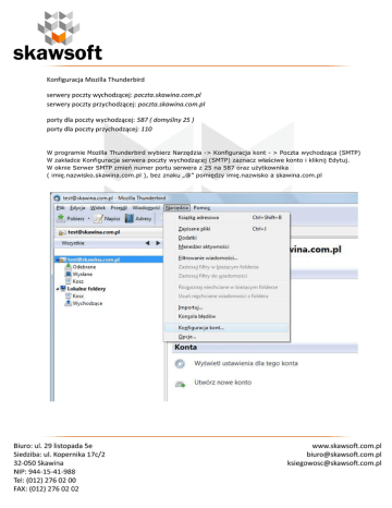Konfiguracja Mozilla Thunderbird serwery poczty wychodzącej: poczta.skawina.com.pl serwery poczty przychodzącej: poczta.skawina.com.pl porty dla poczty wychodzącej: 587 ( domyślny 25 ) porty dla poczty przychodzącej: 110 W programie Mozilla Thunderbird wybierz Narzędzia -> Konfiguracja kont - > Poczta wychodząca (SMTP) W zakładce Konfiguracja serwera poczty wychodzącej (SMTP) zaznacz właściwe konto i kliknij Edytuj. W oknie Serwer SMTP zmień numer portu serwera z 25 na 587 oraz użytkownika ( imię.nazwisko.skawina.com.pl ), bez znaku „@” pomiędzy imię.nazwisko a skawina.com.pl W Narzędzia -> Konfiguracja kont - > Konfiguracja serwera (POP3), w zakładce konta.