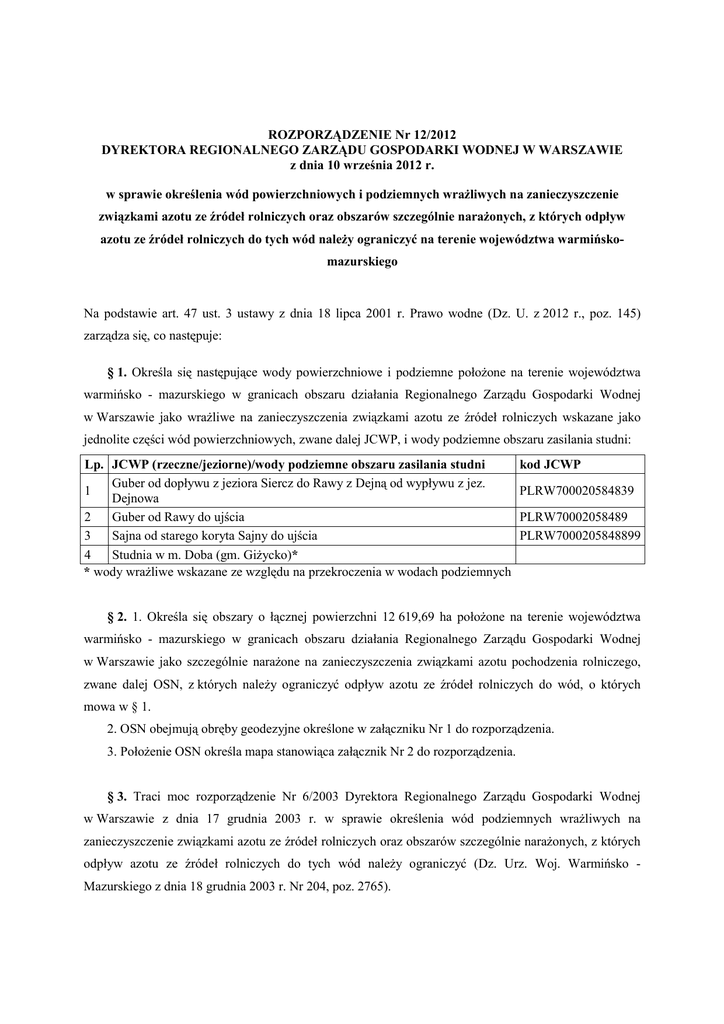 ROZPORZĄDZENIE Nr 12/2012 DYREKTORA REGIONALNEGO ZARZĄDU GOSPODARKI WODNEJ W WARSZAWIE z dnia 10 września 2012 r. w sprawie określenia wód powierzchniowych i podziemnych wraŜliwych na zanieczyszczenie związkami azotu ze źródeł rolniczych oraz obszarów szczególnie naraŜonych, z których odpływ azotu ze źródeł rolniczych do tych wód naleŜy ograniczyć na terenie województwa warmińskomazurskiego Na podstawie art. 47 ust. 3 ustawy z dnia 18 lipca 2001 r. Prawo wodne (Dz. U. z 2012 r., poz. 145) zarządza się, co następuje: § 1. Określa się następujące wody powierzchniowe i podziemne połoŜone na terenie województwa warmińsko - mazurskiego w granicach obszaru działania Regionalnego Zarządu Gospodarki Wodnej w Warszawie jako wraŜliwe na zanieczyszczenia związkami azotu ze źródeł rolniczych wskazane jako jednolite części wód powierzchniowych, zwane dalej JCWP, i wody podziemne obszaru zasilania studni: Lp. JCWP (rzeczne/jeziorne)/wody podziemne obszaru zasilania studni Guber od dopływu z jeziora Siercz do Rawy z Dejną od wypływu z jez. 1 Dejnowa 2 Guber od Rawy do ujścia 3 Sajna od starego koryta Sajny do ujścia 4 Studnia w m. Doba (gm. GiŜycko)* * wody wraŜliwe wskazane ze względu na przekroczenia w wodach podziemnych kod JCWP PLRW700020584839 PLRW70002058489 PLRW7000205848899 § 2. 1. Określa się obszary o łącznej powierzchni 12 619,69 ha połoŜone na terenie województwa warmińsko - mazurskiego w granicach obszaru działania Regionalnego Zarządu Gospodarki Wodnej w Warszawie jako szczególnie naraŜone na zanieczyszczenia związkami azotu pochodzenia rolniczego, zwane dalej OSN, z których naleŜy ograniczyć odpływ azotu ze źródeł rolniczych do wód, o których mowa w § 1. 2. OSN obejmują obręby geodezyjne określone w załączniku Nr 1 do rozporządzenia. 3. PołoŜenie OSN określa mapa stanowiąca załącznik Nr 2 do rozporządzenia. § 3. Traci moc rozporządzenie Nr 6/2003 Dyrektora Regionalnego Zarządu Gospodarki Wodnej w Warszawie z dnia 17 grudnia 2003 r. w sprawie określenia wód podziemnych wraŜliwych na zanieczyszczenie związkami azotu ze źródeł rolniczych oraz obszarów szczególnie naraŜonych, z których odpływ azotu ze źródeł rolniczych do tych wód naleŜy ograniczyć (Dz. Urz. Woj. Warmińsko Mazurskiego z dnia 18 grudnia 2003 r. Nr 204, poz. 2765). § 4. Rozporządzenie wchodzi w Ŝycie po upływie 14 dni od dnia ogłoszenia w Dzienniku Urzędowym Województwa Warmińsko - Mazurskiego. Załącznik Nr 1 do Rozporządzenia Nr 12/2012 Dyrektora RZGW w Warszawie z dnia 10 września 2012 r. 2 3 4 5 6 7 8 9 10 11 12 13 14 15 16 17 NUMER EWIDENCYJNY OBRĘBU GMINA POWIAT Bisztynek bartoszycki obszar wiejski NAZWA OSN warmińsko mazurskie warmińsko mazurskie warmińsko mazurskie warmińsko mazurskie warmińsko mazurskie warmińsko mazurskie warmińsko mazurskie warmińsko mazurskie warmińsko mazurskie warmińsko mazurskie warmińsko mazurskie warmińsko mazurskie warmińsko mazurskie warmińsko mazurskie warmińsko mazurskie warmińsko mazurskie warmińsko mazurskie NAZWA OBRĘBU 1 WOJEWÓDZTWO L.P. Wykaz obrębów ewidencyjnych objętych OSN 280104_5.0019 Swędrówka OSN Guber giŜycki GiŜycko 280604_2.0007 Kamionki OSN Doba kętrzyński Kętrzyn 280803_2.0003 Banaszki OSN Guber kętrzyński Kętrzyn 280803_2.0004 Biedaszki OSN Guber kętrzyński Kętrzyn 280803_2.0008 Gałwuny OSN Guber kętrzyński Kętrzyn 280803_2.0009 Gnatowo OSN Guber kętrzyński Kętrzyn 280803_2.0013 OSN Guber kętrzyński Kętrzyn 280803_2.0019 JeŜewo Kolonia Gnatowo OSN Guber kętrzyński Kętrzyn Korsze - obszar wiejski Korsze - obszar wiejski Korsze - obszar wiejski Korsze - obszar wiejski Korsze - obszar wiejski Korsze - obszar wiejski Korsze - obszar wiejski Korsze - obszar wiejski 280803_2.0025 Marszewo OSN Guber 280804_5.0008 Dubliny OSN Guber 280804_5.0014 Gudziki OSN Guber 280804_5.0017 Kowalewo OSN Guber 280804_5.0020 Łankiejmy OSN Guber 280804_5.0027 Płutniki OSN Guber 280804_5.0031 Równina Dolna OSN Guber 280804_5.0033 Saduny OSN Guber 280804_5.0047 Warnikajmy OSN Guber kętrzyński kętrzyński kętrzyński kętrzyński kętrzyński kętrzyński kętrzyński kętrzyński