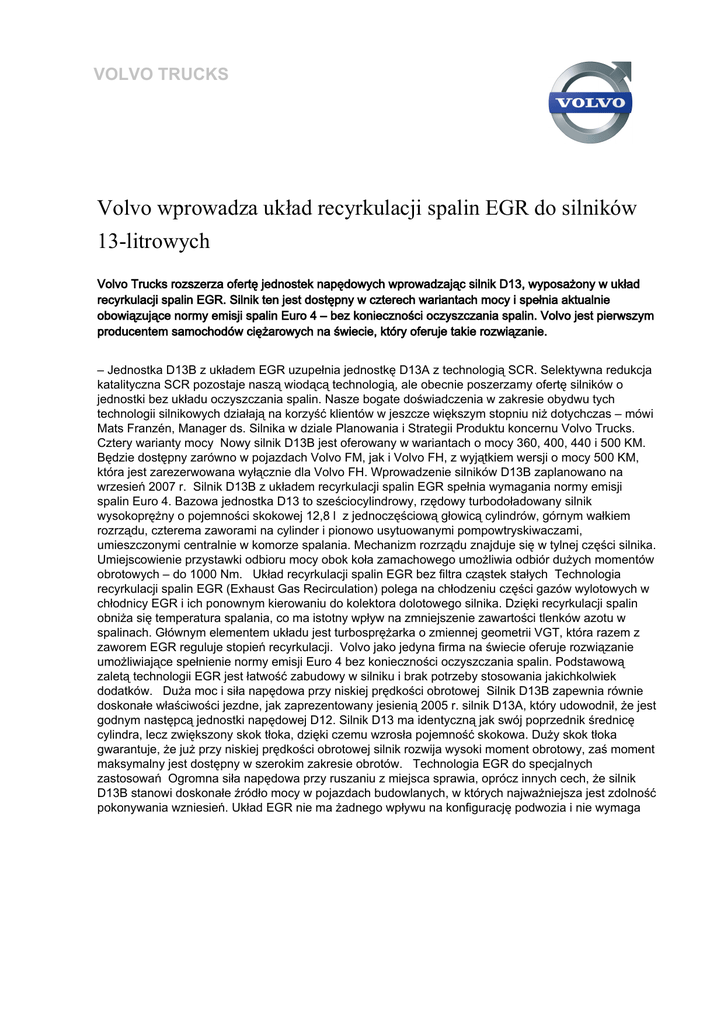 VOLVO TRUCKS Volvo wprowadza układ recyrkulacji spalin EGR do silników 13-litrowych Volvo Trucks rozszerza ofertę jednostek napędowych wprowadzając silnik D13, wyposażony w układ recyrkulacji spalin EGR. Silnik ten jest dostępny w czterech wariantach mocy i spełnia aktualnie obowiązujące normy emisji spalin Euro 4 – bez konieczności oczyszczania spalin. Volvo jest pierwszym producentem samochodów ciężarowych na świecie, który oferuje takie rozwiązanie. – Jednostka D13B z układem EGR uzupełnia jednostkę D13A z technologią SCR. Selektywna redukcja katalityczna SCR pozostaje naszą wiodącą technologią, ale obecnie poszerzamy ofertę silników o jednostki bez układu oczyszczania spalin. Nasze bogate doświadczenia w zakresie obydwu tych technologii silnikowych działają na korzyść klientów w jeszcze większym stopniu niż dotychczas – mówi Mats Franzén, Manager ds. Silnika w dziale Planowania i Strategii Produktu koncernu Volvo Trucks. Cztery warianty mocy Nowy silnik D13B jest oferowany w wariantach o mocy 360, 400, 440 i 500 KM. Będzie dostępny zarówno w pojazdach Volvo FM, jak i Volvo FH, z wyjątkiem wersji o mocy 500 KM, która jest zarezerwowana wyłącznie dla Volvo FH. Wprowadzenie silników D13B zaplanowano na wrzesień 2007 r. Silnik D13B z układem recyrkulacji spalin EGR spełnia wymagania normy emisji spalin Euro 4. Bazowa jednostka D13 to sześciocylindrowy, rzędowy turbodoładowany silnik wysokoprężny o pojemności skokowej 12,8 l z jednoczęściową głowicą cylindrów, górnym wałkiem rozrządu, czterema zaworami na cylinder i pionowo usytuowanymi pompowtryskiwaczami, umieszczonymi centralnie w komorze spalania. Mechanizm rozrządu znajduje się w tylnej części silnika. Umiejscowienie przystawki odbioru mocy obok koła zamachowego umożliwia odbiór dużych momentów obrotowych – do 1000 Nm. Układ recyrkulacji spalin EGR bez filtra cząstek stałych Technologia recyrkulacji spalin EGR (Exhaust Gas Recirculation) polega na chłodzeniu części gazów wylotowych w chłodnicy EGR i ich ponownym kierowaniu do kolektora dolotowego silnika. Dzięki recyrkulacji spalin obniża się temperatura spalania, co ma istotny wpływ na zmniejszenie zawartości tlenków azotu w spalinach. Głównym elementem układu jest turbosprężarka o zmiennej geometrii VGT, która razem z zaworem EGR reguluje stopień recyrkulacji. Volvo jako jedyna firma na świecie oferuje rozwiązanie umożliwiające spełnienie normy emisji Euro 4 bez konieczności oczyszczania spalin. Podstawową zaletą technologii EGR jest łatwość zabudowy w silniku i brak potrzeby stosowania jakichkolwiek dodatków. Duża moc i siła napędowa przy niskiej prędkości obrotowej Silnik D13B zapewnia równie doskonałe właściwości jezdne, jak zaprezentowany jesienią 2005 r. silnik D13A, który udowodnił, że jest godnym następcą jednostki napędowej D12. Silnik D13 ma identyczną jak swój poprzednik średnicę cylindra, lecz zwiększony skok tłoka, dzięki czemu wzrosła pojemność skokowa. Duży skok tłoka gwarantuje, że już przy niskiej prędkości obrotowej silnik rozwija wysoki moment obrotowy, zaś moment maksymalny jest dostępny w szerokim zakresie obrotów. Technologia EGR do specjalnych zastosowań Ogromna siła napędowa przy ruszaniu z miejsca sprawia, oprócz innych cech, że silnik D13B stanowi doskonałe źródło mocy w pojazdach budowlanych, w których najważniejsza jest zdolność pokonywania wzniesień. Układ EGR nie ma żadnego wpływu na konfigurację podwozia i nie wymaga VOLVO TRUCKS instalowania zbiornika AdBlue, ani żadnego układu oczyszczania spalin. Dzięki temu, wraz z silnikiem D13B oferowany jest, jako opcja, pionowy tłumik. – Układ EGR stanowi idealne rozwiązanie w wielu zadaniach specjalnych w transporcie budowlanym, gdzie wymagana jest duża elastyczność konfiguracji podwozia. Przykładem mogą być żurawie samojezdne lub pojazdy, w których konieczne jest stosowanie pionowych tłumików i rur wydechowych – wyjaśnia Mats Franzén. – Niemniej jednak w transporcie długodystansowym i innych zastosowaniach, wiążących się ze spalaniem dużych ilości paliwa, nadal rekomendujemy korzystanie z technologii SCR, która dziś zapewnia największe oszczędności paliwa. W nowym silniku D13B jest oczywiście dostępny wydajny hamulec silnikowy VEB+, rozwijający ogromną moc hamowania, wynoszącą 340 kW. Dzięki temu właściwości jezdne są doskonałe, zarówno podczas jazdy pod górę, jak i zjazdu ze wzniesienia. Dziewięć wariantów silnika D13 Z chwilą wprowadzenia silnika D13B klienci mogą wybierać spośród większej liczby opcji. Niezawodna jednostka napędowa D13 obejmuje teraz dwie serie silników: D13A i D13B – łącznie daje to aż dziewięć wariantów. Typoszereg silników D13 SilnikTechnologiaNorma emisji spalinMoc kW/KMMoment obrotowy Nm D13A 360SCREuro 4/Euro 5264/3601800 D13A 400SCREuro 4/Euro 5294/4002000 D13A 440SCREuro 4/Euro 5324/4402200 D13A 480SCREuro 4/Euro 5353/4802400 D13A 520SCREuro 4/Euro 5382/5202500 D13B 360EGREuro 4264/3601800 D13B 400EGREuro 4294/4002000 D13B 440EGREuro 4324/4402200 D13B 500EGREuro 4368/5002400 23 kwietnia 2007 r. 4/25/2007 Aby uzyskać więcej informacji, skontaktuj się z: Marie Vassiliadis, tel.: +46 31 322 41 27, e-mail: [email protected] Renata Stefańska, tel.: +48 601 33 44 38, e-mail: [email protected]