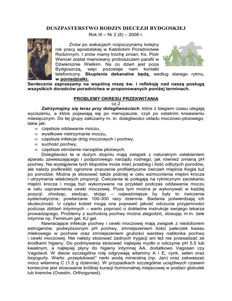 DUSZPASTERSTWO RODZIN DIECEZJI BYDGOSKIEJ Rok III – Nr 2 (8) – 2006 r. Znów po wakacjach rozpoczynamy kolejny rok pracy apostolskiej w Katolickim Poradnictwie Rodzinnym. I znów mamy trochę zmian: Ks. Piotr Wencel został mianowany proboszczem parafii w Dźwiersznie Wielkim. Na co dzień jest poza Bydgoszczą, więc pozostaje nam kontakt telefoniczny. Skupienia dekanalne będą, według starego rytmu, w poniedziałki. Serdecznie zapraszamy na wspólną mszę św. i refleksję nad naszą posługą wszystkich doradców poradnictwa w proponowanych poniŜej terminach. PROBLEMY OKRESU PRZEKWITANIA cz.2 Zatrzymajmy się teraz przy dolegliwościach, które z biegiem czasu ulegają wyciszeniu, a które pojawiają się po menopauzie, czyli po ostatnim krwawieniu miesięcznym. Do tej grupy zaliczamy m. in. dolegliwości układu moczowo-płciowego, takie jak: • częstsze oddawanie moczu, • wysiłkowe nietrzymanie moczu, • częstsze infekcje dróg moczowych i pochwy, • suchość pochwy, • częstsze obniŜenie narządów płciowych. Dolegliwości te w duŜym stopniu mają związek z naturalnym osłabieniem aparatu zawieszającego i podporowego narządu rodnego, jak równieŜ zmianą pH pochwy. Na wystąpienie tych kłopotów moŜe mieć przebieg i ilość odbytych porodów, ale naleŜy podkreślić ogromne znaczenie profilaktyczne ćwiczeń mięśnia Kegla tuŜ po porodzie. MoŜna je stosować takŜe później w celu wzmocnienia mięśni krocza i utrzymania właściwych proporcji. Ćwiczenia te polegają na rytmicznym zaciskaniu mięśni krocza i mogą być wykonywane na przykład podczas oddawania moczu w celu usprawnienia cewki moczowej. Poza tym moŜna je wykonywać w kaŜdej pozycji: chodząc, siedząc, stojąc – najwaŜniejsze by były to ćwiczenia systematyczne, powtarzane 100-300 razy dziennie. Badania potwierdzają ich skuteczność. U części kobiet mogą one poprawić jakość odczucia przyjemności podczas zbliŜeń intymnych – warto poprosić o dokładne instrukcje swojego lekarza prowadzącego. Problemy z suchością pochwy moŜna złagodzić, stosując m.in. Ŝele intymne np. Feminum gel, KJ gel. Nawracające infekcje pochwy i cewki moczowej mają związek z niedoborem estrogenów, podwyŜszonym pH pochwy, zmniejszeniem ilości pałeczek kwasu mlekowego w pochwie oraz zmniejszeniem grubości warstwy nabłonka pochwy i cewki moczowej. Nie naleŜy stosować Ŝadnych irygacji ani teŜ nie przesadzać ze środkami higieny. Do podmywania stosować najlepiej mydło o odczynie pH 5,5 lub kwaśnym, a najlepiej płyny do higieny intymnej AA, dodatkowo Vagosan czy Vagolavit. W diecie szczególna rolę odgrywają witaminy A i E, cynk, selen oraz biojogurty. Warto „przepłukiwać” nerki wodą mineralną (np. Jan) oraz zakwaszać mocz witaminą C (1,5 g dziennie). W przypadkach szczególnie uciąŜliwych czasem konieczne jest stosowanie krótkiej kuracji hormonalnej miejscowej w postaci globulek lub kremów (Ovestin, Orthogynest). Drugą duŜą grupę dolegliwości stanowią choroby układu sercowonaczyniowego. Po menopauzie kobiety częściej zapadają na chorobę wieńcową, nadciśnienie, wylewy czy zawały. Hormonalna terapia zastępcza jest w tym przypadku jedną z moŜliwości działań profilaktycznych, nie naleŜy jednak zapominać, Ŝe głównymi przyczynami wspomnianych kłopotów są: otyłość, brak ruchu i niewłaściwa dieta, sprzyjające takŜe występowaniu miaŜdŜycy. Dlatego warto juŜ wcześnie pomyśleć o właściwym modelu odŜywiania. Obecnie zalecana jest szczególnie dieta śródziemnomorska: niskotłuszczowa, bogata w witaminy, mikroelementy i wielonienasycone kwasy tłuszczowe. Warto w szczególności uwzględnić te pokarmy, które wspomagają serce: • borówka i czarna jagoda, • buraki czerwone (wzmacniają naczynia krwionośne, obniŜają poziom cholesterolu i zapobiegają nadciśnieniu, dostarczają soli mineralnych i witaminy C – bardzo zdrowy jest zwłaszcza kwas buraczany), • cebula (działanie przeciwmiaŜdŜycowe), • czosnek (działanie przeciwmiaŜdŜycowe, antyoksydant), • chrzan, • fasola, soja, soczewica (bogate w witaminy z grupy B, E oraz w mikroelementy o właściwościach przeciwcholesterolowych), • dynia (źródło witamin: B, C i prowitaminy A), • grejpfrut (obniŜa poziom cholesterolu), • herbata (ma działanie przeciwzakrzepowe, herbata zielona ma właściwości oczyszczające i przeciwdziała udarowi mózgu), • jabłka (obniŜają poziom cholesterolu), • kawa bezkofeinowa parzona przez filtr, • karczochy (działanie przeciwmiaŜdŜycowe, źródło wit. C i selenu), • marchew, • oliwa z oliwek, • orzechy, migdały (działanie przeciwmiaŜdŜycowe, źródło witamin i selenu), • otręby, • płatki owsiane (wit. B i mikroelementy), • pyłek kwiatowy, • ryby (obniŜają ryzyko choroby wieńcowej), • seler (obniŜa ciśnienie), • owoce, warzywa, herbaty ziołowe. Starajmy się teŜ unikać stresów i jak najwięcej czasu spędzać na świeŜym powietrzu, z dala od spalin i zgiełku miasta. Pomocne mogą się okazać równieŜ wspomniane wcześniej preparaty ziołowe, które w swoim składzie zawierają m.in. głóg i miłorząb japoński. W razie wątpliwości naleŜy skonsultować się z lekarzem. c.d.n. REKOLEKCJE DLA DORADCÓW KATOLICKIEGO PORADNICTWA RODZINNEGO 7 – 9 VII 2006 Po raz kolejny w Diecezjalnym Ośrodku Rekolekcyjnym w Bydgoszczy przy ul. Piaski 65 przeŜywaliśmy doroczne dni skupienia dla pracowników Katolickiego Poradnictwa Rodzinnego. W tym roku rekolekcje poprowadził ks. Piotr Wencel – Diecezjalny Duszpasterz Rodzin. Uczestniczyło w nich 57 osób z całej diecezji (a jest nas ponad 160 doradców). W pierwszym dniu panie mgr psychologii Sylwia Kaniecka i Joanna Ćwiklińska z Bydgoskiego Ośrodka Rozwiązywania Problemów Alkoholowych poprowadziły warsztaty na temat komunikacji między ludźmi. Temat ten został podjęty po zasięgnięciu opinii wszystkich uc