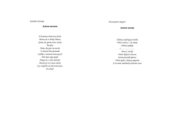 Karolina Korcipa Jesienne marzenia W jesienny słoneczny dzień Bawią się w berka chmury Gonią się, gonią coraz wyżej Do góry Słońce krzywi się trochę A złotych liści gromada Szybko z wiatrem tańczących Pod moje nogi spada Śmieję się z nimi radośnie Potańczyć też mam ochotę Czy znajdzie się mój towarzysz Na słotę? Przemysław Stępień Jesienne nastroje Chmury wędrują po niebie Wiatr tańczy i się śmieje Chmury pękają I ……………… Deszcz się leje Wiatr kołysze drzewa Jesień piosenki śpiewa Wiatr pędzi, chmury popycha A na mnie nadchodzi jesienna cisza Julia Rucińska Wiktoria Movsisyan Jesień Jesienna aura Ścieżką idzie Pani Jesień, napotyka dzieci Które niosą pełen koszyk pysznych smakołyków Jesień gubi złote liście, kasztany, żołędzie Dzieci uśmiechnięte zbierają je wszędzie Kolorowa jesień wędruje po polach Gubi babie lato oraz grzybów zapach Kolorowa i smutna Jesień do nas przybyła Drzewa chylą się ku ziemi Liście latają po szarych ulicach A ludzie uciekają przed wielkim deszczem Z utęsknieniem za ciepłą wiosną Choć jeszcze jesień! I do tego zima! Ale czekają na wiosnę! Powoli odchodzi nasza jesień kochana I wnet zagości zima biała… Zuzanna Gunera Eliza Hładowska Jesień Jesień Przyszła jesień w złocistej sukni Z czerwono-rudymi włosami Rozsypywała grzyby po lesie Wygoniła ptaki do ciepłych krajów Zaczarowała zwierzęta w sen zimowy Złota polska jesień ma różne oblicza Czasami jest piękna, pogoda się śmieje Liście tańczą i woda tańczy w rytm cza-cza-cza Fontanny deszczu spływają strugami i wiatr wieje Jesień śpiewa piosenki kolorowym drzewom Spadające liście kłaniają się nawet krzewom Jesień popłakała się Jej łzy przypominały małe perełki deszczu… Angelika Doroszczuk Opuszczona jesień Łzy jesiennego deszczu Smutno po szybie spływają Jesień samotna i opuszczona Czeka wciąż Na jedno dobre słowo Płaszczem kolorowych liści się okryła By jej zima nie przegoniła. Wiktoria Ryndak Jesienne rytmy Deszcz z chmury diamentami o rynny dzwoni Aż się do rytmu chce tańczyć i śpiewać Kroplami deszczu straszyła nas burza Teraz się słońce przegląda w kałużach Jesienny wiatr drzewom kołysankę śpiewa A wirujące liście spadają w dół Stanisława Pająk Joachim Hellwig Jesienny bal Kolorowa Jesień Jesień – kolorami maluje świat Drzewa ubiera w czerwienie, żółcie i brązy Wiewiórki swoimi ogonami zamiatają parkowe ścieżki A my ……………………………. Nurkujemy w górach liści Drzewko traci swój kożuszek Mrucząc coś pod nosem A listeczki zgrabnie, ładnie – Tańczą razem z wiatrem Ptaszki za to – Ptasi koncert zrobić Chciały Lecz kropelki w tym miejscu Ćwiczyć balet miały Klaudia Majcher Konrad Kudlak Magia jesieni Jesienne nastroje Jesienią …wszystko jest magiczne Drzewa kołyszą się rytmicznie A wiatr śpiewa im piosenki Muzyk – deszcz wydaje dźwięki Z nieba spadają diamentowe krople A ja stoję w deszczu i moknę Z drzew lecą kolorowe liście A pod nimi jest złociście Po lecie zostały wspomnienia Wspaniałe, wakacyjne marzenia. Wiatr kołysze śpiące drzewa Z których liść ostatni spadł Z szarej chmury prosto z nieba Krople deszczu kap, kap, kap… O szyby deszcz dzwoni jesienny A dzień jest szary i senny Tylko kolorowe parasole Te małe i duże Wesolutko skaczą przez deszczowe kałuże. Damian Dzikowski Marcin Kowalik Jesienne nastroje Jesienna pogoda Idzie do nas jesień A za nią chłodne dni Idzie do nas jesień I maluje liście drzew Choć pięknie i kolorowo wygląda teraz świat Szybciej kończy się dzień Słońce szybko znika już Wiatr zaczyna swą muzykę grać Krople deszczu tańczą w liściach drzew Nagle szary staje się świat… Wchodzi na palcach cisza, Nic nie słychać--------Tylko wiatr tańczy na deszczu Suche liście pod drzewem szeleszczą Wiatr popycha ciemne chmury Kapelusze fruwają do góry Na szybach deszczu Niejedna łza A w mym sercu Jesień gra………. Wiersze o tematyce jesiennej autorstwa uczniów klasy III c Jesienne nastroje Jesienne nastroje Sosnowiec, Jesień 2009 Dagmara Muzal Bartłomiej Mysłek Kapryśna Jesień Wzdłuż chodnika idzie jesień Garść kasztanów niesie Kiedy płacze – Tańczą krople deszczu Kiedy się złości – Pioruny łaskoczą chmury Gdy jest radosna – Słonko świeci A na dworze bawią się dzieci Jesienią tańczą korony drzew Deszcz gra na skrzypcach Wiatr śpiewa piosenki A liście szumiąc składnie Układają dywan ładnie Wczesnym rankiem znów widziałam Jesień Piękną, dumną i szczęśliwą Okryła cały świat rosą Zimną, srebrną i błyszczącą Zmienna jesień Jesień w duszy wszystkim gra Gdy jesienna pora szła Chmury płaczą, deszcz pada Taka aura się nie nada Gdy jest zimno i deszcz pada Każde dziecko wie Witaminy trzeba brać I ubierać ciepło się Czasem słońce zza chmury wyjdzie I uśmiechnie się radośnie Wtedy każde dziecko wie Że jesień zmienna jest Milena Korbut Wioletta Suska Jesienią Deszczowa jesień Pada i pada od samego ranka A zeschłe liście smutno mokną Rude wiewiórki wysuwają noski I szybko uciekają do dziupli Krople deszczu grają na oknie A deszcz wygląda jak fontanna Witr kołysze mokre drzewa I strąca liście do tańca Jesienią, piękną jesienią Drzewa kolorowe pomiędzy zielenią Złocą się ślicznie, aż miło popatrzeć Gdy w takt muzyki szumią wyraźnie Jeżyki zbierają jabłuszka przydrożne By na zimę spiżarnię swą pełną mieć