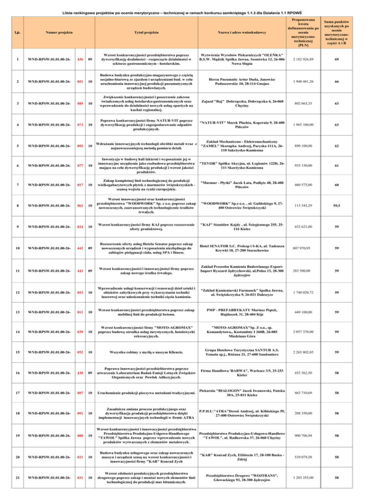 Llista rankingowa projektów po ocenie merytoryczno – technicznej w ramach konkursu zamkniętego 1.1.3 dla Działania 1.1 RPOWŚ Lp. 1 2 3 4 5 6 7 Tytuł projektu Nazwa i adres wnioskodawcy 09 Wzrost konkurencyjności przedsiębiorstwa poprzez dywersyfikację dzałalności - rozpoczęcie działalności w sektorze gastronomicznym - hotelarskim. Wytwórnia Wyrobów Piekarniczych "OLEŃKA" B.S.W. Mądzik Spółka Jawna, Sosnówka 12, 26-006 Nowa Słupia 2 182 926,89 69 10 Budowa budynku produkcyjno-magazynowego z częścią socjalno-biurową ze zjazdem i urządzeniami bud. w celu uruchomienia innowacyjnej produkcji pneumatycznych urządzeń budowlanych. Hercu Pneumatic Artur Duda, Janowice Poduszowskie 10, 28-114 Gnojno 1 948 441,26 66 10 Zwiększenie konkurencyjności i poszerzenie zakresu świadczonych usług hotelarsko-gastronomicznych oraz wprowadzenie do działalności nowych usług opartych na kuchni regionalnej. Zajazd "Raj" Dobrzączka, Dobrzączka 6, 26-060 Chęciny 802 663,33 63 10 Poprawa konkurencyjności firmy NATUR-VIT poprzez dywersyfikację produkcji i zagospodarowanie odpadów produkcyjnych. "NATUR-VIT" Marek Płachta, Kopernia 9, 28-400 Pińczów 1 965 100,00 63 10 Wdrażanie innowacyjnych technologii obróbki metali wraz z najnowoczesniejszą metodą pomiaru detali. Zakład Mechaniczno - Elektromechaniczny "ZAMEL" Skorupka Andrzej, Paryska 111A, 26110 Sakrżysko-Kamienna 890 100,00 62 10 Inwestycja w budowę hali lakierni i wyposażenie jej w innowacyjne urządzenie jako rozbudowa przedsiębiorstwa mająca na celu dywersyfikację produkcji i wzrost jakości produktów. "TEVOR" Spółka Akcyjna, ul. Legionów 122D, 26111 Skarżysko-Kamienna 935 150,00 61 10 Zakup kompletnej linii technologicznej do produkcji wielkogabarytowych płytek z marmurów świętokrzyskich szansą wejścia na rynki europejskie. "Marmur - Płytki" Jacek Łata, Podłęże 48, 28-400 Pińczów 460 575,00 60 "WOODWORK" Sp.z o.o. , ul. Gulińskiego 9, 27400 Ostrowiec Świętokrzyski 113 343,29 59,5 432 621,00 59 Numer projektu WND-RPSW.01.01.00-26- WND-RPSW.01.01.00-26- WND-RPSW.01.01.00-26- WND-RPSW.01.01.00-26- WND-RPSW.01.01.00-26- WND-RPSW.01.01.00-26- WND-RPSW.01.01.00-26- 436 051 085 073 092 077 017 L i Suma punktów c uzyskanych po ocenie z b merytorycznoa technicznej w p części A i B u Proponowana kwota dofinansowania po ocenie merytorycznotechnicznej [PLN] 8 WND-RPSW.01.01.00-26- 062 10 Wzrost innowacyjności oraz konkurencyjności przedsiębiorstwa "WOODWORK" Sp. z o.o. poprzez zakup nowoczesnych, zaawansowanych technologicznie środków trwałych. 9 WND-RPSW.01.01.00-26- 024 10 Wzrost konkurencyjności firmy KAJ poprzez rozszerzenie oferty produktowej. "KAJ" Stanisław Kajdy , ul. Ściegiennego 255, 25116 Kielce 09 Rozszerzenie oferty usług Hotelu Senator poprzez zakup nowoczesnych urządzeń i wyposażenia niezbędnego do zabiegów pielęgnacji ciała, usług SPA i fitness. Hotel SENATOR S.C. Prokop i S-KA, ul. Tadeusza Krywki 18, 27-200 Starachowice 807 970,95 59 09 Wzrost konkurencyjności i innowacyjności firmy poprzez zakup nowego środka trwałego. Zakład Przerobu Kamienia Budowlanego ExportImport Ryszard Jędrychowski, ul.Polna 13, 28-300 Jędrzejów 283 500,00 59 "Zakład Kamieniarski Furmanek" Społka Jawna, ul. Świętokrzyska 9, 26-021 Daleszyce 1 740 020,72 59 10 11 WND-RPSW.01.01.00-26- WND-RPSW.01.01.00-26- 442 443 12 WND-RPSW.01.01.00-26- 053 10 Wprowadzenie usługi konserwacji i renowacji dzieł sztuki i obiektów zabytkowych przy wykorzystaniu techniki laserowej oraz udoskonalenie techniki cięcia kamienia. 13 WND-RPSW.01.01.00-26- 011 10 Wzrost konkurencyjności przedsiębiorstwa poprzez zakup mobilnej linii do produkcji betonu. PMP - PREFABRYKATY Mariusz Piątek, Hajdaszek 31, 28-404 Kije 449 100,00 59 "MOTO-AGROMAX"Sp. Z o.o., sp. Komandytowa,, Kostomłoty I 260B, 26-085 Miedziana Góra 2 057 370,00 59 14 WND-RPSW.01.01.00-26- 039 10 Wzrost konkurencyjności firmy "MOTO-AGROMAX" poprzez budowę ośrodka usług turystycznych, hotelowychi rekreacyjnych. 15 WND-RPSW.01.01.00-26- 052 10 Wszystko robimy z myślą o naszym Kliencie. Grupa Hotelowo Turystyczna SANTUR A.S. Tomala sp.j., Różana 21, 27-600 Sandomierz 2 265 802,05 59 09 Poprawa innowacyjności przedsiebiorstwa poprzez utworzenie Laboratorium Badań Emisji Lotnych Związków Organicznych oraz Powłok Adhezyjnych. Firma Handlowa 'BARWA", Warkocz 3/5, 25-253 Kielce 452 362,50 58 10 Uruchomienie produkcji pieczywa metodami tradycyjnymi. Piekarnia "BIAŁOGON" Jacek Iwanowski, Pańska 30A, 25-811 Kielce 463 710,69 58 10 Zasadnicza zmiana procesu produkcyjnego oraz dywersyfikacja produkcji przedsiębiorstwa dzięki implementacji innowacyjnych technologii w firmie ATRA P.P.H.U."ATRA"Deroń Andrzej, ul. Kilińskiego 59, 27-400 Ostrowiec Świętokrzyski 208 350,00 58 Wzrost konkurencyjności i innowacyjności przedsiębiorstwa Przedsiębiorstwa Produkcjno-Usłgowo-Handlowego Przedsiębiorstwo Produkcyjno-Usługowo-Handlowe "TAWOL" Spółka Jawna poprzez wprowadzenie nowych "TAWOL", ul. Radkowska 37, 26-060 Chęciny produktów wytwarzanych z elementów metalowych. 900 706,94 58 16 17 18 19 20 21 WND-RPSW.01.01.00-26- WND-RPSW.01.01.00-26- WND-RPSW.01.01.00-26- WND-RPSW.01.01.00-26- WND-RPSW.01.01.00-26- WND-RPSW.01.01.00-26- 438 007 091 008 021 031 10 10 Budowa budynku usługowego oraz zakup nowoczesnych maszyn i urządzeń sznsą na wzrost konkurencyjności i innowacyjności firmy "KAR" Konrad Zych "KAR" Konrad Zych, Elżbiecin 17, 28-100 Busko Zdrój 539 079,58 58 10 Wzrost zdolności produkcyjnych przedsiębiorstwa drogowego poprzez zakup i montaż nowych elementów linii technologicznej do produkcji mas bitumicznych. Przedsiębiorstwo Drogowe "WOJTRANS", Głowackiego 93, 28-300 Jędrzejów 1 283 355,00 58 Lp. 22 Tytuł projektu Numer projektu WND-RPSW.01.01.00-26- 058 Wzrost konkurencyjności i innowacyjności przedsiębiorstwa 10 RASTER poprzez inwestycję w nowoczesny park maszynowy oraz wprowadzenie na rynek now