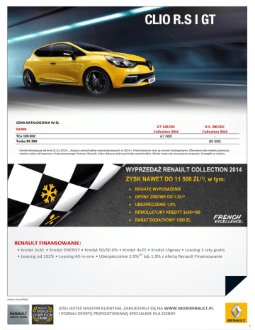 CENA KATALOGOWA W ZŁ SILNIK TCe 120 EDC Turbo RS 200 GT 120 EDC Collection 2014 R.S. 200 EDC Collection 2014 67 000 - 89 900 Cennik obowiązuje od dnia 01.01.2015 r., dotyczy samochodów wyprodukowanych w 2014 r. Prezentowane ceny są cenami katalogowymi. Oferowana dla modelu promocja zawiera rabat od importera i Autoryzowanego Partnera Renault, który dotyczy wybranej liczby samochodów. Oferta ważna do wyczerpania zapasów. Szczegóły w salonie. WYPRZEDAŻ RENAULT COLLECTION 2014 ZYSK NAWET DO 11 500 ZŁ(1), w tym: BOGATE WYPOSAŻENIE OPONY ZIMOWE OD 1 ZŁ(2) UBEZPIECZENIE 1,9% REWOLUCYJNY KREDYT 3x30=100 RABAT DODATKOWY 1500 ZŁ RENAULT FINANSOWANIE: • Kredyt 3x30 • Kredyt ENERGY • Kredyt 50/50 0% • Kredyt 4x25 • Kredyt Ulgowy • Leasing 3 raty gratis • Leasing od 102% • Leasing All-in-one • Ubezpieczenie 2,9%(3) lub 1,9% z ofertą Renault Finansowanie JEŚLI JESTEŚ NASZYM KLIENTEM, ZAREJESTRUJ SIĘ NA WWW.MOJERENAULT.PL I POZNAJ OFERTĘ PRZYGOTOWANĄ SPECJALNIE DLA CIEBIE! 1 WYPOSAŻENIE GT Collection 2014 R.S. Collection 2014 ABS z s ys temem ws poma ga ni a na głego ha mowa ni a Przedni e podus zki powi etrzne ki erowcy i pa s a żera Deza ktywa cja podus zki powi etrznej pa s a żera z przodu Boczne podus zki powi etrzne Regul a tor - ogra ni czni k prędkoś ci Sys tem ws poma ga ni a rus za ni a pod górę (Hi l l Sta rt As s i s t) Sys tem dyna mi cznej kontrol i toru ja zdy (ESC) z funkcją za pobi ega ni a poś l i zgowi kół pędnych przy rus za ni u (ASR) - możl i wy do wyłączeni a w wers ji R.S. ● ● ● ● ● ● ● ● ● ● ● ● ● ● Sygna ł ni eza pi ętych pa s ów bezpi eczeńs twa (na ws zys tki ch mi ejs ca ch) ● ● ● ● ● ● ● ● BEZPIECZEŃSTWO CZYNNE I BIERNE Przedni e pa s y bezpi eczeńs twa z regul a cją wys okoś ci , ogra ni czni ki em na pi ęci a i na pi na czem Tyl ne pa s y bezpi eczeńs twa : 3-punktowe, z ogra ni czni ka mi na pi ęci a na bocznych mi ejs ca ch Sys tem mocowa ni a fotel i ków dl a dzi ecka Is ofi x na bocznych mi ejs ca ch z tyłu WYGLĄD ZEWNĘTRZNY Za wi es zeni e Sport typowe dl a wers ji GT ● - Za wi es zeni e Sport typowe dl a wers ji RS - ● Za wi es zeni e CUP - P Czerwone za ci s ki ta rcz ha mul cowych - P Logo Rena ul t z ozna czeni em GT (wers ja GT) l ub RS (wers ja R.S.) ● ● Ozna kowa ni e MONACO GP na l i s twa ch bocznych ora z proga ch drzwi Przedni zderza k z a erodyna mi czna l i s twą przedni ą w kol orze s za rym (w kol orze l ś ni ącej czerni dl a Mona co GP) i ś wi a tła mi LED Przedni zderza k ze ś wi a tła mi LED na s za rym tl e ( dl a na dwozi a w kol orze Ni ebi es ki Ma l te i Cza rny Etoi l e; dl a pozos ta łych kol orów w kol orze l ś ni ącej czerni ) - - - ● ● - Boczne l i s twy ochronne w kol orze na dwozi a ze ws ta wka mi w kol orze s za rym ● ● Dyfuzor w kol orze s za rym z wbudowa nymi po boka ch końcówka mi rury wydechowej - ● Tyl ny zderza k z ozdobną l i s twą w kol orze s za rym i chromowa ną, podwójną rurą wydechu (ozdobna l i s twa w przypa dku za mówi eni a ka mery cofa ni a ) ● - Obudowy l us terek bocznych w kol orze s za rym ● - Obudowy l us terek bocznych w kol orze l ś ni ącej czerni - ● Przedni e zewnętrzne kl a mki drzwi w kol orze na dwozi a ● ● Przedni e zewnętrzne kl a mki drzwi w kol orze l ś ni ącej czerni - - Tyl ne zewnętrzne kl a mki drzwi ukryte przy tyl nym s łupku Tyl ny s pojl er da chowy Da ch i s pojl er da chowy w kol orze głęboki ej czerni Szyby tyl ne boczne i tyl na przyci emni a ne ● ● ● ● ● ● Obręcze kół ze s topu meta l i l ekki ch 17" GT ci emnos za re ● - Obręcze kół ze s topu meta l i l ekki ch 17" RS - ● Obręcze kół ze s topu meta l i l ekki ch 17" w kol orze cza rnym Obręcze kół ze s topu meta l i l ekki ch 18" Ra di ca l e (w kol orze cza rnym dos tępne w pa ki eci e Cup) La ki er meta l i zowa ny/ meta l i zowa ny s pecja l ny/ meta l i zowa ny s pecja l ny GT l ub RS La ki er ni emeta l i zowa ny/ ni emeta l i zowa ny s pecja l ny - - - P 1900/2100/2300 0 1900/2100/6000 0/650 ● 5000 ● ● ● ● ● ● 5000 ● ● ● Des ka rozdzi el cza z ozna czeni em Rena ul t Sport ● ● Wewnętrzne el ementy ozdobne w kol orze czerwonym - ● Wewnętrzne el ementy ozdobne w kol orze s za rym Wewnętrzne kl a mki drzwi chromowa ne ● ● ● Świ a tła do ja zdy dzi ennej z di oda mi LED Czujni k ś wi a tła i des zczu ● ● ● ● Lus terka boczne s kła da ne el ektryczni e, podgrzewa ne, z czujni ki em tempera tury zewnętrznej ● ● WYGLĄD WNĘTRZA Tona cja gra fi towa wnętrza Ta pi cerka gra fi towa z czerwonymi el ementa mi Ta pi cerka s kórza na Ta pi cerka gra fi towo- s za ra , z el ementa mi s kóry ekol ogi cznej Al umi ni owe peda ły Li s twy progowe z na pi s em RENAULT SPORT Ki erowni ca s kórza na z łopa tka mi s terującymi s krzyni ą bi egów WIDOCZNOŚĆ I OŚWIETLENIE GT Collection 2014 R.S. Collection 2014 ● ● ● 1000 ● ● ● 1000 1500 1500 ● ● ● ● ● ● ● P ● ● 1000 1000 - ● - ● ● ● ● ● ● ● - Kl i ma tyza cja a utoma tyczna ● ● Szyby przedni e regul owa ne el ektryczni e ( włączni k i mpul s owy po s troni e ki erowcy) ● ● Szyby tyl ne regul owa ne el ektryczni e Da ch pa nora mi czny s ta ły Os łona przeci ws łoneczna z za myka nym l us terki em po s troni e ki erowcy Os łona przeci ws łoneczna po s troni e pa s a żera bez l us terka /z l us terki em Uchwyt po s troni e pa s a żera z przodu i na dwóch bocznych mi ejs ca ch z tyłu Fotel ki erowcy z regul a cją wys okoś ci Za główki przedni e z regul a cją wys okoś ci Tyl na ka na pa dzi el ona w ukła dzi e 1/3-2/3 (opa rci e) z 3 za główka mi z regul a cją wys okoś ci ● 2600 ● ● ● ● ● ● ● ● ● ● ● ● ● Fotel e przedni e podgrzewa ne 1000 1000 Sys tem Rena ul t BASS REFLEX ● ● Rena ul t R-Sound Effect - a pl i ka cja dos tępna z R-l i n