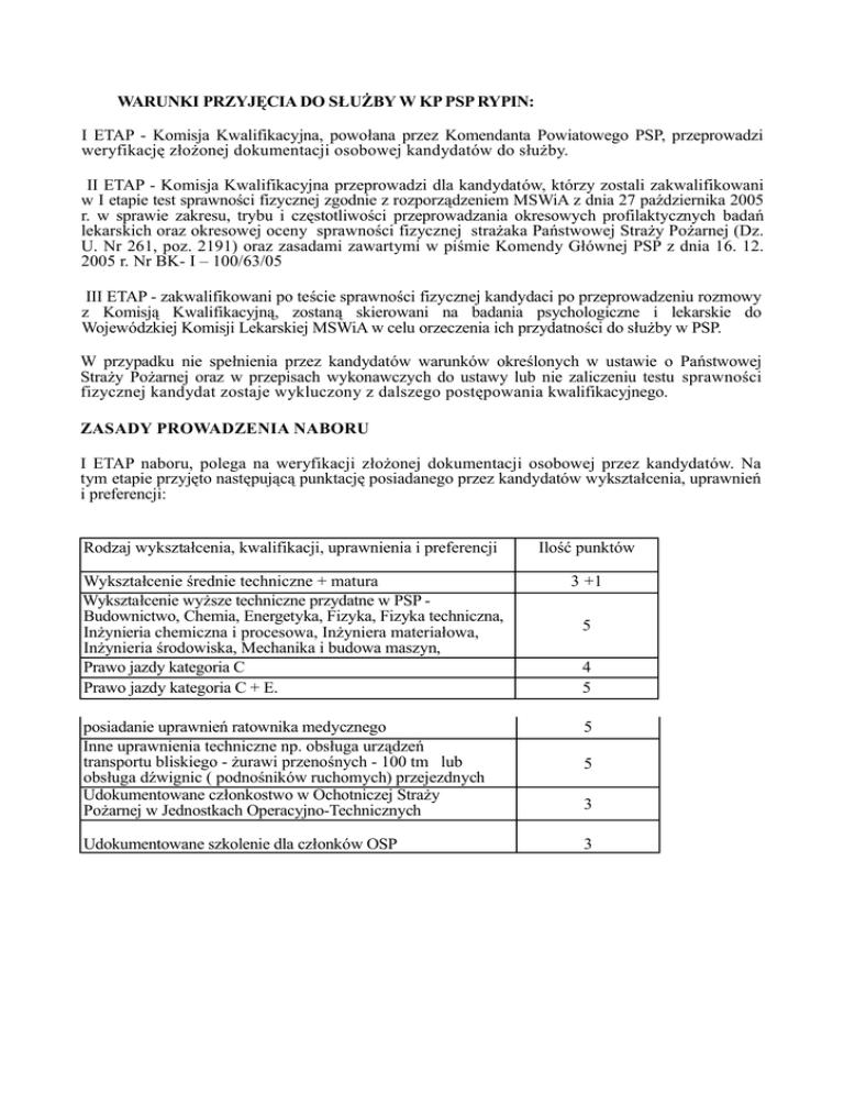 WARUNKI PRZYJĘCIA DO SŁUŻBY W KP PSP RYPIN: I ETAP - Komisja Kwalifikacyjna, powołana przez Komendanta Powiatowego PSP, przeprowadzi weryfikację złożonej dokumentacji osobowej kandydatów do służby. II ETAP - Komisja Kwalifikacyjna przeprowadzi dla kandydatów, którzy zostali zakwalifikowani w I etapie test sprawności fizycznej zgodnie z rozporządzeniem MSWiA z dnia 27 października 2005 r. w sprawie zakresu, trybu i częstotliwości przeprowadzania okresowych profilaktycznych badań lekarskich oraz okresowej oceny sprawności fizycznej strażaka Państwowej Straży Pożarnej (Dz. U. Nr 261, poz. 2191) oraz zasadami zawartymi w piśmie Komendy Głównej PSP z dnia 16. 12. 2005 r. Nr BK- I – 100/63/05 III ETAP - zakwalifikowani po teście sprawności fizycznej kandydaci po przeprowadzeniu rozmowy z Komisją Kwalifikacyjną, zostaną skierowani na badania psychologiczne i lekarskie do Wojewódzkiej Komisji Lekarskiej MSWiA w celu orzeczenia ich przydatności do służby w PSP. W przypadku nie spełnienia przez kandydatów warunków określonych w ustawie o Państwowej Straży Pożarnej oraz w przepisach wykonawczych do ustawy lub nie zaliczeniu testu sprawności fizycznej kandydat zostaje wykluczony z dalszego postępowania kwalifikacyjnego. ZASADY PROWADZENIA NABORU I ETAP naboru, polega na weryfikacji złożonej dokumentacji osobowej przez kandydatów. Na tym etapie przyjęto następującą punktację posiadanego przez kandydatów wykształcenia, uprawnień i preferencji: Rodzaj wykształcenia, kwalifikacji, uprawnienia i preferencji Ilość punktów Wykształcenie średnie techniczne + matura Wykształcenie wyższe techniczne przydatne w PSP Budownictwo, Chemia, Energetyka, Fizyka, Fizyka techniczna, Inżynieria chemiczna i procesowa, Inżyniera materiałowa, Inżynieria środowiska, Mechanika i budowa maszyn, Technologia chemiczna. Prawo jazdy kategoria C Prawo jazdy kategoria C + E. 3 +1 posiadanie uprawnień ratownika medycznego Inne uprawnienia techniczne np. obsługa urządzeń transportu bliskiego - żurawi przenośnych - 100 tm lub obsługa dźwignic ( podnośników ruchomych) przejezdnych - bez ograniczeń. członkostwo w Ochotniczej Straży Udokumentowane Pożarnej w Jednostkach Operacyjno-Technicznych powyżej 3 lat Udokumentowane szkolenie dla członków OSP 5 4 5 5 5 3 3 II ETAP, polega na przeprowadzeniu próby wydolnościowo - sprawnościowej opis wykonywania próby wydolnościowej i testu sprawności fizycznej oraz sposób jego oceny Testy sprawności fizycznej przeprowadza się w ubiorze sportowym, w obuwiu bez kolców. PRÓBA WYDOLNOŚCIOWA ZMODYFIKOWANA METODA HARWARDZKA Próbę wykonuje się w ciągu podanego czasu, badany wchodzi na stopień w tempie 30 razy w ciągu 1 minuty. Czas trwania jednego cyklu wynosi 2 sekundy. Po upływie czasu trwania pełnego ćwiczenia badany siada na krześle, a osoba prowadząca badania wykonuje pomiar częstości tętna przez 30 sekund, począwszy od 1 min po zakończeniu próby, następnie od 2 min oraz od 4 min (3 pomiary przez 30 sek) Wskaźnik sprawności – FI oblicza się wg następującego wzoru FI =czas pracy w s x 100 / 2 x suma trzech pomiarów tętna Wskaźnik wydolności Wynik Ocena 50 – 55 słaby 0 56 – 64 dostateczny 1 65 – 79 przeciętny 2 80 – 89 dobry 3 90 i powyżej bardzo dobry 4 Badany, który nie jest w stanie wykonać próby w założonym czasie lub nie jest w stanie w ciągu ok. 20 s skorygować lub utrzymać rytmu wykonywania ćwiczeń powinien przerwać próbę wcześniej. TEST SPRAWNOŚCI FIZYCZNEJ składa się z trzech prób sprawnościowych: 1.Bieg na l 000 m 2.Bieg na 50 m Ćwiczący zajmuje pozycję startową (niska lub stojąca) przed linia startu. Na donośny sygnał "startera" rozpoczyna bieg. Czas mierzony jest do momentu osiągnięcia klatką piersiową linii mety. Falstart powoduje powtórzenie startu. 3. Podciąganie się na drążku (drążek na wysokości doskocznej). Ćwiczący zajmuje pozycję w zwisie na drążku (nachwytem lub podchwytem) - ramiona wyprostowane i pozostaje w bezruchu. Ćwiczący wykonuje podciągnięcia tak, żeby broda znalazła się ponad drążkiem, wraca do pozycji wejściowej (ramiona wyprostowane) i ponawia wykonaną wcześniej czynność. Oceniający zalicza tylko prawidłowe wykonanie ćwiczenia, wymieniając kolejne liczby zaliczonych powtórzeń. Tabela oceny sprawdzianu fizycznego: (liczona jako średnia arytmetyczna punktów uzyskanych z trzech konkurencji) Średnia arytmetyczna uzyskanych punktów cyfrowo słownie Poniżej 50 pkt 51 - 55 pkt 56 - 60 pkt 61 - 65 pkt powyżej 65 pkt 2 3 4 5 6 słaba dostateczna dobra bardzo dobra wybitna Ocena Ilość punktów 0 1 6 9 12 W przypadku nie zaliczenia któregokolwiek elementu w/w prób za cały sprawdzian wystawia się ocenę niedostateczną i jest to jednoznaczne z wykluczeniem kandydata z dalszego postępowania kwalifikacyjnego. III ETAP Po pozytywnie zaliczonych dwóch etapach kwalifikacyjnych - Komisja Kwalifikacyjna przeprowadza rozmowę z kandydatem. Do służby w Komendzie Powiatowej Państwowej Straży Pożarnej w Rypinie zostanie zakwalifikowana osoba, która uzyska najwyższą liczbę punktów (suma punktów uzyskanych w wyniku testu sprawności fizycznej, punktów za wykształcenie i uprawnienia spośród zgłoszonych do postępowania kwalifikacyjnego kandydatów. Następnie kandydat otrzymuje według najwyższej ilości osiągniętych punktów - skierowanie do Poradni Zdrowia Psychicznego przy Zarządzie Służby Zdrowia MSWiA w Bydgoszczy, ul. Markwarta 4-6 -gdzie zostanie poddany badaniom psychologicznym, jako kandydat do służby w PSP. Po pozytywnej opinii psychologa - kandydat otrzymuje skierowanie do Wojewódzkiej Komisji Lekarskiej MSWiA w Bydgoszczy, ul. Markwarta 4-6 w której zostaną wykonane specjalistyczne badania lekarskie. Wojewódzka Komisja Lekarska MSWiA wydaje orzeczenie o przydatności kandydata do służby w PSP. Harmonogram przebiegu procesu naboru: - do 10 lipc